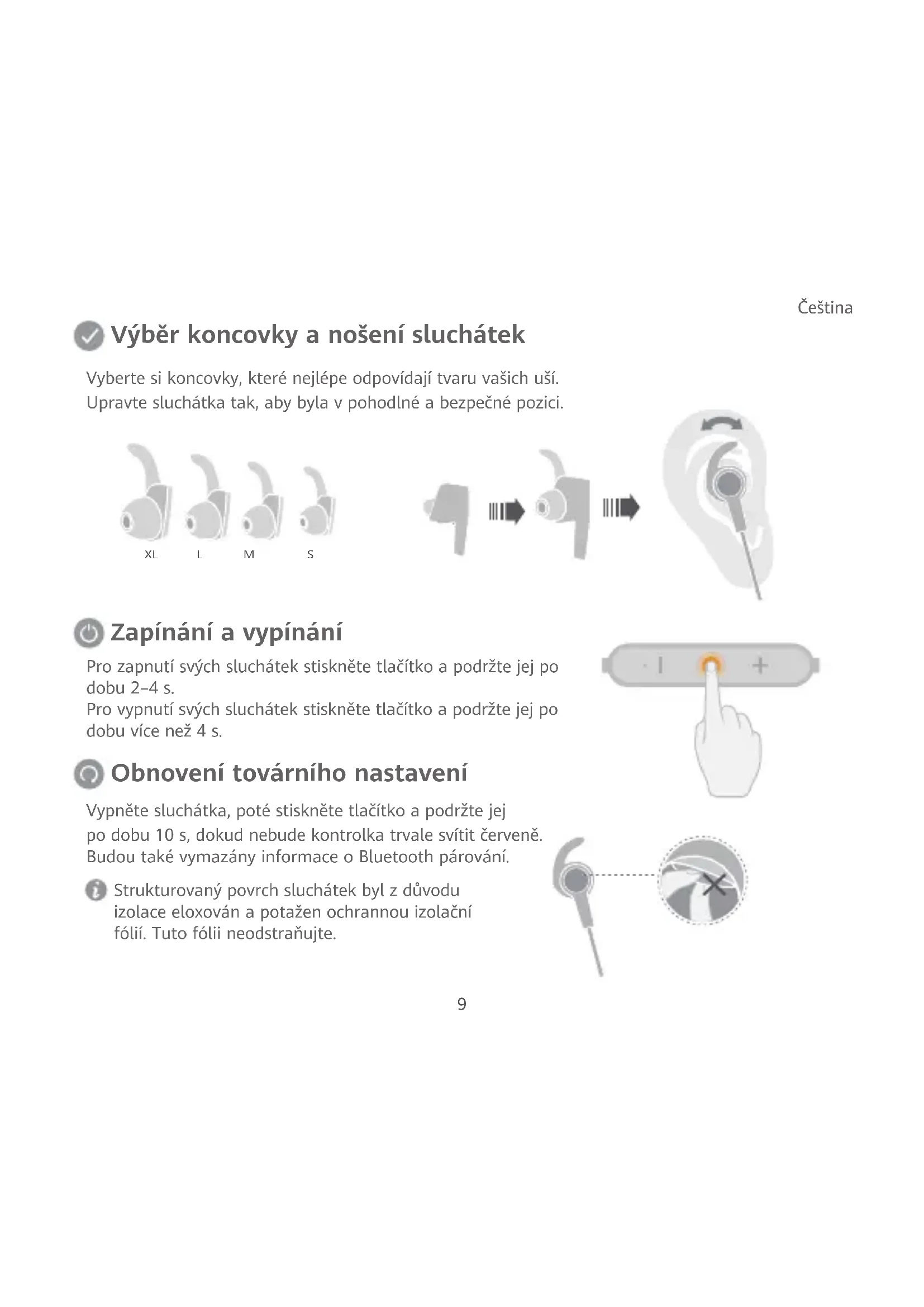 Čeština Pro zapnutí svých sluchátek stiskněte tlačítko apodržte jej po dobu 2–4s. Pro vypnutí svých sluchátek stiskněte tlačítko apodržte jej po dobu více než 4s. Vypněte sluchátka, poté stiskněte tlačítko apodržte jej po dobu 10s, dokud nebude kontrolka trvale svítit červeně. Budou také vymazány informace oBluetooth párování. Strukturovaný povrch sluchátek byl zdůvodu izolace eloxován apotažen ochrannou izolační fólií. Tuto fólii neodstraňujte. L M