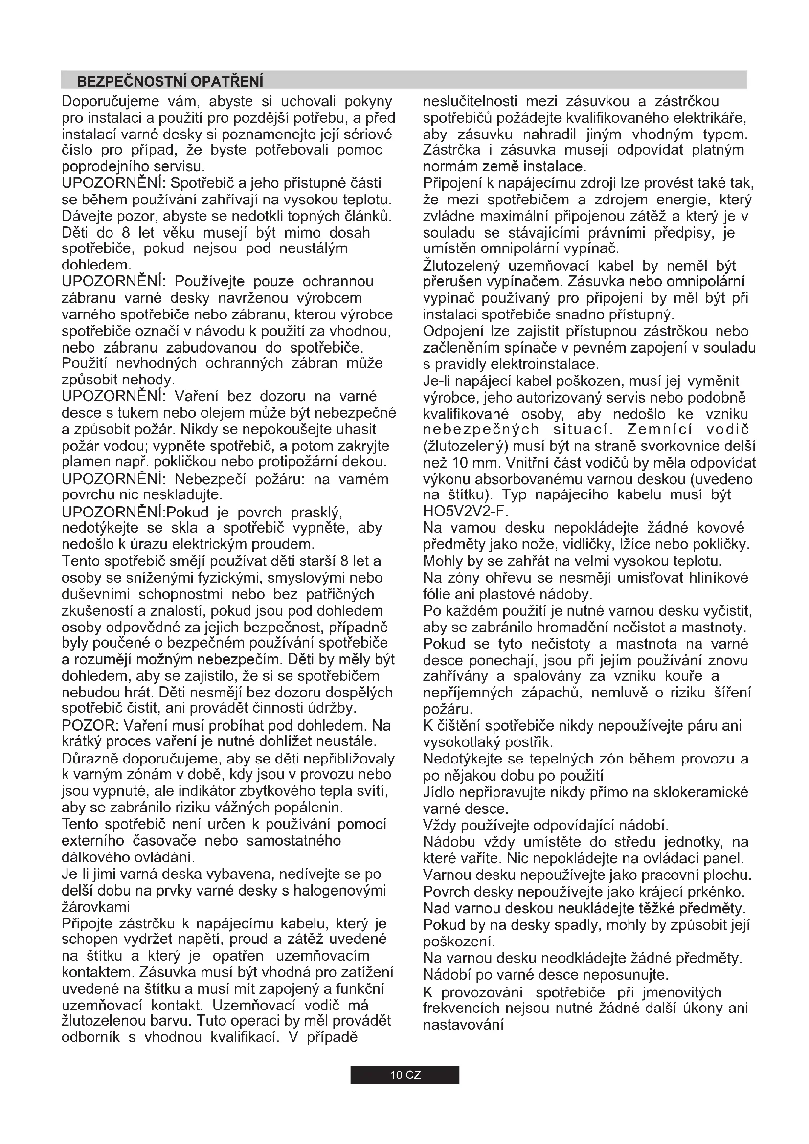 neslučitelnosti mezi zásuvkou a zástrčkou spotřebičů požádejte kvalifikovaného elektrikáře, aby zásuvku nahradil jiným vhodným typem. Zástrčka i zásuvka musejí odpovídat platným normám země instalace. Připojení k napájecímu zdroji lze provést také tak, že mezi spotřebičem a zdrojem energie, který zvládne maximální připojenou zátěž a který je v souladu se stávajícími právními předpisy, je umístěn omnipolární vypínač. Žlutozelený uzemňovací kabel by neměl být přerušen vypínačem. Zásuvka nebo omnipolární vypínač používaný pro připojení by měl být při instalaci spotřebiče snadno přístupný. Odpojení lze zajistit přístupnou zástrčkou nebo začleněním spínače v pevném zapojení v souladu s pravidly elektroinstalace. Je-li napájecí kabel poškozen, musí jej vyměnit výrobce, jeho autorizovaný servis nebo podobně kvalifikované osoby, aby nedošlo ke vzniku nebezpečných situací. Zemnící vodič (žlutozelený) musí být na straně svorkovnice delší než 10 mm. Vnitřní část vodičů by měla odpovídat výkonu absorbovanému varnou deskou (uvedeno na štítku). Typ napájecího kabelu musí být HO5V2V2-F. Na varnou desku nepokládejte žádné kovové předměty jako nože, vidličky, lžíce nebo pokličky. Mohly by se zahřát na velmi vysokou teplotu. Na zóny ohřevu se nesmějí umisťovat hliníkové fólie ani plastové nádoby. Po každém použití je nutné varnou desku vyčistit, aby se zabránilo hromadění nečistot a mastnoty. Pokud se tyto nečistoty a mastnota na varné desce ponechají, jsou při jejím používání znovu zahřívány a spalovány za vzniku kouře a nepříjemných zápachů, nemluvě o riziku šíření požáru. K čištění spotřebiče nikdy nepoužívejte páru ani vysokotlaký postřik. Nedotýkejte se tepelných zón během provozu a po nějakou dobu po použití Jídlo nepřipravujte nikdy přímo na sklokeramické varné desce. Vždy používejte odpovídající nádobí. Nádobu vždy umístěte do středu jednotky, na které vaříte. Nic nepokládejte na ovládací panel. Varnou desku nepoužívejte jako pracovní plochu. Povrch desky nepoužívejte jako krájecí prkénko. Nad varnou deskou neukládejte těžké předměty. Pokud by na desky spadly, mohly by způsobit její poškození. Na varnou desku neodkládejte žádné předměty. Nádobí po varné desce neposunujte. K provozování spotřebiče při jmenovitých frekvencích nejsou nutné žádné další úkony ani nastavováníVarnou desku lze instalovat do pracovní desky, která je z teplu odolného materiálu do 100°C a má tloušťku 25-45 mm. Rozměry výřezu v pracovní desce jsou na obrázku 2. Pokud není volný prostor mezi varnou deskou a skříňkou pod ní, je nutné instalovat vhodné mezidno (dřevěné nebo z podobného materiálu) (obrázek 3). Pokud je varná deska připevněná k nábytku na kterékoli straně, vzdálenost mezi varnou deskou a nábytkem musí být nejméně 15 cm (viz obrázek 4); zatímco vzdálenost mezi varnou deskou a zadní stěnou musí být nejméně 70 mm. Vzdálenost mezi varnou deskou a spotřebičem nad ní (např. odsavač par) musí být nejméně 70 cm (obrázek 4). Kovové předměty v zásuvce mohou v důsledku recirkulace vzduchu dosáhnout vysokých teplot. Doporučuje se proto použít dřevěnou vložku. Důležité - Obrázek 1 znázorňuje aplikaci těsnění. Varná deska se upevňuje pomocí dodaných upevňovacích svorek, pomocí otvorů ve spodní části spotřebiče. Pokud je 60 cm varná deska nad troubou, která není vybavená chladicím ventilátorem, doporučujeme udělat větrací otvory v nábytku pro zajištění správné ventilace. Velikost otvorů musí být nejméně 300 cm2 a umístění podle obrázku 5. Pokud je 75 cm varná deska nad troubou, musí být přidán chladicí Ventilátor. 11 CZ