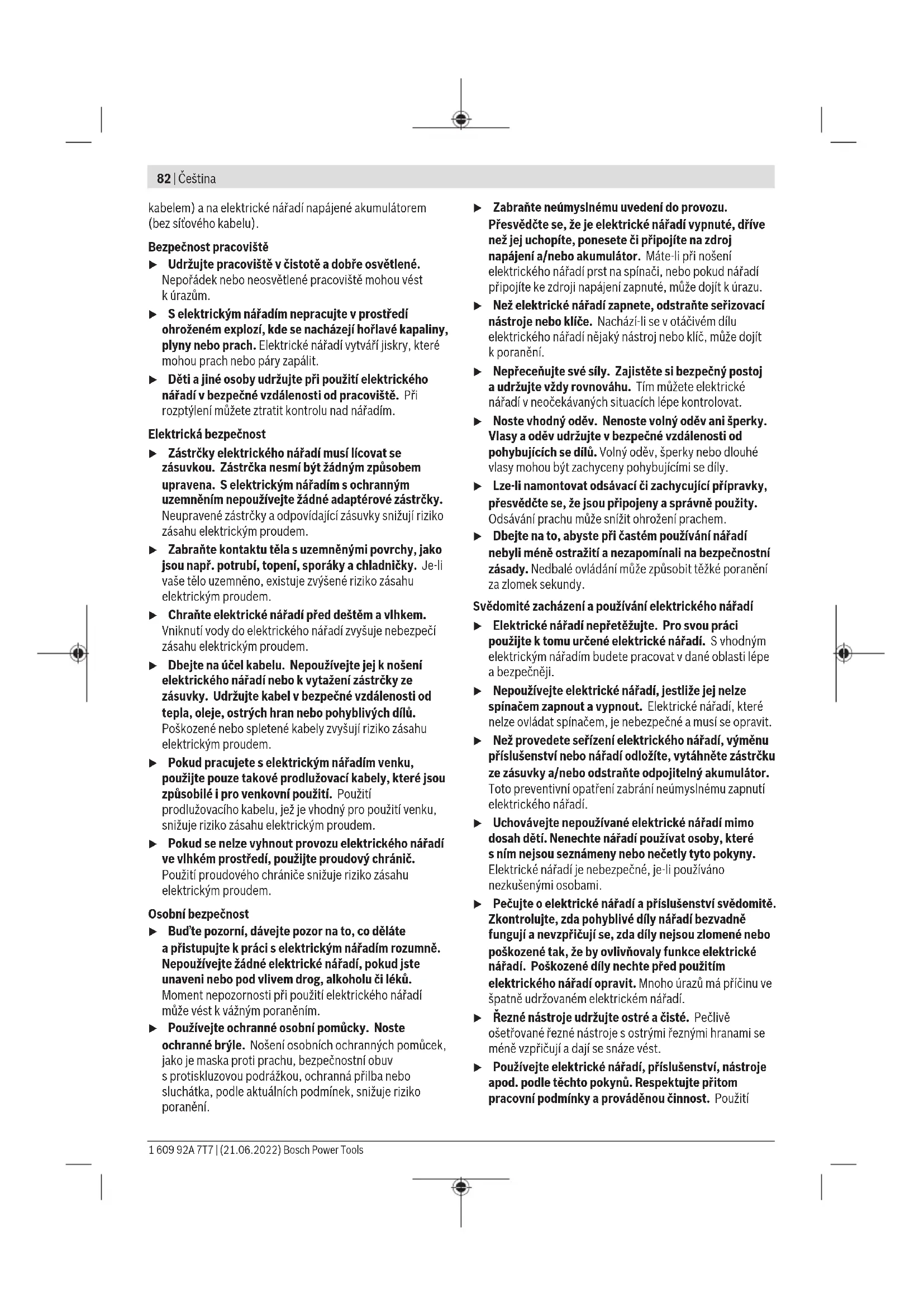 Úroveň vibrací aúroveň hluku, které jsou uvedené vtěchto pokynech, byly změřeny pomocí normované měřicí metody alze je použít pro vzájemné porovnání elektronářadí. Hodí se ipro předběžný odhad zatížení vibracemi ahlukem. Bosch Power Tools 1 609 92A 7T7 | (21.06.2022)84 | Čeština Uvedená úroveň vibrací aúroveň hluku reprezentuje hlavní použití elektronářadí. Pokud se ovšem bude elektronářadí používat pro jiné práce, sjinými nástroji nebo snedostatečnou údržbou, může se úroveň hluku aúroveň vibrací lišit. To může zatížení vibracemi ahlukem po celou pracovní dobu zřetelně zvýšit. Pro přesný odhad zatížení vibracemi ahlukem by měly být zohledněny idoby, kdy je nářadí vypnuté nebo běží, ale ve skutečnosti se nepoužívá. To může zatížení vibracemi ahlukem po celou pracovní dobu výrazně snížit. Stanovte dodatečná bezpečnostní opatření kochraně obsluhy před účinky vibrací, jako je např. údržba elektronářadí anástrojů, udržování teplých rukou, organizace pracovních procesů. Montáž u Před každou prací na elektronářadí vytáhněte zástrčku ze zásuvky. Výměna brusného listu Pro sejmutí brusného papíru (10) ho na straně nazdvihněte astáhněte zbrusného talíře (8). Před nasazením nového brusného papíru odstraňte zbrusného talíře (8) nečistoty aprach, např. štětcem. Povrch brusného talíře (8) je ze suchého zipu, aby bylo možné rychle ajednoduše upevnit brusné papíry se suchým zipem. Pevně přitiskněte brusný papír (10) na spodní stranu brusného talíře (8). Pro zabezpečení optimálního odsávání prachu dbejte na to, aby se otvory vbrusném papíru (10) kryly sotvory vbrusném talíři (8). Volba brusného talíře Podle použití lze elektrické nářadí vybavit brusnými talíři různé tvrdosti: – Brusný talíř zvláště měkký: vhodný pro leštění acitlivé broušení ina klenutých plochách – Brusný talíř měkký: vhodný pro všechny brousicí práce, univerzálně použitelný – Brusný talíř tvrdý: vhodný pro vysoký brusný výkon na rovných plochách Výměna brusného talíře Upozornění: Poškozený brusný talíř (8) ihned vyměňte. Sejměte brusný papír, resp. lešticí nástroj. Úplně vyšroubujte šroub (11) asejměte brusný talíř (8). Nasaďte nový brusný talíř (8) aznovu ručně utáhněte šroub. Upozornění: Unášeče jsou různé pro pady oØ150 apady oØ125. Pady lze namontovat pouze na příslušné vhodné elektronářadí. Upozornění: Při nasazování brusného talíře dbejte na to, aby ozubení unášeče zapadlo do výřezů vbrusném talíři. Upozornění: Poškozený nosič brusného talíře smí měnit pouze autorizovaný zákaznický servis pro elektronářadí Bosch. Odsávání prachu/třísek Prach zmateriálů, jako jsou nátěry sobsahem olova, některé druhy dřeva, minerály akov, může být zdraví škodlivý. Kontakt sprachem nebo vdechnutí mohou upracovníka nebo osob nacházejících se vblízkosti vyvolat alergické reakce a/nebo onemocnění dýchacích cest. Určitý prach, jako dubový nebo bukový prach, je pokládán za karcinogenní, zvláště ve spojení spřídavnými látkami pro ošetření dřeva (chromát, ochranné prostředky na dřevo). Materiál obsahující azbest smějí opracovávat pouze specialisté. – Pokud možno používejte pro daný materiál vhodné odsávání prachu. – Zajistěte dobré větrání pracoviště. – Je doporučeno nosit ochrannou dýchací masku střídou filtruP2. Dodržujte předpisy pro obráběné materiály platné vpříslušné zemi. u Zabraňte hromadění prachu na pracovišti. Prach se může lehce vznítit. Interní odsávání sboxem na prach (viz obrázky C–G) Box na prach (7) nasaďte na vyfukovací hrdlo (12). Otočte ho přitom tak, aby otvory vboxu na prach dosedaly na hroty na vyfukovacím hrdle abox na prach citelně zaskočil. Naplnění boxu na prach (7) lze snadno kontrolovat díky průhledné nádobě. Pro vyprázdnění boxu na prach (7) ho mírně otáčivým pohybem vytáhněte směrem dozadu. Vyšroubujte filtrační vložku (6) avytáhněte ji zboxu na prach (7). Vyprázdněte box na prach. Filtrační vložkou (6) lehce poklepejte o pevný podklad, aby se uvolnil prach. Vyčistěte lamely filtrační vložky (6) měkkým kartáčem. Upozornění: Aby bylo zabezpečeno optimální odsávání prachu, box na prach (7) včas vyprázdněte a pravidelně čistěte filtrační vložku (6). Při práci na svislých plochách držte elektronářadí tak, aby box na prach (7) směřoval dolů. Externí odsávání (viz obrázek H) Nasaďte odsávací hadici (13) na vyfukovací hrdlo (12). Odsávací hadici nasuňte (jak je vyobrazeno na obrázku) na vyfukovací hrdlo tak, aby boční otvory na vyfukovacím hrdle zůstaly volné. Tím se zamezí, aby se elektronářadí během broušení pevně přisálo kobrobku atak se negativně ovlivnila kvalita povrchu obrobku. Připojte odsávací hadici (13) kvysavači (příslušenství). Přehled připojení krůzným vysavačům najdete na konci tohoto návodu. Vysavač musí být vhodný pro broušený materiál. Při odsávání obzvlášť zdraví škodlivého, karcinogenního nebo suchého prachu použijte speciální vysavač. 1 609 92A 7T7 | (21.06.2022) Bosch Power ToolsČeština | 85 Při práci na svislých plochách držte elektronářadí tak, aby odsávací hadice směřovala dolů. Přídavná rukojeť Přídavná rukojeť (1) umožňuje pohodlnou manipulaci aoptimální rozložení síly, především při velkém úběru. Přídavnou rukojeť (1) upevněte šroubem (2) ke krytu. Provoz Uvedení do provozu u Dbejte na správné síťové napětí! Napětí zdroje proudu musí souhlasit súdaji na typovém štítku elektronářadí. Elektronářadí označené 230V smí být provozováno ina 220V. Zapn