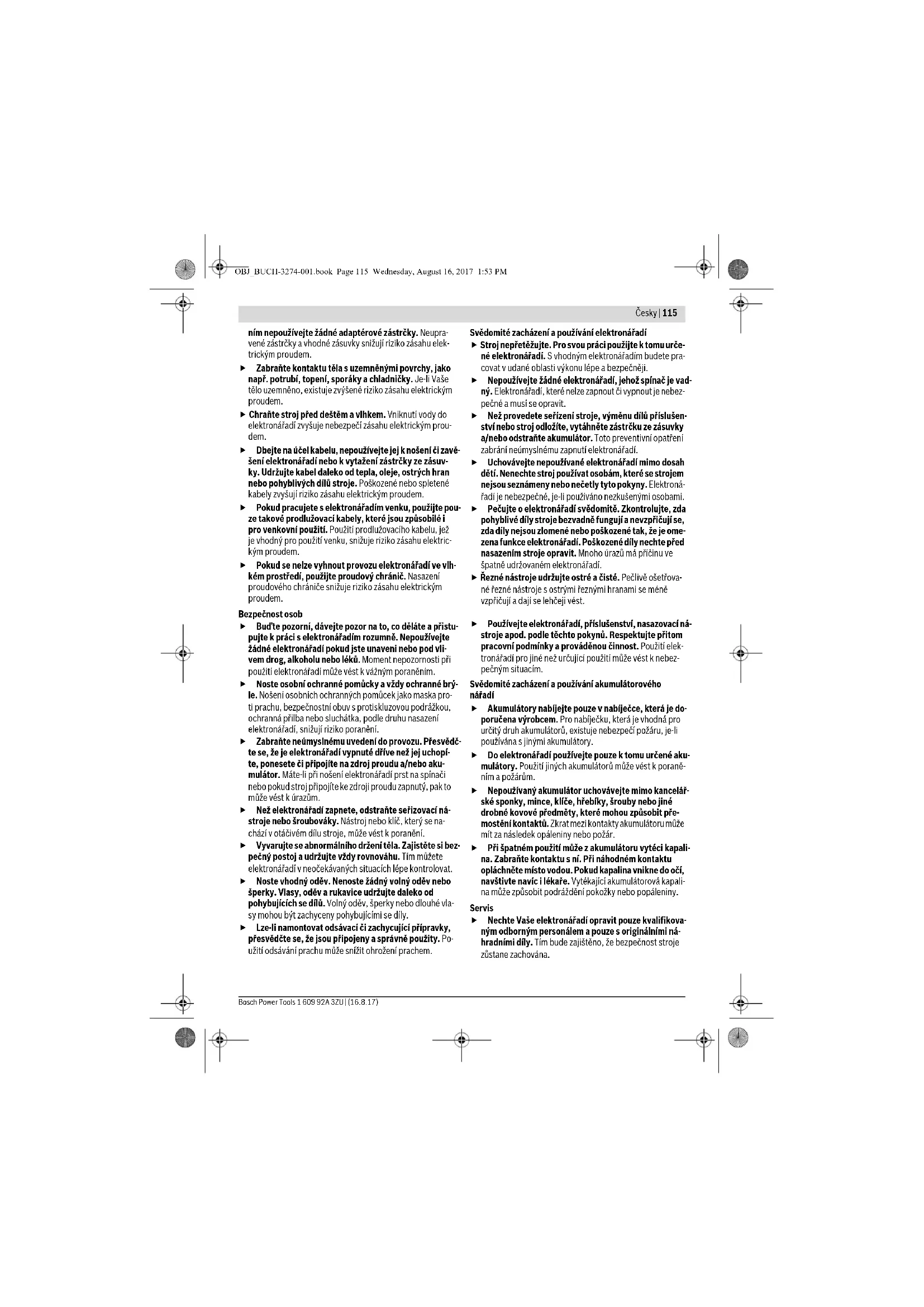 Před řezáním utáhněte nastavení hloubky a úhlu řezu. Pokud se během řezání změní nastavení, může se pilový kotouč vzpříčit a nastat zpětný ráz. Buďte obzvlášť opatrní při řezání do stávajících stěn nebo míst, kam není vidět. Zanořující se pilový kotouč se může při řezání ve skrytých objektech zablokovat a způso- bit zpětný ráz. Funkce spodního ochranného krytu Před každým použitím zkontrolujte, zda se spodní ochranný kryt bezvadně uzavírá. Pilu nepoužívejte, po- kud se spodní ochranný kryt nepohybuje volně a neuza- vře-li se okamžitě. Spodní ochranný kryt nikdy neupev- ňujte nebo nepřivazujte napevno v otevřené poloze. Pokud pila neúmyslně upadne na podlahu, může se spodní ochranný kryt zprohýbat. Otevřte ochranný kryt pomocí páčky pro vytažení zpět a zajistěte, aby se volně pohyboval a nedotýkal se pilového kotouče ani jiných dílů při všech řezných úhlech a hloubkách. Zkontrolujte funkci pružiny spodního ochranného kry- tu. Nechte na pile před použitím provést údržbu, pokud spodní ochranný kryt a pružina nepracují bezvadně. Poškozené díly, lepkavé usazeniny nebo nahromadění třísek brzdí spodní ochranný kryt při práci. Spodní ochranný kryt otevírejte ručně pouze při zvlášt- ních řezech, jako jsou „řezy zanořením a úhlové řezy“. Otevřete spodní ochranný kryt zpětnou páčkou a uvolněte ji, jakmile se pilový kotouč zanoří do obrob- ku. Při veškerém ostatním řezání by měl spodní ochranný kryt pracovat automaticky. Pilu neodkládejte na pracovní stůl nebo podlahu bez to- ho, aby spodní ochranný kryt zakrýval pilový kotouč. Nechráněný, dobíhající pilový kotouč pohybuje pilou proti směru řezání a řeže vše co mu stojí v cestě. Respektujte při tom dobu doběhu pily. OBJ_BUCH-3274-001.book Page 116 Wednesday, August 16, 2017 1:53 PMČesky | 117 Bosch Power Tools 1 609 92A 3ZU | (16.8.17) Doplňková varovná upozornění Nesahejte rukama do výfuku třísek. Můžete se zranit od rotujících dílů. Nepracujte s pilou nad hlavou. Nemáte tak dostatečnou kontrolu nad elektronářadím. Použijte vhodná hledací zařízení k vyhledání skrytých rozvodných vedení nebo přizvěte místní dodavatel- skou společnost. Kontakt s elektrickým vedením může vést k požáru a elektrickému úderu. Poškození plynového vedení může vést k explozi. Proniknutí do vodovodního po- trubí způsobí věcné škody. Elektronářadí neprovozujte stacionárně. Není určeno pro provoz se stolem pily. Nepoužívejte žádné pilové kotouče z rychlořezné oceli HSS. Takové pilové kotouče mohou lehce prasknout. Neřezejte žádné železné kovy. Rozžhavené špony mo- hou vznítit odsávaní prachu. Elektronářadí držte při práci pevně oběma rukama a za- jistěte si bezpečný postoj. Oběma rukama je elektronářa- dí vedeno bezpečněji. Zajistěte obrobek. Obrobek pevně uchycený upínacím přípravkem nebo svěrákem je držen bezpečněji než Vaší rukou. Než jej odložíte, počkejte až se elektronářadí zastaví. Nasazovací nástroj se může vzpříčit a vést ke ztrátě kontro- ly nad elektronářadím. Neotvírejte akumulátor. Existuje nebezpečí zkratu. Chraňte akumulátor před horkem, např. i před trvalým slunečním zářením, ohněm, vodou a vlhkostí. Existuje nebezpečí výbuchu. Při poškození a nesprávném použití akumulátoru mo- hou vystupovat páry. Přivádějte čerstvý vzduch a při potížích vyhledejte lékaře. Páry mohou dráždit dýchací cesty. Používejte akumulátor pouze ve spojení s Vaším elek- tronářadím Bosch. Jen tak bude akumulátor chráněn před nebezpečným přetížením. Špičatými předměty, jako např. hřebíky nebo šroubo- váky, nebo působením vnější síly může dojít k poškození akumulátoru. Uvnitř může dojít ke zkratu a akumulátor může začít hořet, může z něj unikat kouř, mů- že vybouchnout nebo se přehřát. Popis výrobku a specifikací Čtěte všechna varovná upozornění a poky- ny. Zanedbání při dodržování varovných upo- zornění a pokynů mohou mít za následek úraz elektrickým proudem, požár a/nebo těžká po- ranění. Vyklopte prosím odklápěcí stranu se zobrazením stroje a ne- chte tuto stranu během čtení návodu k obsluze otevřenou. Určené použití Elektronářadí je určeno k provádění podélných a příčných řezů do dřeva na pevné opěře s přímým průběhem řezu a se sklonem. S příslušnými pilovými kotouči lze řezat i tenkostěn- né neželezné kovy, např. profily. Opracování železných kovů je nepřípustné. Zobrazené komponenty Číslování zobrazených komponent se vztahuje na zobrazení elektronářadí na grafické straně. 1 Závěsný hák 2 Blokování zapnutí spínače 3 Spínač 4 Rukojeť (izolovaná plocha rukojeti) 5 Odjišťovací tlačítko akumulátoru 6 Akumulátor* 7 Ochranný kryt 8 Přestavitelná páčka pro kyvný ochranný kryt 9 Základová deska 10 Kyvný ochranný kryt 11 Podélný doraz 12 Označení řezu 0° 13 Označení řezu 45° 14 Křídlový šroub podélného dorazu 15 Křídlový šroub předvolby úhlu sklonu 16 Stupnice úhlu sklonu 17 Aretační tlačítko vřetene 18 Přídavná rukojeť (izolovaná plocha rukojeti) 19 Klíč na vnitřní šestihrany 20 Vřeteno pily 21 Unášecí příruba 22 Pilový kotouč* 23 Upínací příruba 24 Upínací šroub s podložkou 25 Označení na ochranném krytu 26 Tlačítko ukazatele stavu nabití 27 Ukazatel stavu nabití akumulátoru 28 Ukazatel kontroly teploty 29 Stupnice hloubky řezu 30 Upínací páčka předvolby hloubky řezu 31 Pár šroubových svěrek* 32 Upevňovací šroub odsávacího adaptéru 33 Odsávací adaptér 34 Odsávací hadice* *Zobrazené nebo popsané příslušenství nepatří k standar