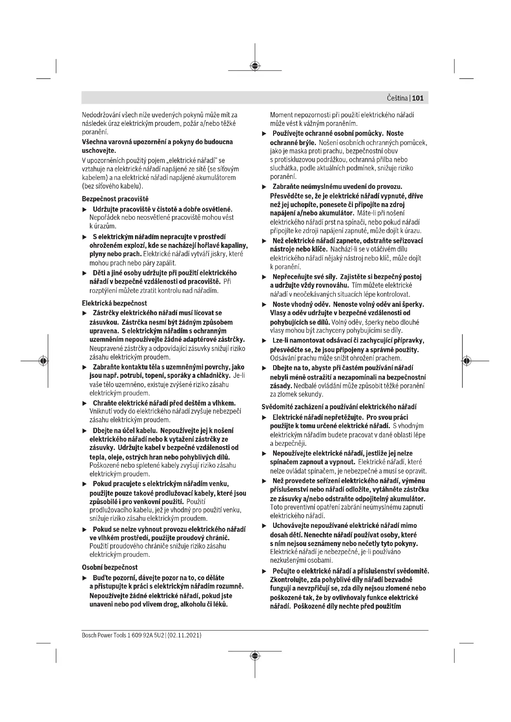 Wysoki zakres prędkości obrotowej – do wiercenia otworów o małych średnicach. Termiczny wyłącznik przeciążeniowy Stosowanego zgodnie z przeznaczeniem elektronarzędzia nie da się przeciążyć. W przypadku zbyt silnego obciążenia lub po przekroczeniu dopuszczalnego zakresu temperatury akumulatora dochodzi do zredukowania prędkości obroto- wej. Elektronarzędzie pracuje z pełną prędkością obrotową dopiero po ponownym osiągnięciu dopuszczalnej tempera- tury akumulatora. Zadziałanie temperaturowego wyłącznika przeciążeniowego sygnalizowane jest zaświeceniem się czerwonej diody LED (11) na elektronarzędziu. Po powrocie akumulatora do do- puszczalnego zakresu temperatur dioda LED (11) gaśnie. Ochrona przed głębokim rozładowaniem Dzięki systemowi elektronicznej ochrony ogniw "Electronic Cell Protection (ECP)" akumulator litowo-jonowy jest zabez- pieczony przed głębokim rozładowaniem. W przypadku roz- ładowania akumulatora układ ochronny odłącza urządzenie: narzędzie przestaje się poruszać. System szybkiego wyłączania (funkcja KickBack Control) System szybkiego wyłączania (funkcja Kick- Back Control) ułatwia kontrolę nad elektro- narzędziem i znacznie zwiększa w ten spo- sób bezpieczeństwo użytkownika. W przy- padku nagłego, nieprzewidzianego obrotu elektronarzę- dzia wokół osi wiertła, elektronarzędzie jest wyłączane. System szybkiego wyłączania sygnalizowany jest miganiem diody LED na elektronarzędziu. W celu ponownego uruchomienia należy zwolnić włącznik/ wyłącznik i włączyć go na nowo. Bosch Power Tools 1 609 92A 5U2 | (02.11.2021)100 | Čeština u Przy uszkodzonej funkcji KickBack Control elektrona- rzędzia nie będzie można włączyć. Naprawę elektrona- rzędzia należy zlecić jedynie wykwalifikowanym fa- chowcom i wykonać ją tylko przy użyciu oryginalnych części zamiennych. Wskazówki dotyczące pracy u Przed przyłożeniem elektronarzędzia do wkrętu/śru- by należy je wyłączyć. Obracające się narzędzia robocze mogą ześlizgnąć się z nakrętki lub z łba śruby. Do zdejmowania końcówek wkręcających oraz uniwersalne- go uchwytu na końcówki, można posłużyć się narzędziem. Zaczep do paska Za pomocą zaczepu można wygodnie zawiesić elektronarzę- dzie, np. na pasku. Dzięki temu obie ręce są wolne, a elektro- narzędzie znajduje się w zasięgu ręki. Kolorowy znacznik (zob. rys. D) Za pomocą kolorowego znacznika (6) można w indywidualny sposób oznaczyć elektronarzędzie. Konserwacja i serwis Konserwacja i czyszczenie u Przed przystąpieniem do jakichkolwiek prac przy elektronarzędziu (np. prace konserwacyjne, wymiana osprzętu itp.), a także na czas transportu i przechowy- wania należy wyjąć z niego akumulator. Niezamierzone uruchomienie włącznika/wyłącznika grozi skaleczeniem. u Utrzymywanie urządzenia i szczelin wentylacyjnych w czystości gwarantuje prawidłową i bezpieczną pracę. Obsługa klienta oraz doradztwo dotyczące użytkowania Ze wszystkimi pytaniami, dotyczącymi naprawy ikonserwa- cji nabytego produktu oraz dostępu do części zamiennych, prosimy zwracać się do punktów obsługi klienta. Rysunki techniczne oraz informacje o częściach zamiennych można znaleźć pod adresem: www.bosch-pt.com Nasz zespół doradztwa dotyczącego użytkowania odpowie na wszystkie pytania związane z produktami firmy Bosch oraz ich osprzętem. Przy wszystkich zgłoszeniach oraz zamówieniach części za- miennych konieczne jest podanie 10‑cyfrowego numeru ka- talogowego, znajdującego się na tabliczce znamionowej pro- duktu. Polska Robert Bosch Sp. z o.o. Serwis Elektronarzędzi Ul. Jutrzenki 102/104 02-230 Warszawa Na www.serwisbosch.com znajdą Państwo wszystkie szcze- góły dotyczące usług serwisowych online. Tel.: 22 7154450 Faks: 22 7154440 E-Mail: bsc@pl.bosch.com www.bosch-pt.pl Pozostałe adresy serwisów znajdują się na stronie: www.bosch-pt.com/serviceaddresses Transport Załączone w dostawie akumulatory litowo-jonowe podlegają wymaganiom przepisów dotyczących towarów niebezpiecz- nych. Akumulatory mogą być transportowane drogą lądową przez użytkownika, bez konieczności spełnienia jakichkol- wiek dalszych warunków. W przypadku przesyłki przez osoby trzecie (np. transport drogą powietrzną lub za pośrednictwem firmy spedycyjnej) należy dostosować się do szczególnych wymogów dotyczą- cych opakowania i oznakowania towaru. W takim wypadku podczas przygotowywania towaru do wysyłki należy skonsul- tować się z ekspertem ds. towarów niebezpiecznych. Akumulatory można wysyłać tylko wówczas, gdy ich obudo- wa nie jest uszkodzona. Odsłonięte styki należy zakleić, a akumulator zapakować wtaki sposób, aby nie mógł on się poruszać (przesuwać) w opakowaniu. Należy wziąć też pod uwagę ewentualne inne przepisy prawa krajowego. Utylizacja odpadów Elektronarzędzia, akumulatory, osprzęt i opa- kowanie należy oddać do powtórnego przetwo- rzenia zgodnego z obowiązującymi przepisami w zakresie ochrony środowiska. Elektronarzędzia i akumulatora/baterii nie wol- no wyrzucać do odpadów domowych! Tylko dla krajów UE: Zgodnie z europejską dyrektywą 2012/19/UE niezdatne do użytku elektronarzędzia, a zgodnie z europejską dyrektywą 2006/66/WE uszkodzone lub zużyte akumulatory/baterie, należy zbierać osobno i doprowadzić do ponownego prze- tworzenia zgodnie z przepisami ochrony środowiska. Akumulatory/baterie: Li-Ion: Prosimy postępować zgodnie ze wskazówkami umieszczony- mi w rozdziale Transport (zob. „Transport“, Strona100). Čeština Bezpečnostní upozornění Obecné bezpečnostní pokyny pro elektrické nářadí VÝSTRAHA Prostudujte si všechny bezpečnostní výstrahy, pokyny, ilustrace aspecifikace ktomuto elektrickému nářadí. 1 609 92A 5U2 | (02.11.2021) Bosch Power ToolsČeština | 101 Nedodržování všech níže uvedených pokynů může mít za následek úraz elektrickým pr