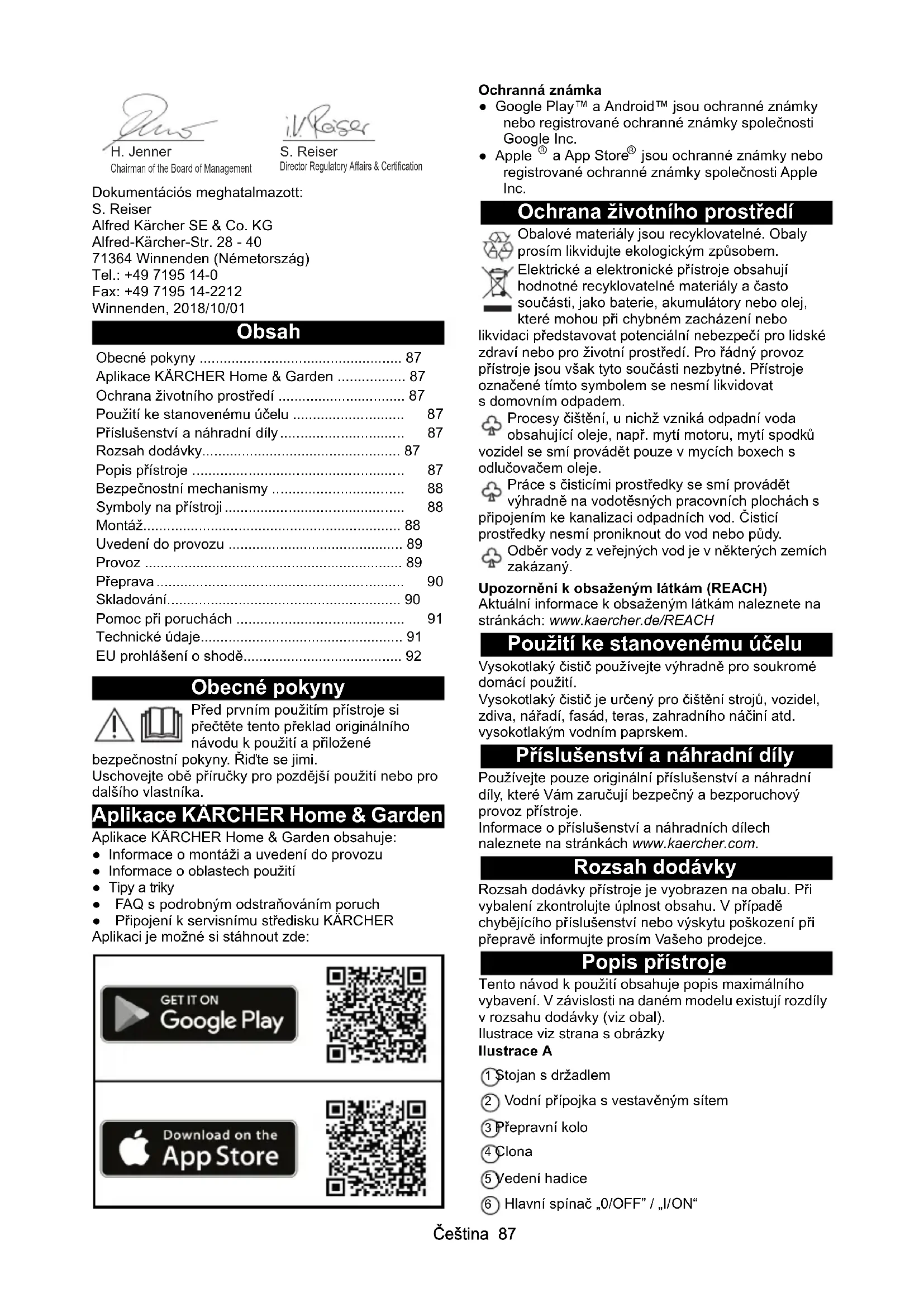 dB(A) 92Čeština 87 Dokumentációs meghatalmazott: S. Reiser Alfred Kärcher SE & Co. KG Alfred-Kärcher-Str. 28 - 40 71364 Winnenden (Németország) Tel.: +49 7195 14-0 Fax: +49 7195 14-2212 Winnenden, 2018/10/01 Obsah Obecné pokyny Před prvním použitím přístroje si přečtěte tento překlad originálního návodu k použití a přiložené bezpečnostní pokyny. Řiďte se jimi. Uschovejte obě příručky pro pozdější použití nebo pro dalšího vlastníka. Aplikace KÄRCHER Home & Garden Aplikace KÄRCHER Home & Garden obsahuje: ● Informace o montáži a uvedení do provozu ● Informace o oblastech použití ● Tipy a triky ● FAQ s podrobným odstraňováním poruch ● Připojení k servisnímu středisku KÄRCHER Aplikaci je možné si stáhnout zde: Ochranná známka ● Google Play™ a Android™ jsou ochranné známky nebo registrované ochranné známky společnosti Google Inc. ● Apple