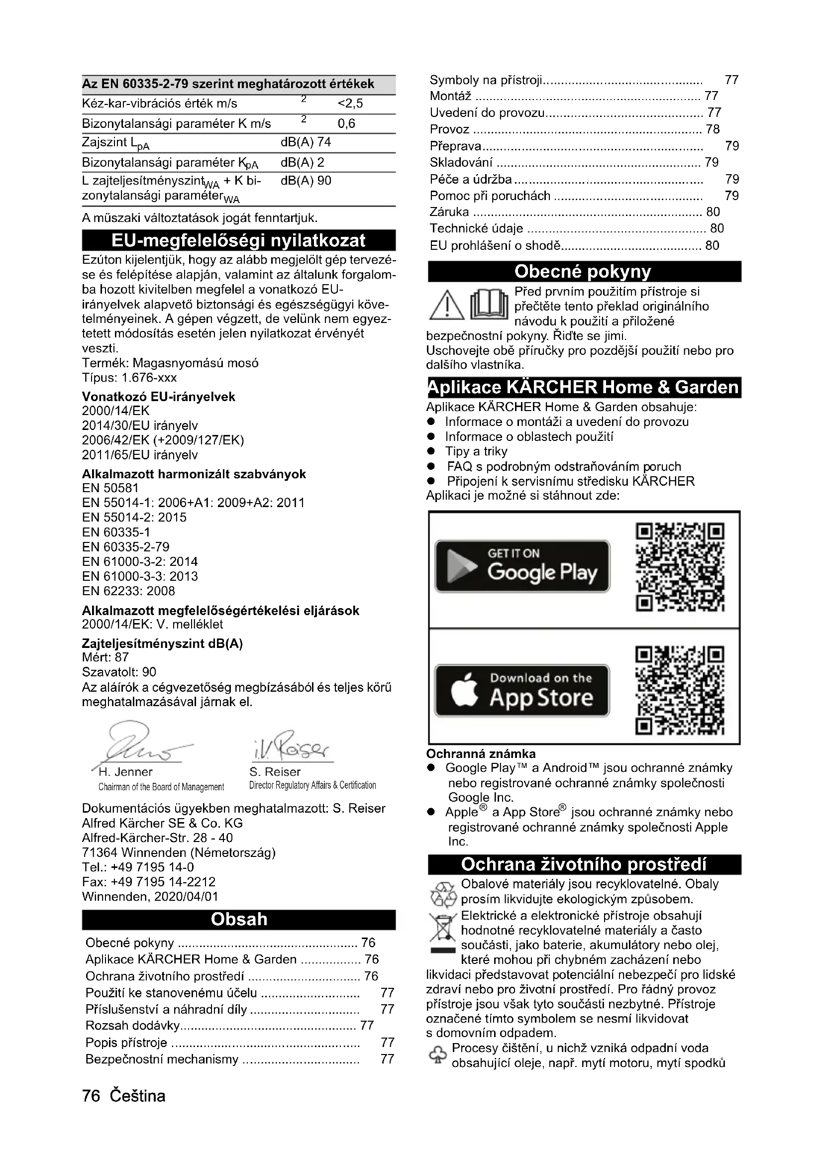 se na ní nenacházejí místa zlomu. Záruka V každé zemi platí záruční podmínky vydané naší příslušnou odbytovou společností. Případné závady Vašeho přístroje odstraníme během záruční lhůty bezplatně, pokud jsou zaviněny vadou materiálu nebo výrobní vadou. V záručním případě se prosím obraťte s dokladem o koupi na Vašeho prodejce nebo na nejbližší autorizované servisní středisko. (Adresa viz zadní stranu) Technické údaje Technické změny vyhrazeny. EU prohlášení o shodě Prohlašujeme tímto, že níže uvedený stroj na základě svého provedení a druhu konstrukce, jakož i v provedení námi uváděném na trh, vyhovuje příslušným základním bezpečnostním a zdravotním požadavkům podle směrnic EU. V případě provedení námi neschválené změny stroje ztrácí toto prohlášení svoji platnost. Výrobek: Vysokotlaký čistič Typ: 1.676-xxx Příslušné směrnice EU 2000/14/ES 2014/30/EU 2006/42/ES (+2009/127/ES) 2011/65/EU Aplikované harmonizované normy EN 50581 EN 55014-1: 2006+A1: 2009+A2: 2011 EN 55014-2: 2015 EN 60335-1 EN 60335-2-79 EN 61000-3-2: 2014 EN 61000-3-3: 2013 EN 62233: 2008 Použitý postup posouzení shody 2000/14/ES: Příloha V Hladina akustického výkonu dB(A) Naměřeno: 87 Zaručeno: 90 Níže podepsaní jednají z pověření a se zplnomocněním představenstva společnosti. Elektrické připojení Napětí V 220-240 Fáze ~ 1 Kmitočet Hz 50-60 Odběr proudu A 6 Krytí IPX5 Třída krytí II Síťové jištění (se zpožděnou reakcí) A 10 Vodní přípojka Přívodní tlak (max.) MPa 1,2 Vstupní teplota (max.) °C 40 Vstupní množství (min.) l/min 8 Výkonnostní údaje přístroje Provozní tlak MPa 8 Max. přípustný tlak MPa 12 Čerpané množství, voda l/min 5,5 Čerpané množství, maximální l/min 6,3 Čerpané množství, čisticí prostředek l/min 0,3 Reaktivní síla vysokotlaké pistole N 12 Rozměry a hmotnosti Typická provozní hmotnost kg 5,4 Délka mm 297 Šířka mm 280 Výška mm 677 Zjištěné hodnoty podle EN 60335-2-79 Hodnota vibrací rukou/paží m/s