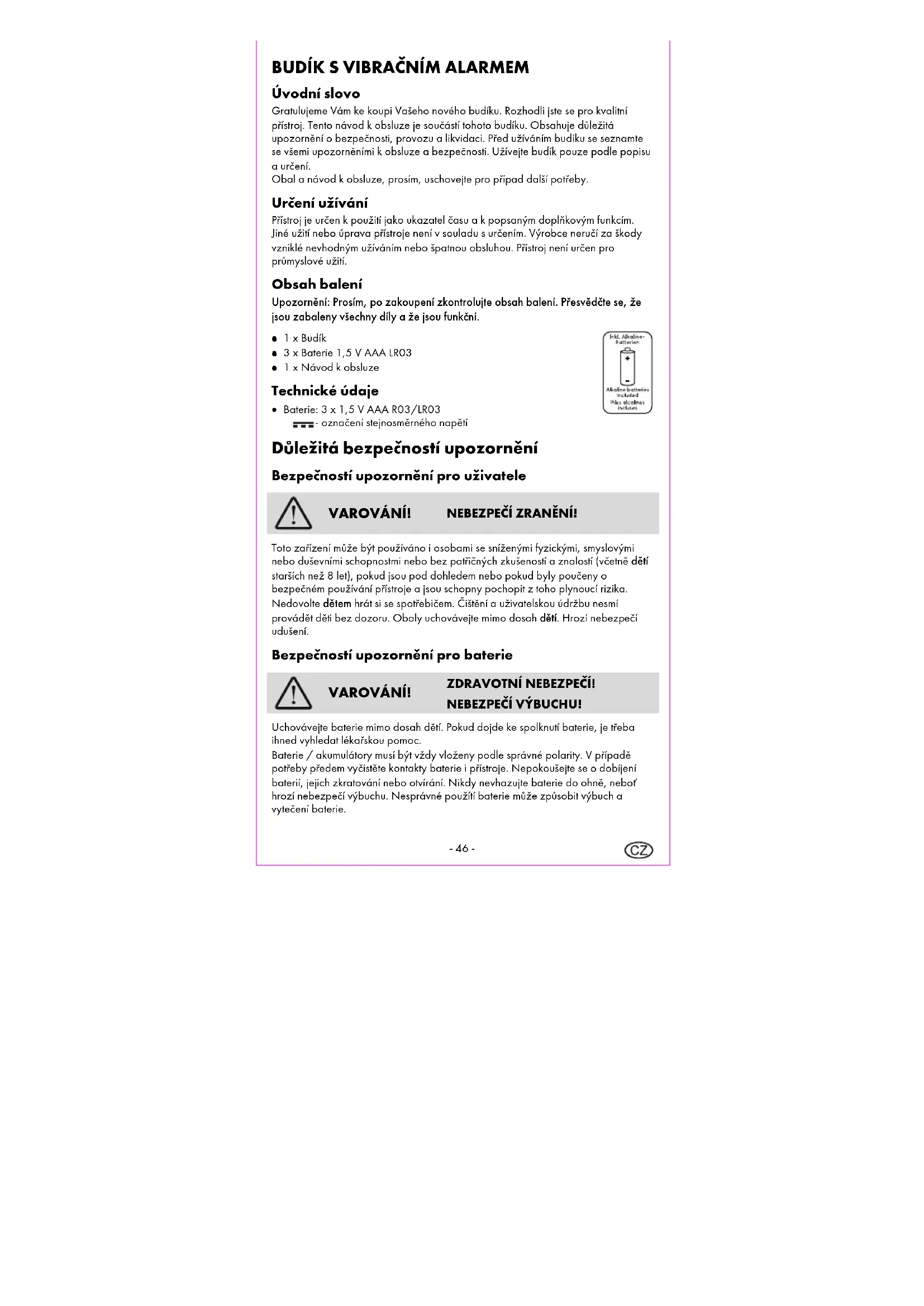 VAROVÁNÍ! ZDRAVOTNÍ NEBEZPEČÍ! NEBEZPEČÍ VÝBUCHU! Uchovávejte baterie mimo dosah dětí. Pokud dojde ke spolknutí baterie, je třeba ihned vyhledat lékařskou pomoc. Baterie / akumulátory musí být vždy vloženy podle správné polarity. V případě potřeby předem vyčistěte kontakty baterie i přístroje. Nepokoušejte se o dobíjení baterií, jejich zkratování nebo otvírání. Nikdy nevhazujte baterie do ohně, neboť hrozí nebezpečí výbuchu. Nesprávné použítí baterie může způsobit výbuch a vytečení baterie.