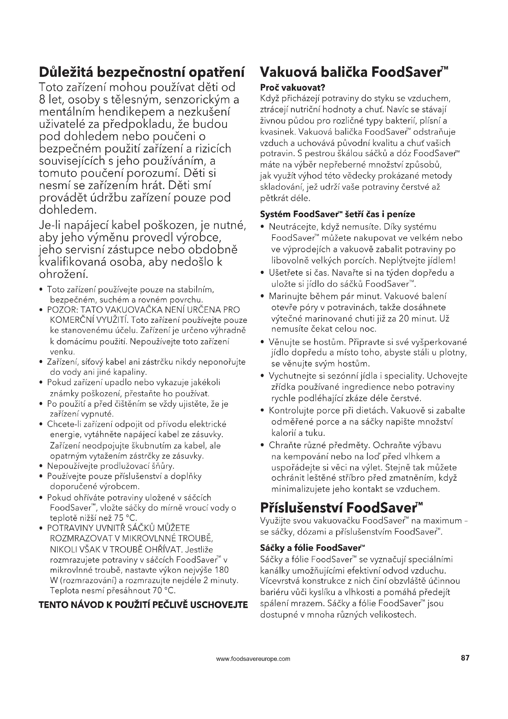 Rady a tipy pro skladování Vakuové balení a bezpečnost potravin Při vakuovém balení se odsaje většina vzduchu z nádoby a tím se prodlouží životnost skladovaných potravin. Nedochází totiž k tak výrazné oxidaci, která negativně ovlivňuje nutriční hodnoty potravin, jejich aroma, chuť a celkovou kvalitu. Odstraněním vzduchu rovněž zpomalíte množení mikroorganismů, které by za určitých okolností mohly způsobit problémy: Abyste bezpečně uchovali potraviny, musíte je skladovat při nízkých teplotách. Jestliže potraviny uchováte při teplotě 4°C a nižší, výrazně tím omezíte množení mikroorganismů. Při zmrazení na teplotu −17 °C mikroorganismy nezabijete, ale zastavíte jejich růst. Chcete-li potraviny podléhající zkáze uchovat na dlouhou dobu, vakuově je zabalte a zmrazte. Jakmile je později rozmrazíte, uchovávejte je v chladničce. Mějte na paměti, že vakuové balení NENAHRAZUJE konzervování a nemůže zcela zamezit zkažení potravin. Pouze pomáhá zpomalit kvalitativní změny. Je těžké předvídat, jak dlouho si vakuované potraviny uchovají veškerou svou chuť, vzhled a strukturu, neboť to závisí na jejich stáří a stavu v den vakuového balení. Důležité: Vakuové balení NENAHRAZUJE mrazení potravin ani jejich uchovávání v chladničce. Veškeré potraviny podléhající zkáze a vyžadující skladování v chladničce musíte po vakuovém zabalení uchovat v chladničce nebo zamrazit. Abyste se vyhnuli zažívacím obtížím, nepoužívejte znovu sáčky, které jste již dříve použili k uchování syrového masa, syrových ryb nebo mastných potravin. Stejně tak nepoužívejte sáčky, které jste ohřívali v mikrovlnné troubě nebo vroucí vodě. Jak rozmrazovat a ohřívat vakuově balené potraviny Potraviny vždy rozmrazujte v chladničce nebo mikrovlnné troubě – potraviny podléhající zkáze nikdy nerozmrazujte při pokojové teplotě. Potraviny uvnitř sáčků můžete rozmrazovat v mikrovlnné troubě, nikoli však v troubě ohřívat. Jestliže rozmrazujete potraviny v sáčcích FoodSaver