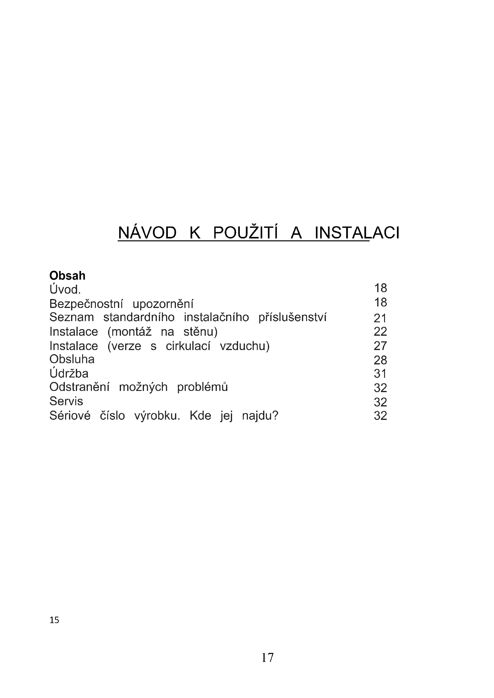 NÁVOD K POUŽITÍ A INSTALACI Obsah Úvod. Bezpečnostní upozornění Seznam standardního instalačního příslušenství Instalace (montáž na stěnu) Instalace (verze s cirkulací vzduchu) Obsluha Údržba Odstranění možných problémů Servis Sériové číslo výrobku. Kde jej najdu?