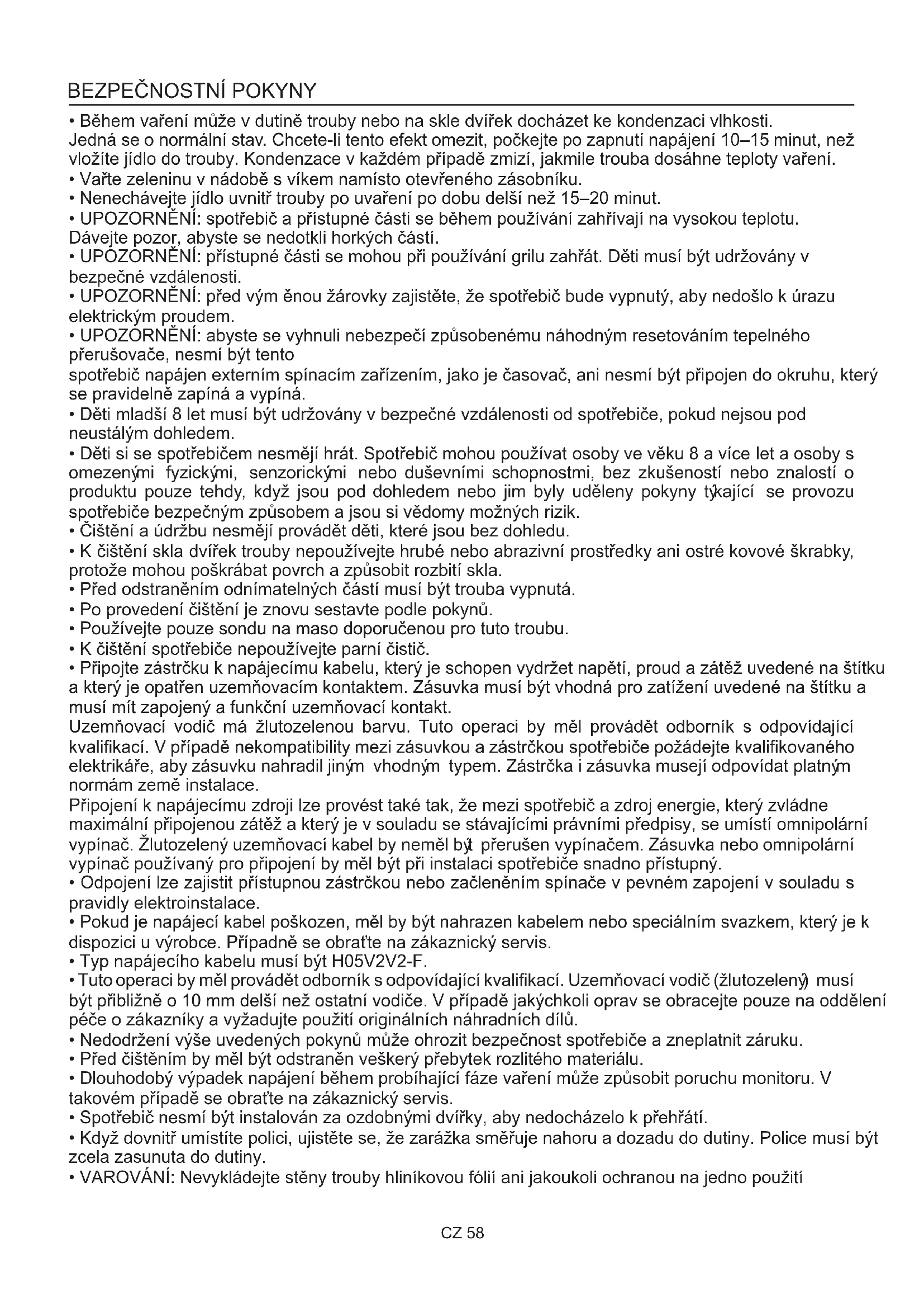 - Nedodržení výše uvedených pokynů může ohrozit bezpečnost spotřebiče a zneplatnit záruku.