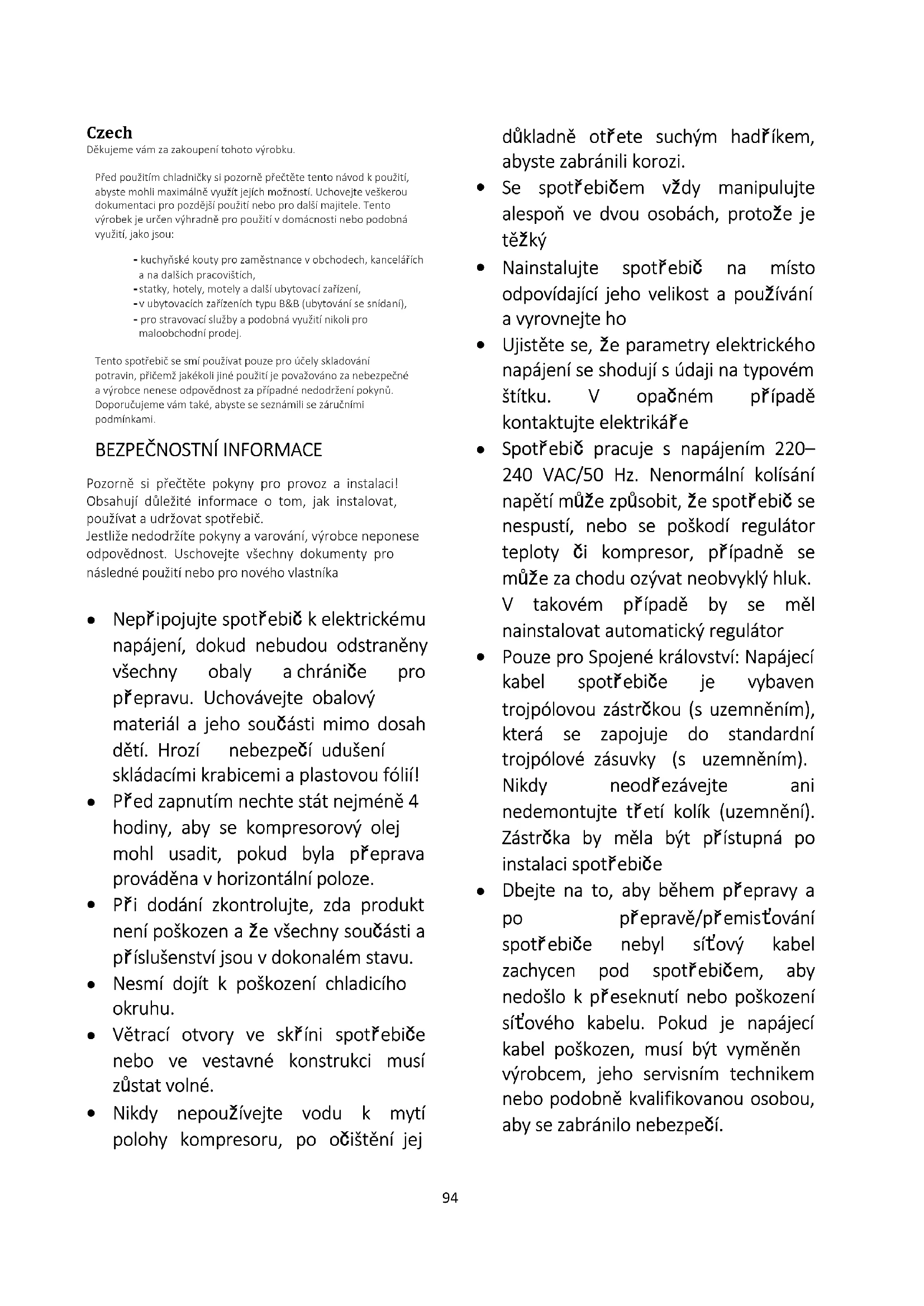 Czech Děkujeme vám za zakoupení tohoto výrobku. Před použitím chladničky si pozorně přečtěte tento návod k použití, abyste mohli maximálně využít jejích možností. Uchovejte veškerou dokumentaci pro pozdější použití nebo pro další majitele. Tento výrobek je určen výhradně pro použití v domácnosti nebo podobná využití, jako jsou: - kuchyňské kouty pro zaměstnance v obchodech, kancelářích a na dalších pracovištích, - statky, hotely, motely a další ubytovací zařízení, - v ubytovacích zařízeních typu B&B (ubytování se snídaní), - pro stravovací služby a podobná využití nikoli pro maloobchodní prodej. Tento spotřebič se smí používat pouze pro účely skladování potravin, přičemž jakékoli jiné použití je považováno za nebezpečné a výrobce nenese odpovědnost za případné nedodržení pokynů. Doporučujeme vám také, abyste se seznámili se záručními podmínkami.
