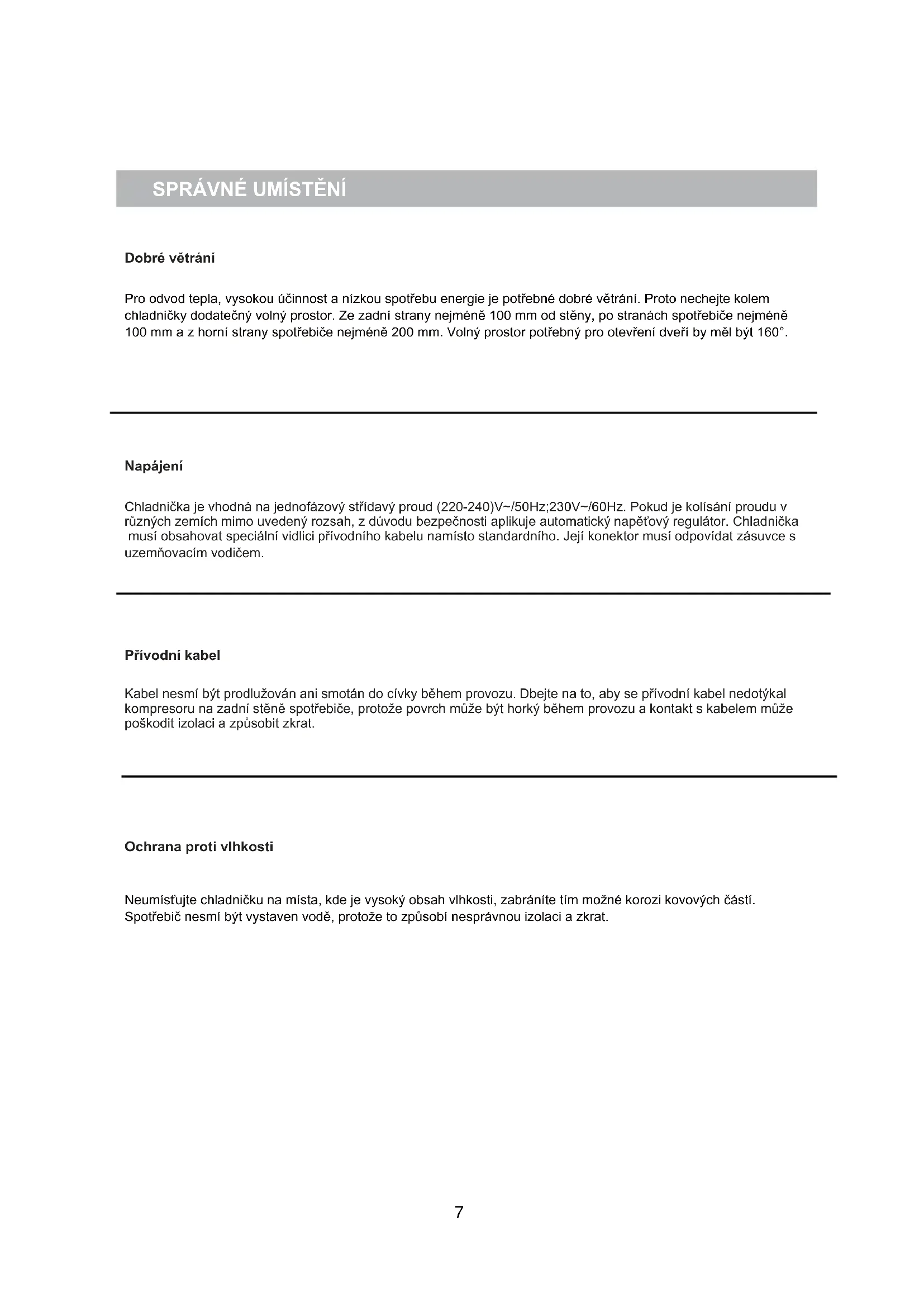 Ochrana proti vlhkosti Neumísujte chladniku na místa, kde je vysoký obsah vlhkosti, zabráníte tím možné korozi kovových ástí. Spotebi nesmí být vystaven vod, protože to zpsobí nesprávnou izolaci a zkrat.