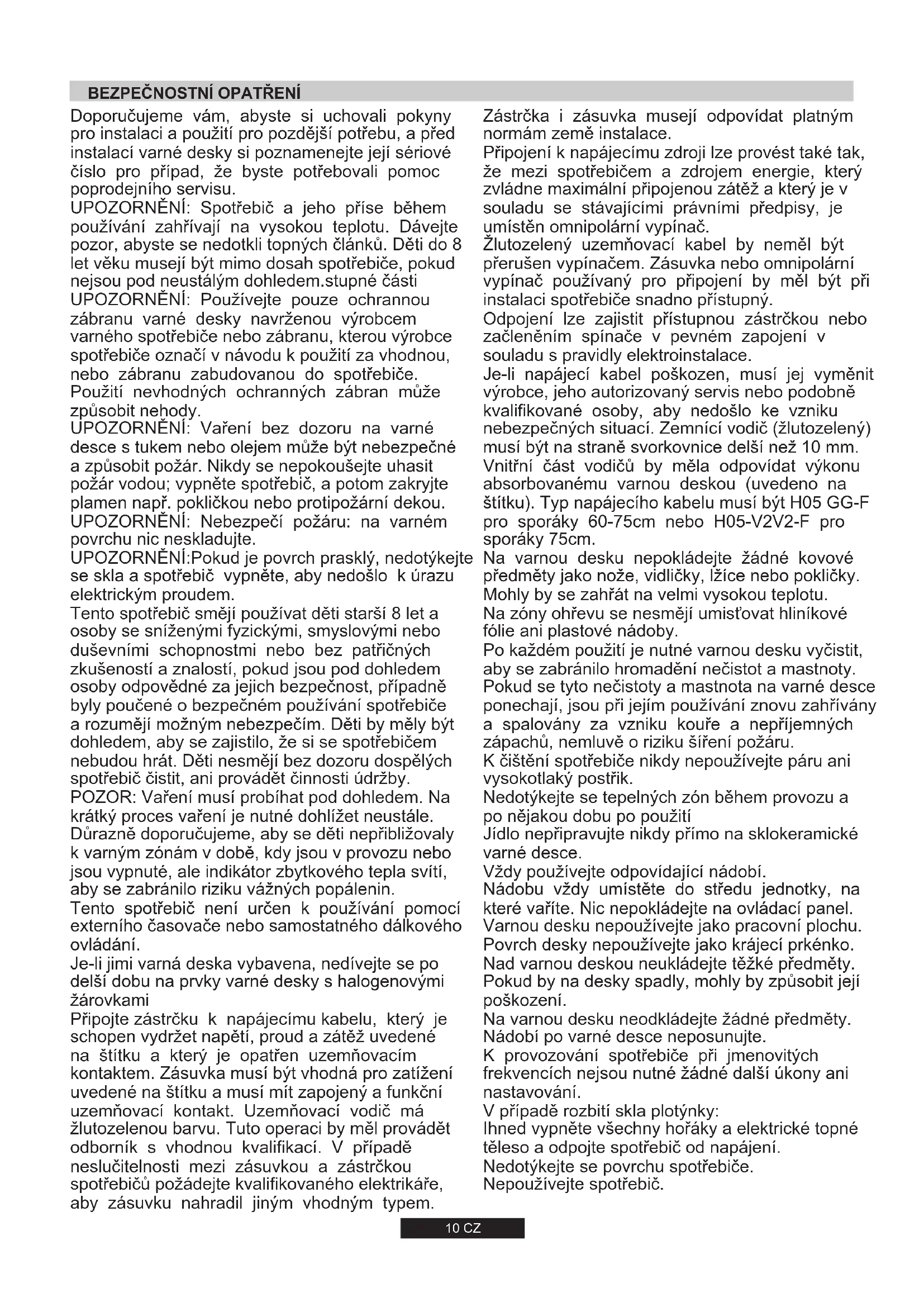 Zkontrolujte data na výrobním štítku, na vnější straně přístroje, pro kontrolu, zda napětí odpovídá napětí elektrické sítě. Před připojením zkontrolujte uzemnění. Tento spotřebič musí být uzemněný. Pokud tuto podmínku nesplníte, výrobce nenese žádnou odpovědnost za poškození spotřebiče nebo úrazy osob. Pokud přívodní kabel není vybavený zástrčkou, připojte vhodnou zástrčku podle údajů na výrobním štítku. Uzemňovací systém je barevně označený žlutozelenou. Zástrčka musí zůstat i po instalaci snadno přístupná. Pokud je varná deska připojená přímo k elektrické síti, musíte instalovat odpojovací zařízení. Pokud se poškodí přívodní kabel, musí jej vyměnit kvalifikovaný servisní technik, aby se zabránilo možnému nebezpečí. Uzemňovací vodič (žlutozelený) musí být nejméně o 10 mm delší než živý a neutrální vodič.Použijte vhodný kabel podle parametrů výkonu trouby. Zkontrolujte výrobní štítek a ujistěte se, zda je přívodní kabel typu 3x0.75 mm² H05 GG-F pro sporáky 60-75cm nebo H05-V2V2-F pro sporáky 75cm. Živý Uzemnění Neutrální