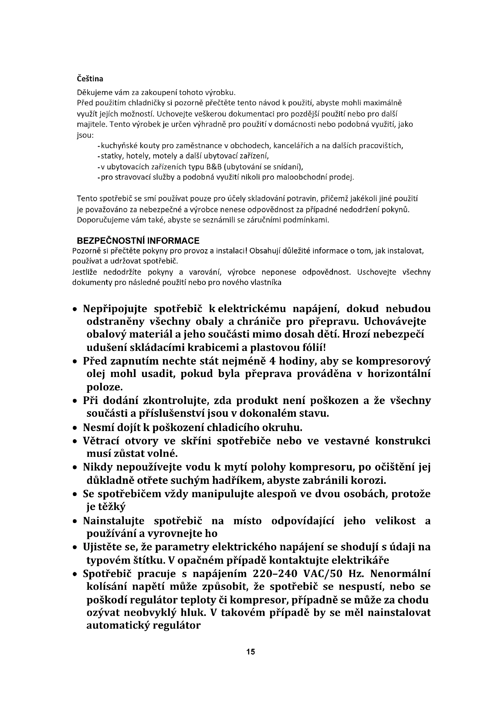 For further information about the product, please consult https://eprel.ec.europa.eu/ or scan the QR on the energy label supplied with the appliance15 Čeština Děkujeme vám za zakoupení tohoto výrobku. Před použitím chladničky si pozorně přečtěte tento návod k použití, abyste mohli maximálně využít jejích možností. Uchovejte veškerou dokumentaci pro pozdější použití nebo pro další majitele. Tento výrobek je určen výhradně pro použití v domácnosti nebo podobná využití, jako jsou: - kuchyňské kouty pro zaměstnance v obchodech, kancelářích a na dalších pracovištích, - statky, hotely, motely a další ubytovací zařízení, - v ubytovacích zařízeních typu B&B (ubytování se snídaní), - pro stravovací služby a podobná využití nikoli pro maloobchodní prodej. Tento spotřebič se smí používat pouze pro účely skladování potravin, přičemž jakékoli jiné použití je považováno za nebezpečné a výrobce nenese odpovědnost za případné nedodržení pokynů. Doporučujeme vám také, abyste se seznámili se záručními podmínkami.