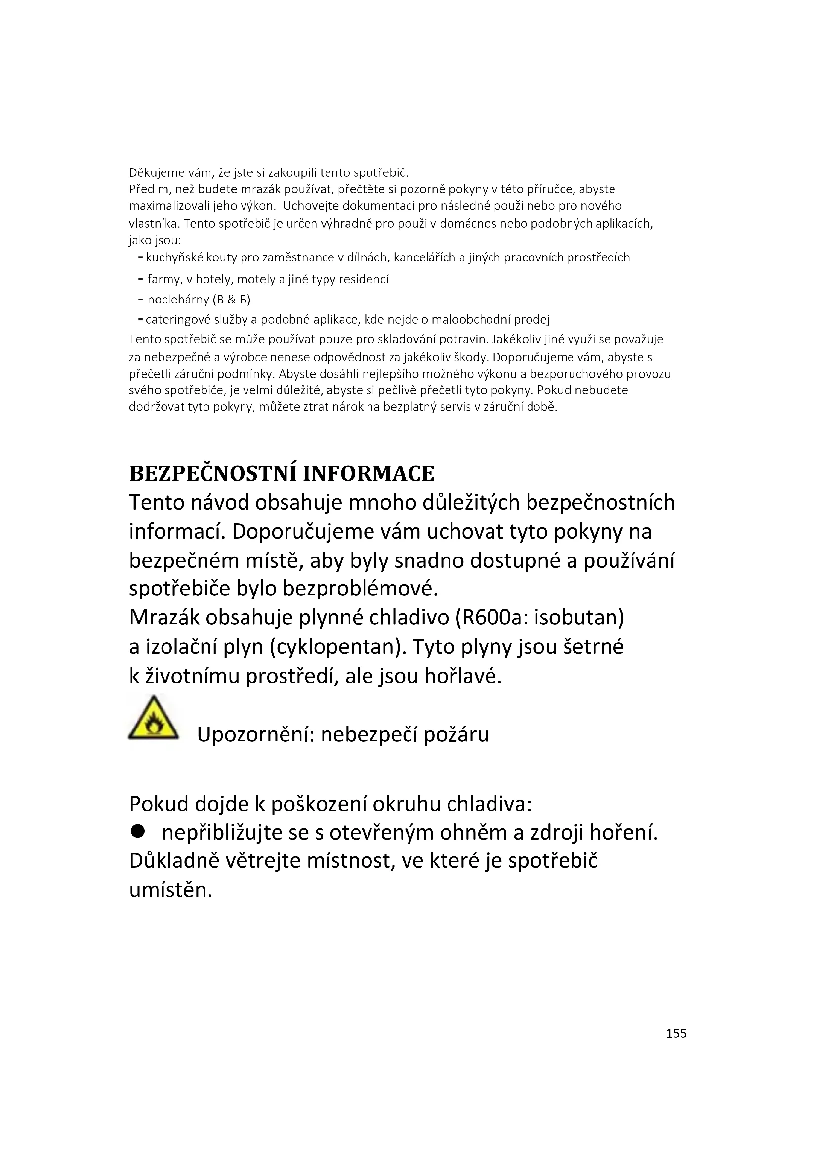 - ŘEŠENÍ PROBLÉMŮ 55 Děkujeme vám, že jste si zakoupili tento spotřebič. Před tím, než budete mrazák používat, přečtěte si pozorně pokyny v této příručce, abyste maximalizovali jeho výkon. Uchovejte dokumentaci pro následné použití nebo pro nového vlastníka. Tento spotřebič je určen výhradně pro použití v domácnosti nebo podobných aplikacích, jako jsou: - kuchyňské kouty pro zaměstnance v dílnách, kancelářích a jiných pracovních prostředích - farmy, v hotely, motely a jiné typy residencí - noclehárny (B & B) - cateringové služby a podobné aplikace, kde nejde o maloobchodní prodej Tento spotřebič se může používat pouze pro skladování potravin. Jakékoliv jiné využití se považuje za nebezpečné a výrobce nenese odpovědnost za jakékoliv škody. Doporučujeme vám, abyste si přečetli záruční podmínky. Abyste dosáhli nejlepšího možného výkonu a bezporuchového provozu svého spotřebiče, je velmi důležité, abyste si pečlivě přečetli tyto pokyny. Pokud nebudete dodržovat tyto pokyny, můžete ztratit nárok na bezplatný servis v záruční době. p. 1661