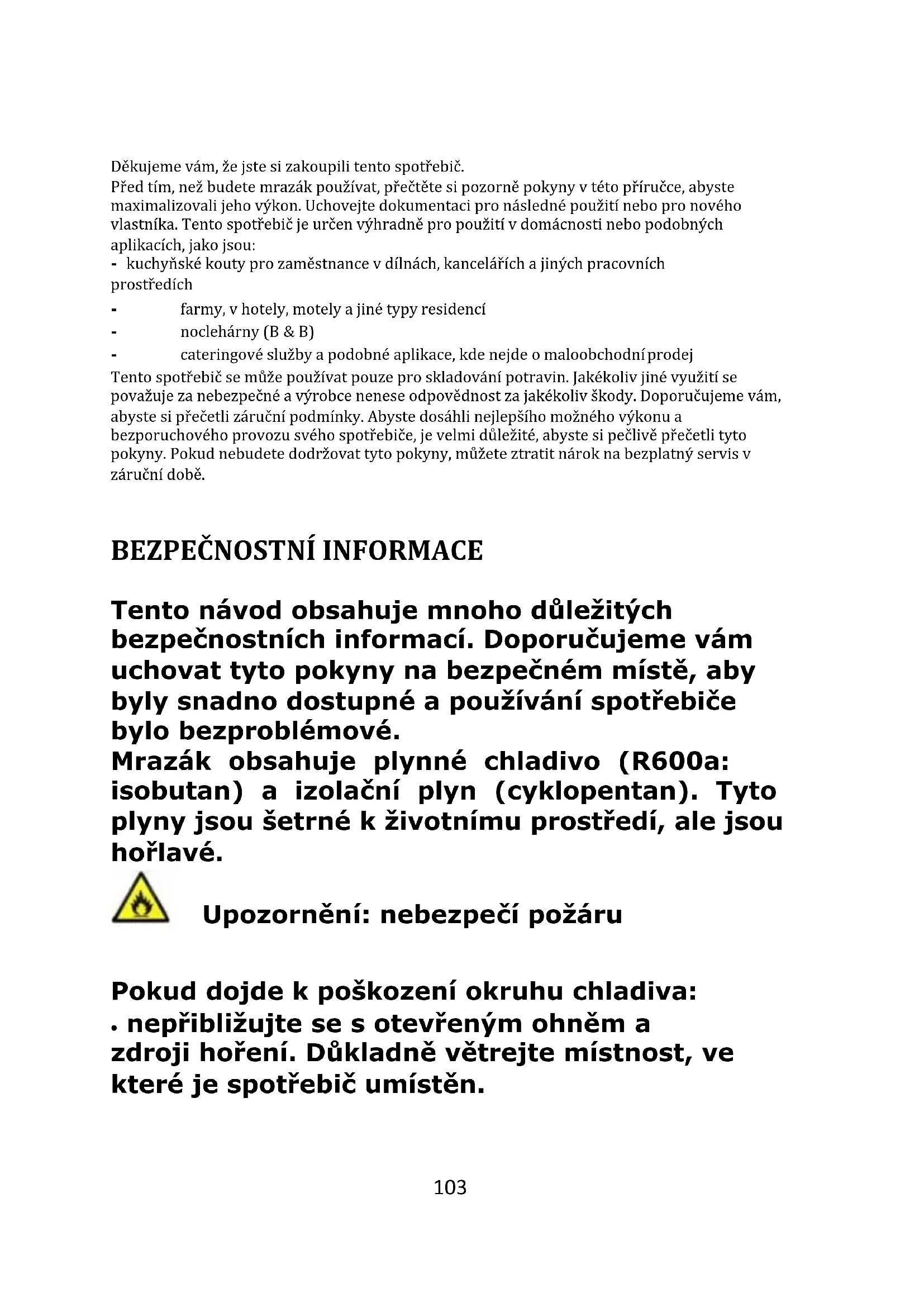 Tento návod obsahuje mnoho důležitých bezpečnostních informací. Doporučujeme vám uchovat tyto pokyny na bezpečném místě, aby byly snadno dostupné a používání spotřebiče bylo bezproblémové. Mrazák obsahuje plynné chladivo (R600a: isobutan) a izolační plyn (cyklopentan). Tyto plyny jsou šetrné k životnímu prostředí, ale jsou hořlavé. Upozornění: nebezpečí požáru Pokud dojde k poškození okruhu chladiva: