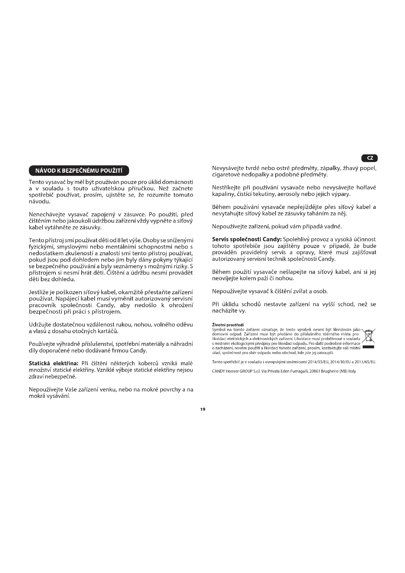 NÁVOD K BEZPEČNÉMU POUŽITÍ Tento vysavač by měl být používán pouze pro úklid domácnosti a v souladu s touto uživatelskou příručkou. Než začnete spotřebič používat, prosím, ujistěte se, že rozumíte tomuto návodu. Nenechávejte vysavač zapojený v zásuvce. Po použití, před čištěním nebo jakoukoli údržbou zařízení vždy vypněte a síťový kabel vytáhněte ze zásuvky. Tento přístroj smí používat děti od 8 let výše. Osoby se sníženými fyzickými, smyslovými nebo mentálními schopnostmi nebo s nedostatkem zkušeností a znalostí smí tento přístroj používat, pokud jsou pod dohledem nebo jim byly dány pokyny týkající se bezpečného používání a byly seznámeny s možnými riziky. S přístrojem si nesmí hrát děti. Čištění a údržbu nesmí provádět děti bez dohledu. Jestliže je poškozen síťový kabel, okamžitě přestaňte zařízení používat. Napájecí kabel musí vyměnit autorizovaný servisní pracovník společnosti Candy, aby nedošlo k ohrožení bezpečnosti při práci s přístrojem. Udržujte dostatečnou vzdálenost rukou, nohou, volného oděvu a vlasů z dosahu otočných kartáčů. Používejte výhradně příslušenství, spotřební materiály a náhradní díly doporučené nebo dodávané rmou Candy. Statická elektřina: Při čištění některých koberců vzniká malé množství statické elektřiny. Vzniklé výboje statické elektřiny nejsou zdraví nebezpečné. Nepoužívejte Vaše zařízení venku, nebo na mokré povrchy a na mokrá vysávání. Nevysávejte tvrdé nebo ostré předměty, zápalky, žhavý popel, cigaretové nedopalky a podobné předměty. Nestříkejte při používání vysavače nebo nevysávejte hořlavé kapaliny, čistící tekutiny, aerosoly nebo jejich výpary. Během používání vysavače nepřejíždějte přes síťový kabel a nevytahujte síťový kabel ze zásuvky taháním za něj. Nepoužívejte zařízení, pokud vám připadá vadné. Servis společnosti Candy: Spolehlivý provoz a vysoká účinnost tohoto spotřebiče jsou zajištěny pouze v případě, že bude prováděn pravidelný servis a opravy, které musí zajišťovat autorizovaný servisní technik společnosti Candy. Během použití vysavače nešlapejte na síťový kabel, ani si jej neovíjejte kolem paží či nohou. Nepoužívejte vysavač k čištění zvířat a osob. Při úklidu schodů nestavte zařízení na vyšší schod, než se nacházíte vy. Životní prostředí Symbol na tomto zařízení označuje, že tento výrobek nesmí být likvidován jako domovní odpad. Zařízení musí být předáno do příslušného sběrného místa pro likvidaci elektrických a elektronických zařízení. Likvidace musí proběhnout v souladu s místními ekologickými předpisy pro likvidaci odpadu. Pro další podrobné informace o zacházení, novém použití a likvidaci tohoto zařízení, prosím, kontaktujte váš místní úřad, společnost pro sběr odpadu nebo obchod, kde jste jej zakoupili. Tento spotřebič je v souladu s evropskými směrnicemi 2014/35/EU, 2014/30/EU a 2011/65/EU. CANDY Hoover GROUP S.r.l. Via Privata Eden Fumagalli, 20861 Brugherio (MB) Italy20 SEZNAMTE SE S VAŠÍM VYSAVAČEM A. Uvolňovací tlačítko nádoby na prach B. Otočný knoík pro variabilní ovládání výkonu C. Pedál zapnutí/vypnutí D. Parkovací pozice pro trubici E. Kryt výstupního ltru F. Víko zásobníku na prach G. Pedál navíjení kabelu H. Nádoba na prach