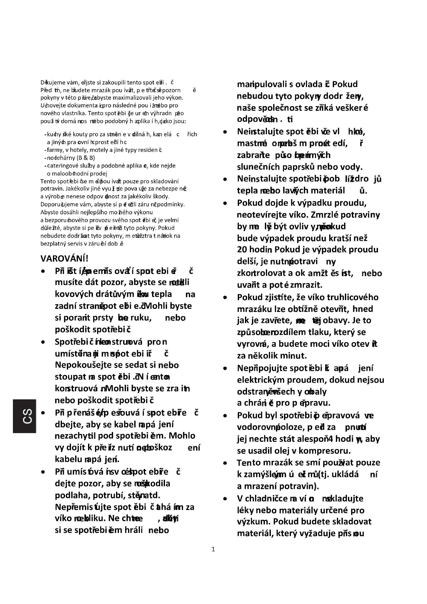 ateringové slu by a podobné aplika e, kde nejde o maloob hodní prodej Tento spot ebi se m e pou ívat pouze pro skladování potravin. Jakékoliv jiné vyu i se pova uje za nebezpe né a výrob e nenese odpov dnost za jakékoliv škody. Doporu ujeme vám, abyste si p e etli záru ní podmínky. Abyste dosáhli nejlepšího mo ného výkonu a bezporu hového provozu svého spot ebi e, je velmi le ité, abyste si pe liv p e etli tyto pokyny. Pokud nebudete dodr vat tyto pokyny, m ete ztra t nárok na bezplatný servis v záru ní dob . VAROVÁNÍ! P i išt í/p emís ová í spot ebi e musíte dát pozor, abyste se otkli kovových drát vým íku tepla za í stra spot ebi e. Mohli byste si pora it prsty bo ruku, poškodit spot ebi . Spot ebi í ko struová pro umíst í a ji m spot ebi i. Nepokoušejte se sedat si stoupat a spot ebi . N í a to ko struová . Mohli byste se zra it o poškodit spot ebi . P i p áš í/p esouvá í spot ebi e dbejte, aby se kabel apá zachy pod spot ebi em. Mohlo vy dojít k p e íz o poškoz kabelu apá í. P i umís ová í sv o spot ebi e dejte pozor, aby se oškodila podlaha, potrubí, st y atd. Nep emis ujte spot ebi ahá ím za víko o kliku. Ne chte , aby si se spot ebi em hráli ma ipulovali s ovlada i. Pokud ou tyto poky y dodr y, aše spole ost se z íká vešker odpov os . Nei stalujte spot ebi ve vl m, mast m o praš m prost edí, zabra te so í p ímých sl ích paprs o vody. Nei talujte spot ebi pob zdro tepla o ho lavých materiál Pokud dojde k výpadku proudu, otevírejte víko. Zmrzl potravi by m ly být ovliv y, pokud bude výpadek proudu kratší 20 hodi . Pokud je výpadek proudu delší, je t potravi zko trolovat a ok t s íst, uva it a pot zmrazit. Pokud zjis te, e víko truhlicov ho mrazáku lze ob otev ít, jak je zav ete, m te obavy. Je to z so o rozdílem tlaku, který se vyrov á, a budete moci víko otev ít za olik mi t. Nep ipojujte spot ebi k apá elektrickým proudem, dokud sou odstra y všech y obaly a chrá i e pro p epravu. Pokud byl spot ebi p epravová ve vodorov poloze, p ed za m jej chte stát alespo 4 hodi y, aby se usadil olej v kompresoru. to mrazák se smí pou vat pouze k zamýšl ým ú el m (tj. ukládá a mraz í potravi V chla i e a ví o skladujte l y o materiály ur pro výzkum. Pokud budete skladovat materiál, který vy aduje p ís ou2 kontrolu teploty skladování, je mo né, e dojde k jeho znehodnocení nebo m e dojít k nekontrolované reakci a vzniku nebezpe í. P ed jakoukoliv manipulací se spot ebi em, odpojte kabel napájení od zásuvky. P i dodání zkontrolujte, e produkt není poškozen a e všechny sou ás a p íslušenství jsou v dokonalém stavu. Pokud dojde k úniku chladiva, nedotýkejte se zásuvky a nepou vejte otev ený ohe . Otev ete okno a vyv trejte. Poté zavolejte servisní st edisko a po dejte o opravu. Nepou vejte prodlu ovací kabely nebo adaptéry. Netahejte a neohýbejte kabel napájení, nedotýkejte se zásuvky mokrýma rukama. Vy te se poškození zástr ky nebo kabelu napájení; mohlo by dojít k úrazu elektrickým proudem nebo po ru. Neumis ujte ani neukládejte ho lavé nebo vysoce prchavé látky, jako jsou éter, benzín, LPG, propan, aerosolové nádoby, lepidla, istý alkohol atd. Tyto materiály mohou z sobit výbuch. Je-li napájecí kabel poškozen, musí jej vym it výrobce, jeho servisní technik nebo podo kvali kovaný technik, aby nedošlo ke vzniku nebezpe ných situací. Pob chladni ky na víno nepou vejte ani neukládejte ho lavé spreje, jako jsou barvy ve spreji. Mohlo by dojít k výbuchu nebo po ru. Na horní stranu spot ebi e nepokládejte p edm ty nebo nádoby s vodou. Nedoporu ujeme pou vat prodlu ovací kabely ani sí ové adaptéry. Nelikvidujte spot ebi spálením. P i p eprav a pou vání spot ebi e dbejte, aby nedošlo k poškození okruhu/potrubí chladiva. V p ípa poškození nevystavujte spot ebi ohni, zdro m vznícení a ok t vyv trejte místnost, ve které je spot ebi umíst Systém chlazení umíst ý za a uvnit chladni ky na víno obsahuje chladivo. Zabra te poškození potrubí. Uvnit prostoru pro skladování potravin ve spot ebi i nepou vejte elektrické spot ebi e, pokud se nejedná o spot ebi e doporu ené výrobcem. Nepoško te okruh chladiva. Nepou vejte mechanické nástroje ani jinak neurychlujte proces rozmrazování. Pou vejte pouze prost edky doporu ené výrobcem. Uvnit prostoru pro skladování potravin nepou vejte elektrické spot ebi e, pokud se nejedná o spot ebi e doporu ené výrobcem. Otvory pro ven ci spot ebi e nebo sk í , ve které je spot ebi vestav , udr ujte volné bez3 p ek ek. Pro odstra ování námrazy nepou vejte špi até nebo ostré p edm ty. Nedotýkejte se vnit ních chladicích prvk , a to obzvlášt pokud máte mokré ruce, proto e byste se mohli popálit nebo zranit. Na pomoc odmrazování nikdy nepou vejte vysouše e vlas elektrické oh íva e a jiné podobné elektrické spot ebi e. Námrazu neškrábejte no em nebo ostrými p edm ty. Mohlo by dojít k poškození okruhu chladiva a vyteklé chladivo m e z sobit po r nebo poškození zraku. Nepou vejte dná mechanická za ízení pro urychlení procesu rozmrazování. Je absolut nezbytné zabránit pou vání otev eného o nebo elektrických p ístro , jako jsou oh íva e, parní is e, sví ky, olejové lampy a podobné, pro zrychlení fáze rozmrazování. Okolí kompresoru nikdy nemyjte vodou. Po vy išt í, abyste zabránili korozi, la je ot ete suchým hadrem. Doporu uje se udr ovat zástr ku v istot . Nánosy prachu na zástr ce mohou z sobit po r. Produkt ve ur en a vyroben pouze pro pou v domácnos . Tato záruka pozbude platnos , pokud je produkt instalován nebo pou ván v komer ních nebo nereziden ních prostorách. Tento produkt musí být správ instalován, umíst a provozován v souladu s pokyny uvedenými v bro u e Pokyny pro u vatele. Tato záruka je platná pouze pro nové produkty a není p enosná, pokud je produkt znovu p
