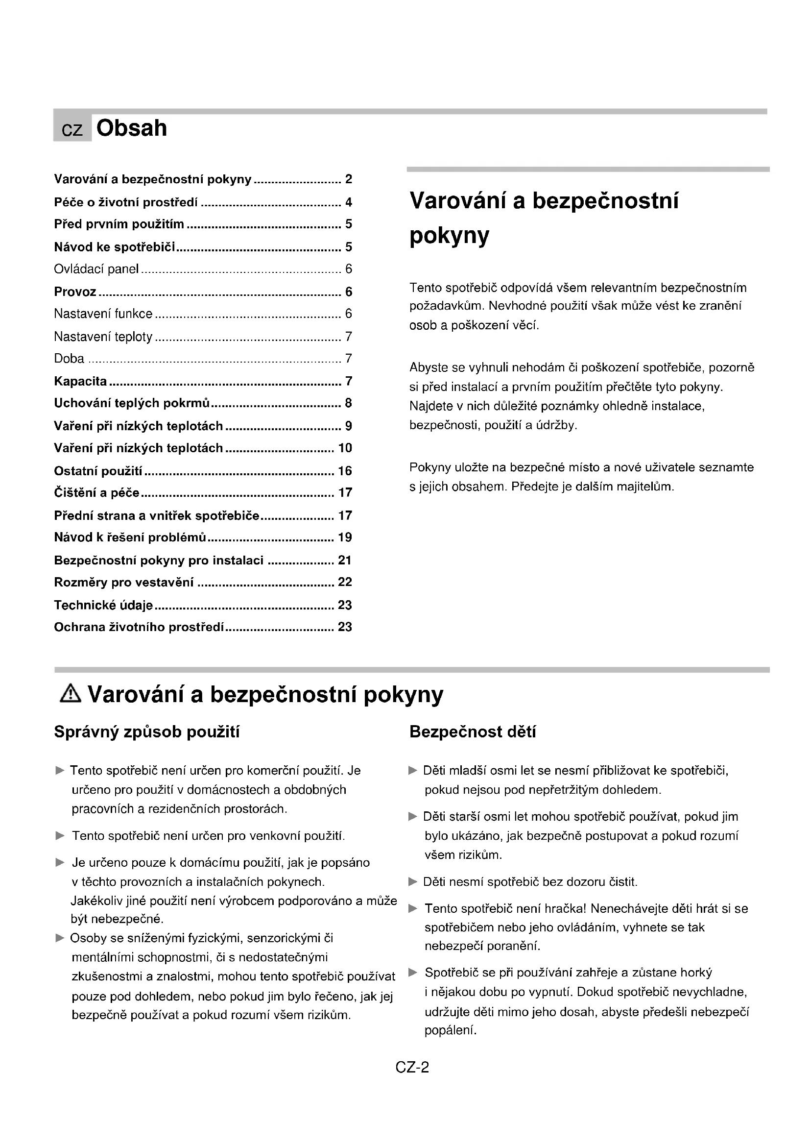- Ochrana životního prostředí Varování a bezpečnostní pokyny Tento spotřebič odpovídá všem relevantním bezpečnostním požadavkům. Nevhodné použití však může vést ke zranění osob a poškození věcí. Abyste se vyhnuli nehodám či poškození spotřebiče, pozorně si před instalací a prvním použitím přečtěte tyto pokyny. Najdete v nich důležité poznámky ohledně instalace, bezpečnosti, použití a údržby. Pokyny uložte na bezpečné místo a nové uživatele seznamte s jejich obsahem. Předejte je dalším majitelům. p. 23
