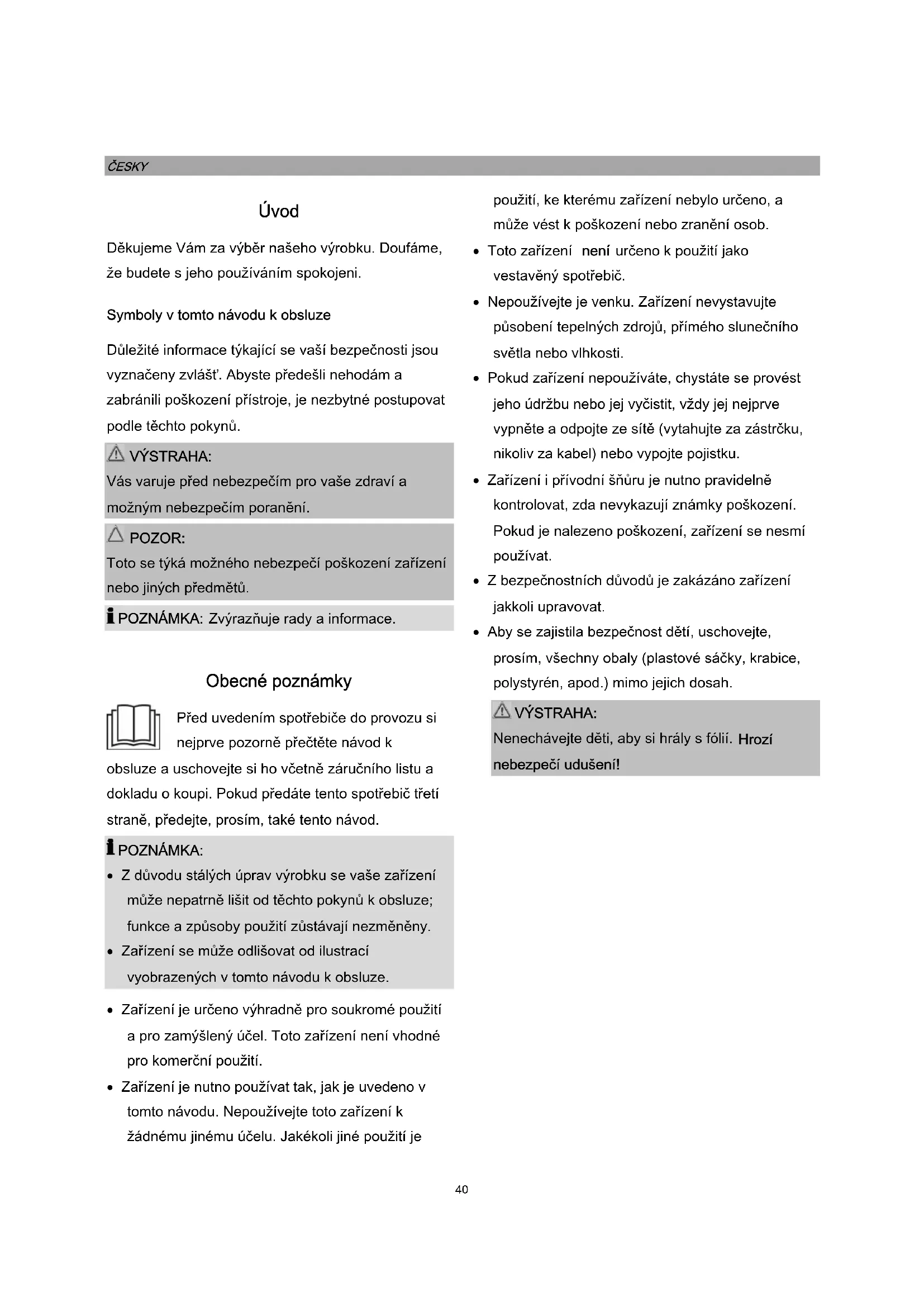 ČESKY Úvod Děkujeme Vám za výběr našeho výrobku. Doufáme, že budete s jeho používáním spokojeni. Symboly v tomto návodu k obsluze Důležité informace týkající se vaší bezpečnosti jsou vyznačeny zvlášť. Abyste předešli nehodám a zabránili poškození přístroje, je nezbytné postupovat podle těchto pokynů. VÝSTRAHA: Vás varuje před nebezpečím pro vaše zdraví a možným nebezpečím poranění. POZOR: Toto se týká možného nebezpečí poškození zařízení nebo jiných předmětů. POZNÁMKA: Zvýrazňuje rady a informace. Obecné poznámky Před uvedením spotřebiče do provozu si nejprve pozorně přečtěte návod k obsluze a uschovejte si ho včetně záručního listu a dokladu o koupi. Pokud předáte tento spotřebič třetí straně, předejte, prosím, také tento návod. POZNÁMKA: Z důvodu stálých úprav výrobku se vaše zařízení může nepatrně lišit od těchto pokynů k obsluze; funkce a způsoby použití zůstávají nezměněny. Zařízení se může odlišovat od ilustrací vyobrazených v tomto návodu k obsluze. Zařízení je určeno výhradně pro soukromé použití a pro zamýšlený účel. Toto zařízení není vhodné pro komerční použití. Zařízení je nutno používat tak, jak je uvedeno v tomto návodu. Nepoužívejte toto zařízení k žádnému jinému účelu. Jakékoli jiné použití je použití, ke kterému zařízení nebylo určeno, a může vést k poškození nebo zranění osob. Toto zařízení není určeno k použití jako vestavěný spotřebič. Nepoužívejte je venku. Zařízení nevystavujte působení tepelných zdrojů, přímého slunečního světla nebo vlhkosti. Pokud zařízení nepoužíváte, chystáte se provést jeho údržbu nebo jej vyčistit, vždy jej nejprve vypněte a odpojte ze sítě (vytahujte za zástrčku, nikoliv za kabel) nebo vypojte pojistku. Zařízení i přívodní šňůru je nutno pravidelně kontrolovat, zda nevykazují známky poškození. Pokud je nalezeno poškození, zařízení se nesmí používat. Z bezpečnostních důvodů je zakázáno zařízení jakkoli upravovat. Aby se zajistila bezpečnost dětí, uschovejte, prosím, všechny obaly (plastové sáčky, krabice, polystyrén, apod.) mimo jejich dosah. VÝSTRAHA: Nenechávejte děti, aby si hrály s fólií. Hrozí nebezpečí udušení!41