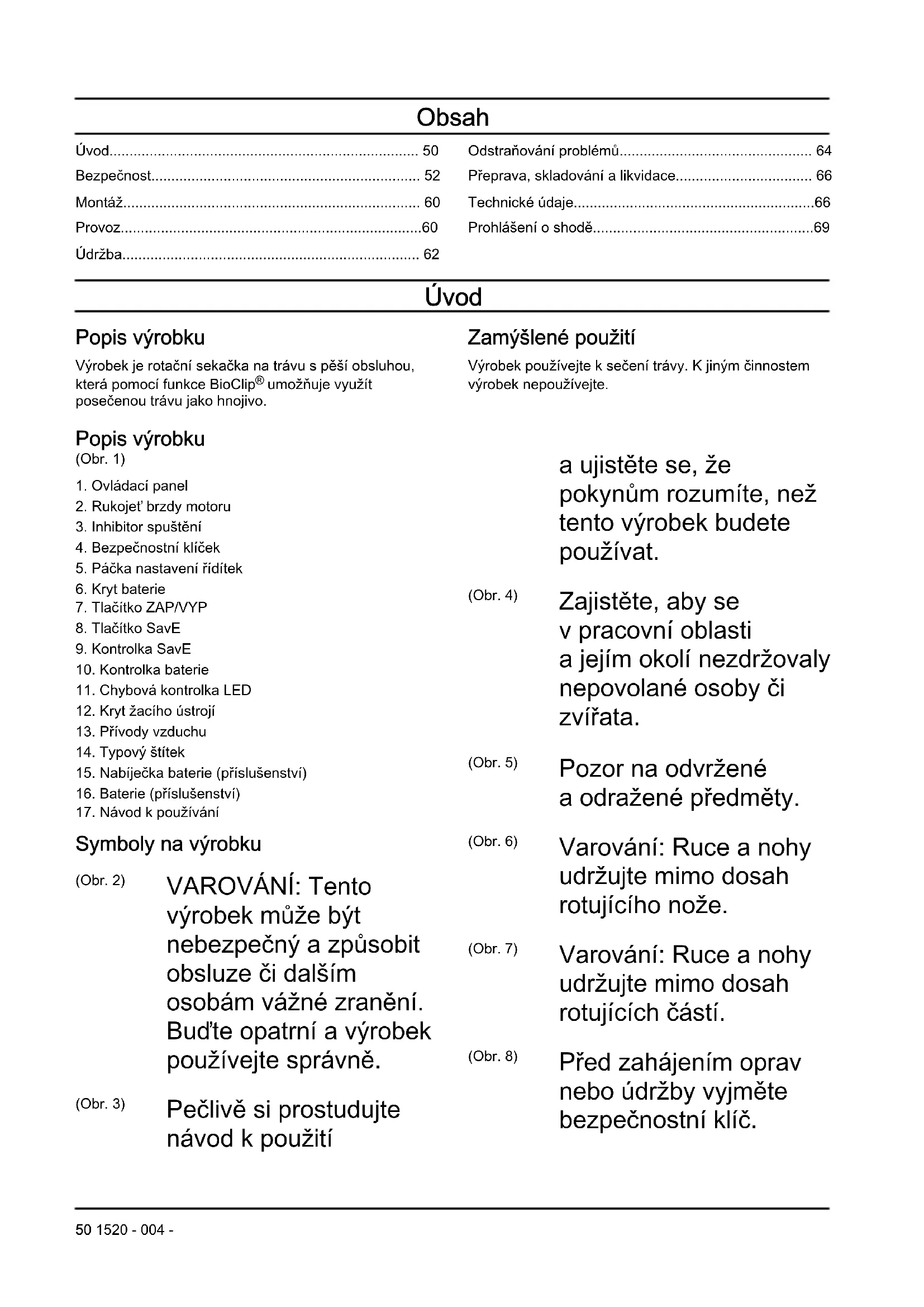 umožňuje využít posečenou trávu jako hnojivo. Zamýšlené použití Výrobek používejte ksečení trávy. Kjiným činnostem výrobek nepoužívejte. Popis výrobku (Obr. 1)