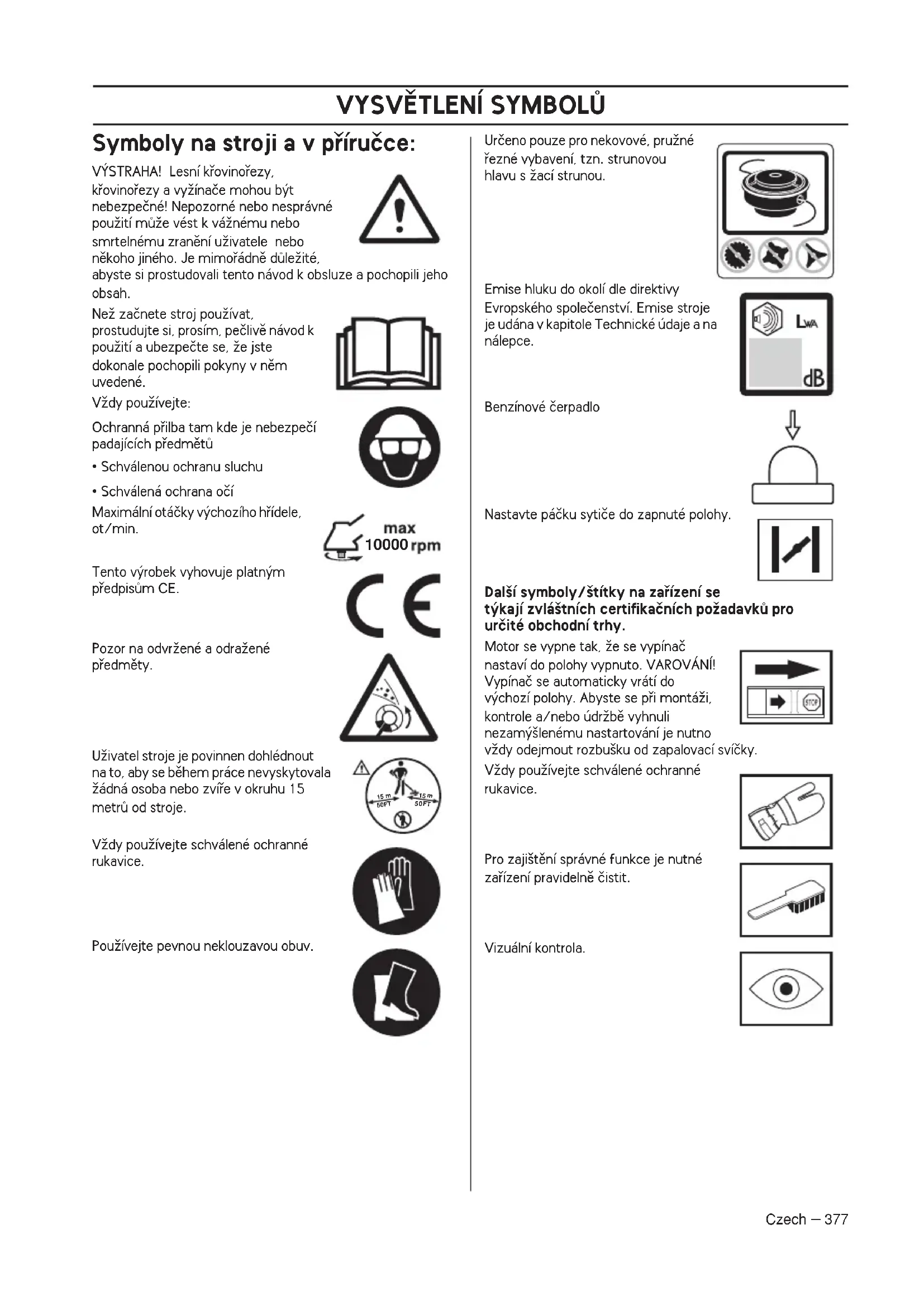 - Schválená ochrana oãí Maximální otáãky v˘chozího hfiídele, ot/min. Tento v˘robek vyhovuje platn˘m pfiedpisÛm CE. Pozor na odvrÏené a odraÏené pfiedmûty. UÏivatel stroje je povinnen dohlédnout na to, aby se bûhem práce nevyskytovala Ïádná osoba nebo zvífie v okruhu 15 metrÛ od stroje. VÏdy pouÏívejte schválené ochranné rukavice. PouÏívejte pevnou neklouzavou obuv. Urãeno pouze pro nekovové, pruÏné fiezné vybavení, tzn. strunovou hlavu s Ïací strunou. Emise hluku do okolí dle direktivy Evropského spoleãenství. Emise stroje je udána v kapitole Technické údaje a na nálepce. Benzínové ãerpadlo Nastavte páãku sytiãe do zapnuté polohy. Dal‰í symboly/‰títky na zafiízení se t˘kají zvlá‰tních certifikaãních poÏadavkÛ pro urãité obchodní trhy. Motor se vypne tak, Ïe se vypínaã nastaví do polohy vypnuto. VAROVÁNÍ! Vypínaã se automaticky vrátí do v˘chozí polohy. Abyste se pfii montáÏi, kontrole a/nebo údrÏbû vyhnuli nezam˘‰lenému nastartování je nutno vÏdy odejmout rozbu‰ku od zapalovací svíãky. VÏdy pouÏívejte schválené ochranné rukavice. Pro zaji‰tûní správné funkce je nutné zafiízení pravidelnû ãistit. Vizuální kontrola.