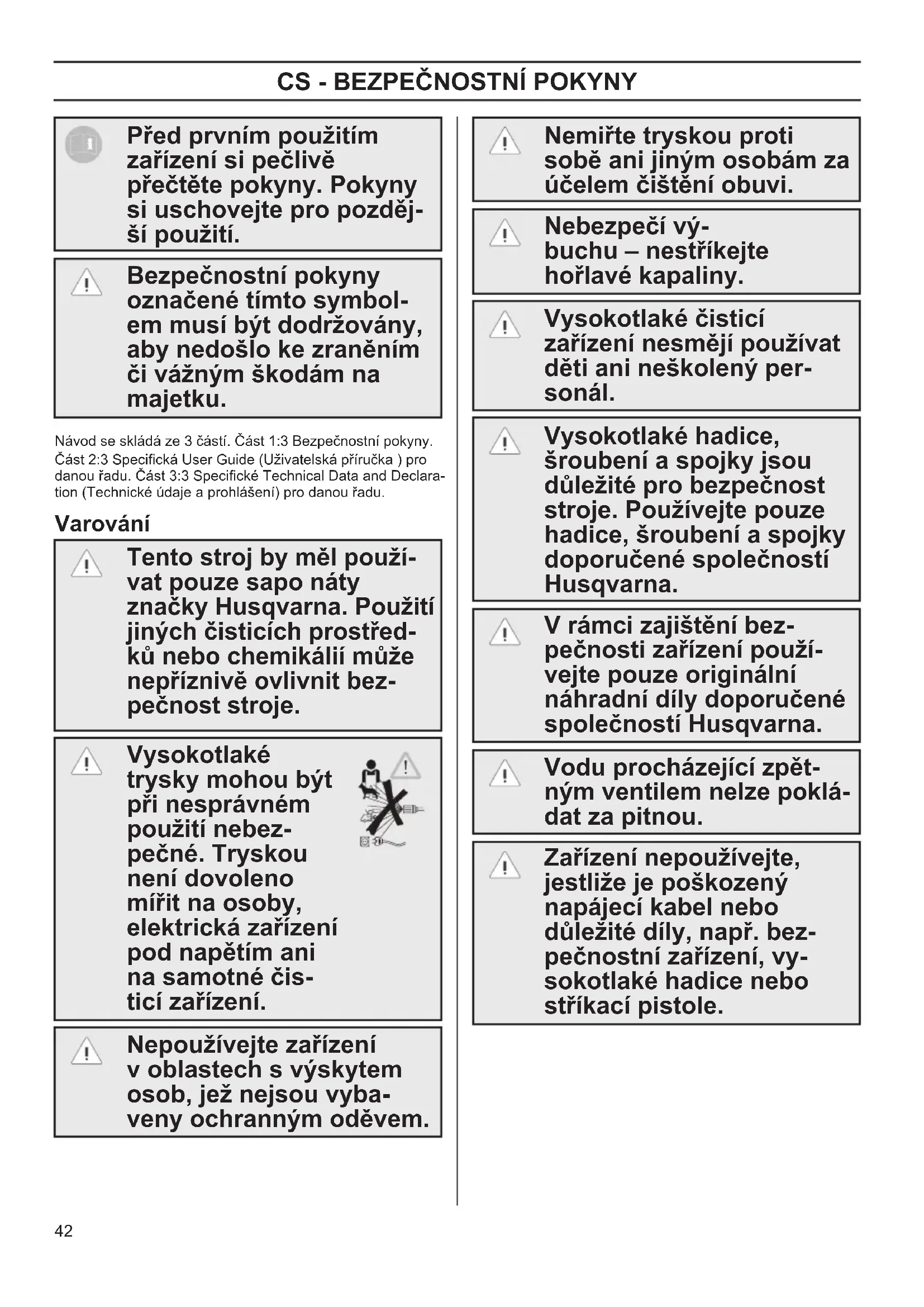 Před prvním použitím zařízení si pečlivě přečtěte pokyny. Pokyny si uschovejte pro pozděj- ší použití. Bezpečnostní pokyny označené tímto symbol- em musí být dodržovány, aby nedošlo ke zraněním či vážným škodám na majetku. Návod se skládá ze 3 částí. Část 1:3 Bezpečnostní pokyny. Část 2:3 Specická User Guide (Uživatelská příručka ) pro danou řadu. Část 3:3 Specické Technical Data and Declara- tion (Technické údaje a prohlášení) pro danou řadu. Varování Tento stroj by měl použí- vat pouze sapo náty značky Husqvarna. Použití jiných čisticích prostřed- ků nebo chemikálií může nepříznivě ovlivnit bez- pečnost stroje. Vysokotlaké trysky mohou být při nesprávném použití nebez- pečné. Tryskou není dovoleno mířit na osoby, elektrická zařízení pod napětím ani na samotné čis- ticí zařízení. Nepoužívejte zařízení v oblastech s výskytem osob, jež nejsou vyba- veny ochranným oděvem. Nemiřte tryskou proti sobě ani jiným osobám za účelem čištění obuvi. Nebezpečí vý- buchu – nestříkejte hořlavé kapaliny. Vysokotlaké čisticí zařízení nesmějí používat děti ani neškolený per- sonál. Vysokotlaké hadice, šroubení a spojky jsou důležité pro bezpečnost stroje. Používejte pouze hadice, šroubení a spojky doporučené společností Husqvarna. V rámci zajištění bez- pečnosti zařízení použí- vejte pouze originální náhradní díly doporučené společností Husqvarna. Vodu procházející zpět- ným ventilem nelze poklá- dat za pitnou. Zařízení nepoužívejte, jestliže je poškozený napájecí kabel nebo důležité díly, např. bez- pečnostní zařízení, vy- sokotlaké hadice nebo stříkací pistole. OM 1-3 Safety FINAL rev 1 draft.indd 42 2017-06-14 13:59:4343