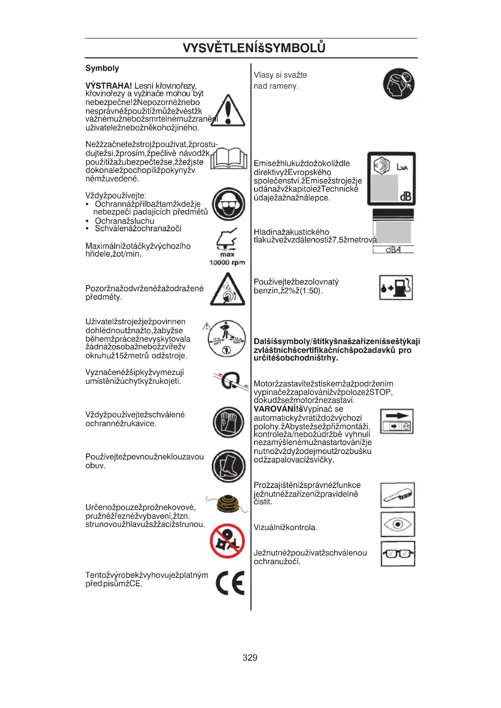 331OBECNÁ BEZPEżNOSTNÍ OPATƘENÍ UPOZORNöNÍ! Lesní kƗovinoƗez, kƗovinoƗez a vyžínaŻ použitý nesprávn÷ nebo nepozorn÷ se mÞže stát nebezpeŻným nástrojem, který mÞže zpÞsobit vážné nebo i smrtelné zran÷ni uživatele nebo n÷koho jiného. Je nesmírn÷ dÞležité pƗeŻíst si a porozum÷t obsahu tohoto návodu k používání. PƗi každém použití stroje je nutné používat schválené osobní ochranné pomÞcky. Osobní ochranné pomÞcky nemohou vylouŻit nebezpeŻí úrazu, ale sníží míru poran÷ní v pƗípad÷, že dojde k nehod÷. Požádejte svého prodejce o pomoc pƗi výb÷ru správného vybavení. OCHRANA SLUCHU Použijte ochranu sluchu s dostateŻným tlumicím úŻinkem. OCHRANA OżÍ Použijte vždy schválenou ochranu oŻí. Použijete---li vizír je nutno použít i schvále- né ochranné brýle. Schválené ochranné brýle jsou takové, které odpovídají standardu EN 166 pro státy EU. RUKAVICE V pƗípad÷ potƗeby použijte rukavice, napƗ. pƗi montáži Ɨezného vybavení. PRACOVNÍ OBUV Používejte pevnou neklouzavou obuv. Osobní ochranné pomÞcky VÝSTRAHA! Je nutné dát vždy pozor na výstražné signály nebo volání, používáte---li ochranu sluchu. Sejm÷te vždy ochranu sluchu ihned po zastavení motoru. Upozorn÷ní UPOZORNöNÍ! Stroj je urŻen výhradn÷ k vyžínání trávy. Jediným pƗislušenstvím, které se smí používat spolu s motorem jako zdroj pohonu, je Ɨezné vybavení, doporuŻené v kapitole Technické údaje. Nikdy nepoužívejte stroj, jste---li unaveni, jestliže jste požili alkohol nebo jestliže užíváte léky, které by mohly ovlivnit váš zrak, úsudek nebo pohybovou koordinaci. Používejte osobní ochranné pomÞcky. Viz pokyny v Żásti Osobní ochranné pomÞcky. Nikdy nepoužívejte stroj, jehož konstrukce byla jakkoli pozm÷n÷na oproti jeho pÞvodním specifikacím. Nikdy nepoužívejte stroj, který není zcela v poƗádku. Pravideln÷ provád÷jte kontroly a údržbu podle servisních pokynÞ popsaných v této pƗíruŻce. N÷které úkony údržby a opravy mohou provád÷t pouze vyškolení a kvalifikovaní odborníci. Viz pokyny v Żásti Údržba. Veškeré poklopy a kryty vybavení musí být namontovány pƗed spušt÷ním. Dbejte, aby kabel zapalování a jeho koncovka nebyly poškozeny. Jinak je nebezpeŻí rány elektrickým proudem. Uživatel stroje je povinnen dohlédnout na to, aby se b÷hem práce nevyskytovala v okruhu 15 m žádná osoba nebo zvíƗe. Pokud na stejném pracovišti pracuje více uživatelÞ, musí být udržována bezpeŻnostní vzdálenost nejmén÷ dvakrát výška stromu, ale ne mén÷ než 15 m. VÝSTRAHA! Nenechte nikdy d÷ti používat stroj nebo se zdržovat v jeho blízkosti. Jelikož je stroj vybaven vypínaŻem se zp÷tným pérováním a k jeho nastartování je tƗeba nízká rychlost a malý tlak na startovací rukov÷ŭ mohou i d÷ti za urŻitých okolností mít tu sílu, které je tƗeba k nastartování stroje. Tím mÞže dojít k nebezpeŻí váIného úrazu. Proto vždy sejm÷te rozbušku není---li stroj pod dohledem. VÝSTRAHA! Tento stroj vytváƗí b÷hem provozu elektromagnetické pole. Toto pole mÞže za urŻitých okolností narušovat funkci aktivních ci pasivních implantovaných lékaƗských pƗístrojÞ. Pro snížení rizika vážného Żi smrtelného poran÷ní doporuŻujeme osobám s implantovanými lékaƗskými pƗístroji poradit se pƗed použitím stroje s lékaƗem a s výrobcem implantova- ného lékaƗského pƗístroje. 332OBECNÁ BEZPEżNOSTNÍ OPATƘENÍ PRACOVNÍ ODöV Použivejte od÷v z pevné látky a vyhn÷te se pƗiliš volným Żástem od÷vu, které mohou být zachyceny kƗovinami nebo v÷tvemi. Používejte vždy dlouhé silné kalhoty. Nepoužívejte šperky, krátké kalhoty nebo sandály a nepracujte bosi. Upravte si úŻes tak, aby vám vlasy nevisely pod ramena. LÉKÁRNIżKA PRVNÍ POMOCI Vždy m÷jte po ruce soupravu pro poskytování první pomoci. BezpeŻnostní vybavení stroje Tato Żást popisuje bezpeŻnostní vybavení stroje, jeho úŻel a zpÞsob, kterým by se m÷la provád÷t kontrola a údržba, aby byla zajišt÷na jeho správná funkce. Pokud chcete zjistit, kde je toto vybavení na stroji umíst÷no, prostudujte si Żást Co je co? Životnost stroje se mÞže zkracovat a riziko úrazÞ zvyšovat, jestliže se údržba stroje neprovádí správn÷ anebo se opravy neprovád÷jí odborn÷. Pokud potƗebujete dalši informace, obraŭte se na nejbližší servisní dílnu. UPOZORNöNÍ! Servis a opravy stroje vyžadují speciální odborné školení. To platí zejména pro bezpeŻnostní vybavení stroje. V pƗípad÷, že by stroj nevyhov÷l pƗi n÷které z níže uvedených kontrol, je nutno vyhledat servisní opravnu. Každému zákazníkovi, který zakoupí kterýkoli z našich výrobkÞ, zaruŻujeme dostupnost profesionálních oprav a servisních prací. Pokud prodejce, který vám stroj prodal, neposkytuje servisní práce, požádejte jej o adresu naší nejbližší servisní opravny. VÝSTRAHA! Nikdy nepoužívejte stroj, jehož bezpeŻnostní vybavení je poškozené! Kontrolu a údržbu bezpeŻnostního vybavení stroje je nutno provád÷t podle postupÞ uvedených v této Żásti textu. V pƗípad÷, že by stroj nevyhov÷l pƗi jakékoli z t÷chto kontrol, je nutno vy. Pojistka páŻky plynu Pojistka paŻky plynu má za úŻel zabránit neúmyslnému pƗidání plynu. Po stisknutí pojistky (A) (napƗ. když uchopíte rukojeŭ) se uvolní páŻka plynu (B). Když rukojeŭ pustíte, páŻka plynu i pojistka páŻky plynu se vrátí do pÞvodní polohy. Tento pohyb je zajišŭován dv÷ma nezávislými vratnými pružinami. Toto uspoƗádání zabezpeŻí, že se páŻka plynu automaticky zajistí v poloze, pƗi které b÷ží motor ve volnob÷žných otáŻkách. Zkontrolujte, zda pƗi uvoln÷ní pojistky páŻky plynu zapadne páŻka plynu do poloh