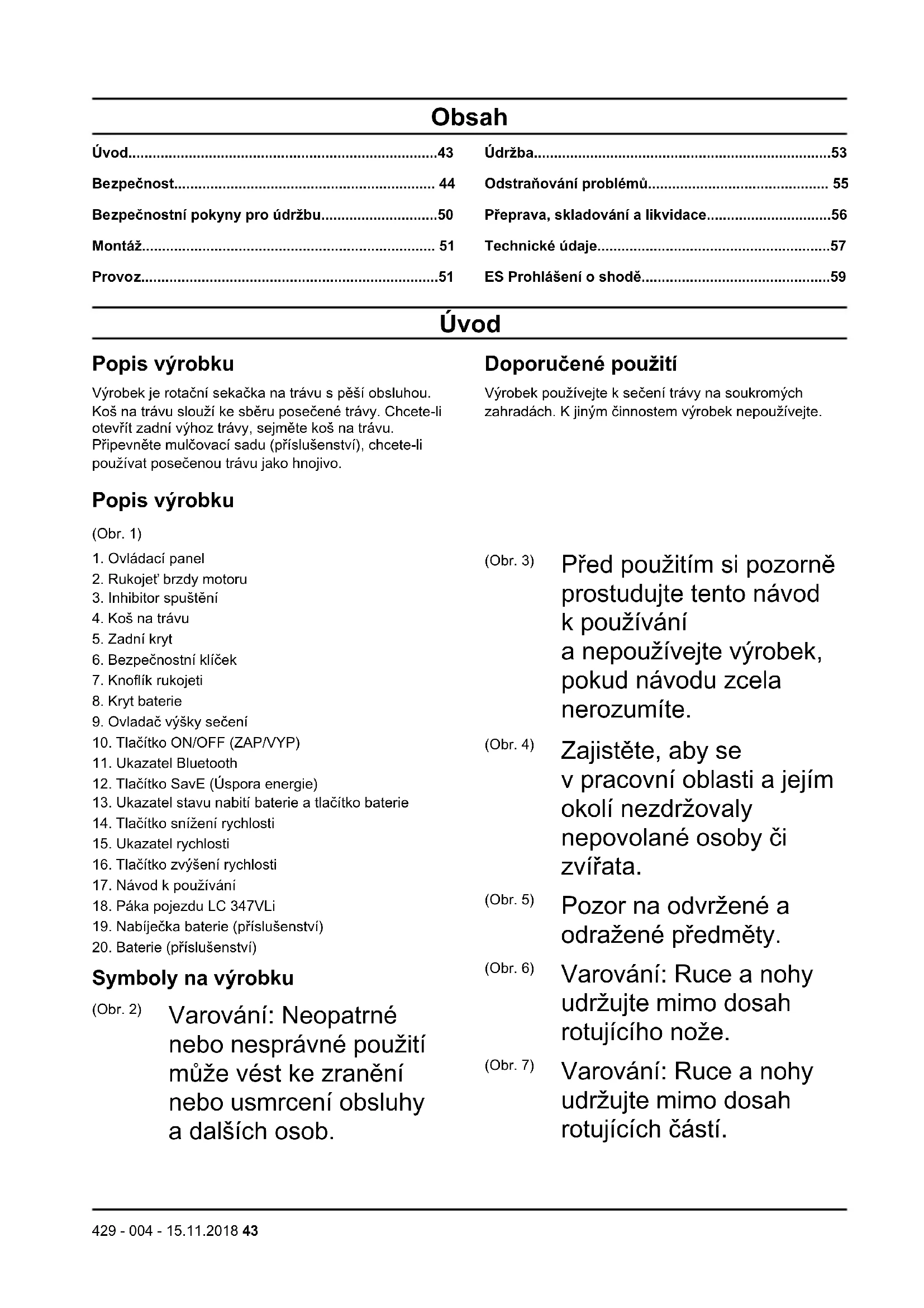 Symboly na výrobku (Obr. 2) Varování: Neopatrné nebo nesprávné použití může vést ke zranění nebo usmrcení obsluhy a dalších osob. (Obr. 3) Před použitím si pozorně prostudujte tento návod k používání a nepoužívejte výrobek, pokud návodu zcela nerozumíte. (Obr. 4) Zajistěte, aby se v pracovní oblasti a jejím okolí nezdržovaly nepovolané osoby či zvířata. (Obr. 5) Pozor na odvržené a odražené předměty. (Obr. 6) Varování: Ruce a nohy udržujte mimo dosah rotujícího nože. (Obr. 7) Varování: Ruce a nohy udržujte mimo dosah rotujících částí.