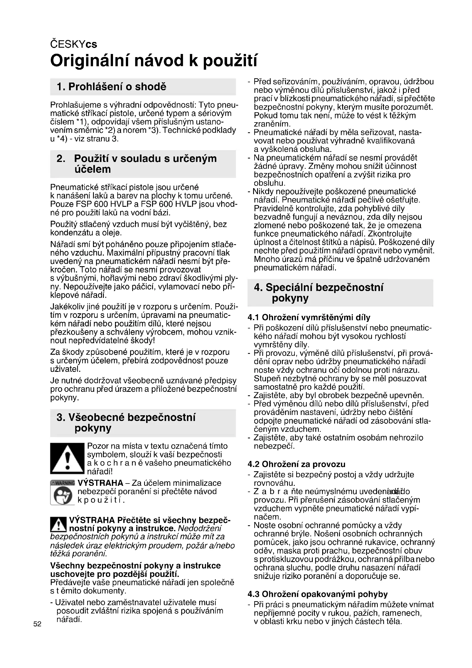 Originální návod k použití Prohlašujeme s výhradní odpovědností: Tyto pneu- matické stříkací pistole, určené typem a sériovým číslem *1), odpovídají všem příslušným ustano- vením směrnic *2) a norem *3). Technické podklady u *4) - viz stranu 3. Pneumatické stříkací pistole jsou určené knanášení laků a barev na plochy k tomu určené. Pouze FSP 600 HVLP a FSP 600 HVLP jsou vhod- né pro použití laků na vodní bázi. Použitý stlačený vzduch musí být vyčištěný, bez kondenzátu a oleje. Nářadí smí být poháněno pouze připojením stlače- ného vzduchu. Maximální přípustný pracovní tlak uvedený na pneumatickém nářadí nesmí být pře- kročen. Toto nářadí se nesmí provozovat s výbušnými, hořlavými nebo zdraví škodlivými ply- ny. Nepoužívejte jako páčicí, vylamovací nebo pří- klepové nářadí. Jakékoliv jiné použití je v rozporu s určením. Použi- tím v rozporu s určením, úpravami na pneumatic- kém nářadí nebo použitím dílů, které nejsou přezkoušeny a schváleny výrobcem, mohou vznik- nout nepředvídatelné škody! Za škody způsobené použitím, které je v rozporu surčeným účelem, přebírá zodpovědnost pouze uživatel. Je nutné dodržovat všeobecně uznávané předpisy pro ochranu před úrazem a přiložené bezpečnostní pokyny. Pozor na místa v textu označená tímto symbolem, slouží k vaší bezpečnosti akochraně vašeho pneumatického nářadí! VÝSTRAHA – Za účelem minimalizace nebezpečí poranění si přečtěte návod kpoužití. VÝSTRAHA Přečtěte si všechny bezpeč- nostní pokyny a instrukce. Nedodržení bezpečnostních pokynů ainstrukcí může mít za následek úraz elektrickým proudem, požár a/nebo těžká poranění. Všechny bezpečnostní pokyny a instrukce uschovejte pro pozdější použití. Předávejte vaše pneumatické nářadí jen společně stěmito dokumenty. - Uživatel nebo zaměstnavatel uživatele musí posoudit zvláštní rizika spojená s používáním nářadí. -Před seřizováním, používáním, opravou, údržbou nebo výmě nou dílů příslušenství, jakož i před prací v blízkosti pneumatického nářadí, si přečtěte bezpečnostní pokyny, kterým musíte porozumět. Pokud tomu tak není, může to vést k těžkým zraněním. -Pneumatické nářadí by měla seřizovat, nasta- vovat nebo používat výhradně kvalifikovaná a vyškolená obsluha. - Na pneumatickém nářadí se nesmí provádět žádné úpravy. Změny mohou snížit účinnost bezpečnostních opatření a zvýšit rizika pro obsluhu. - Nikdy nepoužívejte poškozené pneumatické nářadí. Pneumatické nářadí pečlivě ošetřujte. Pravidelně kontrolujte, zda pohyblivé díly bezvadně fungují a neváznou, zda díly nejsou zlomené nebo poškozené tak, že je omezena funkce pneumatického nářadí. Zkontrolujte úplnost a čitelnost štítků anápisů. Poškozené díly nechte před použitím nářadí opravit nebo vyměnit. Mnoho úrazů má příčinu ve špatně udržovaném pneumatickém nářadí.