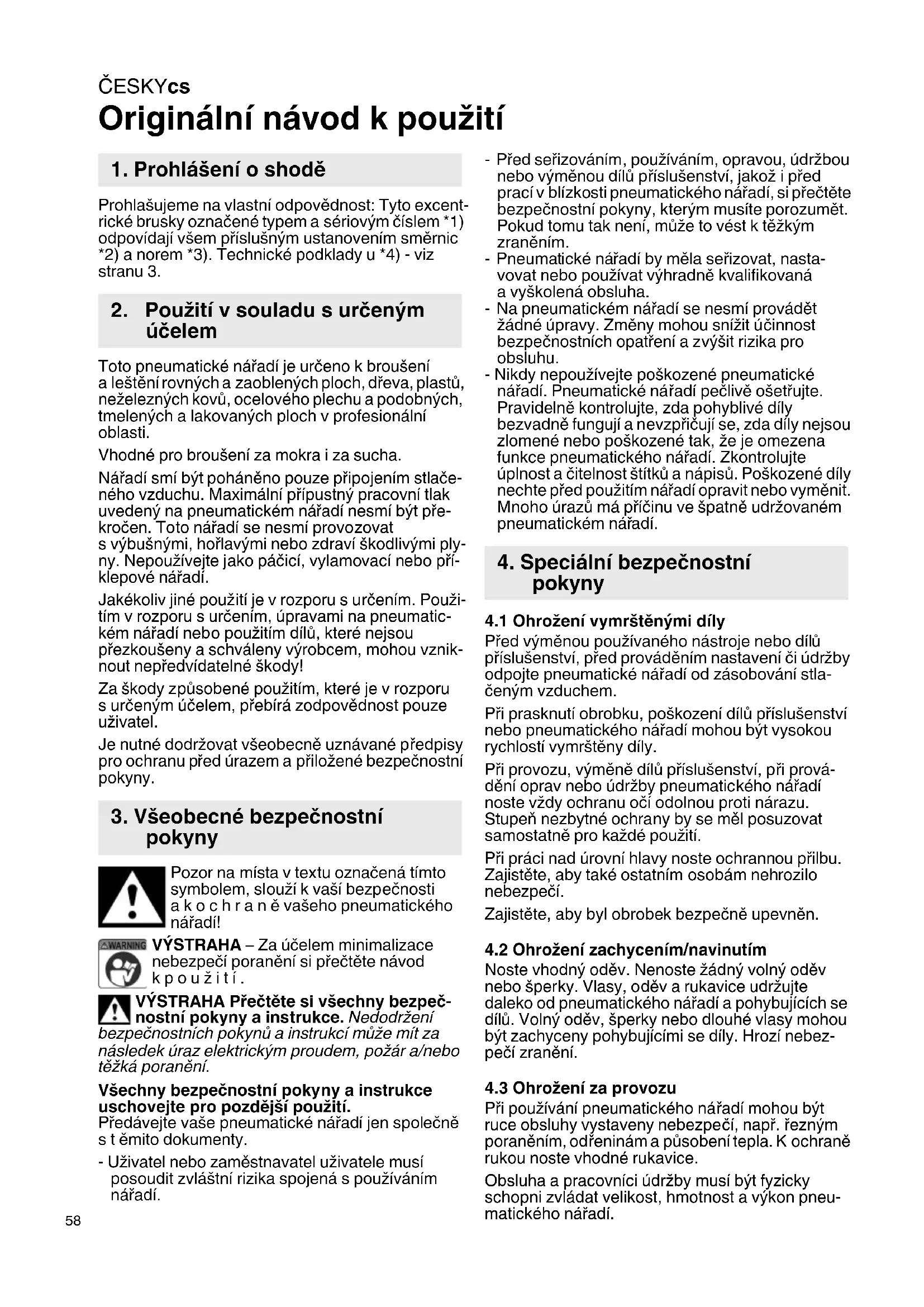 Originální návod k použití Prohlašujeme na vlastní odpovědnost: Tyto excent- rické brusky označené typem a sériovým číslem *1) odpovídají všem příslušným ustanovením směrnic *2) a norem *3). Technické podklady u *4) - viz stranu 3. Toto pneumatické nářadí je určeno k broušení aleštění rovných a zaoblených ploch, dřeva, plastů, neželezných kovů, ocelového plechu a podobných, tmelených a lakovaných ploch v profesionální oblasti. Vhodné pro broušení za mokra i za sucha. Nářadí smí být poháněno pouze připojením stlače- ného vzduchu. Maximální přípustný pracovní tlak uvedený na pneumatickém nářadí nesmí být pře- kročen. Toto nářadí se nesmí provozovat s výbušnými, hořlavými nebo zdraví škodlivými ply- ny. Nepoužívejte jako páčicí, vylamovací nebo pří- klepové nářadí. Jakékoliv jiné použití je v rozporu s určením. Použi- tím v rozporu s určením, úpravami na pneumatic- kém nářadí nebo použitím dílů, které nejsou přezkoušeny a schváleny výrobcem, mohou vznik- nout nepředvídatelné škody! Za škody způsobené použitím, které je v rozporu surčeným účelem, přebírá zodpovědnost pouze uživatel. Je nutné dodržovat všeobecně uznávané předpisy pro ochranu p řed úrazem a přiložené bezpečnostní pokyny. Pozor na místa v textu označená tímto symbolem, slouží k vaší bezpečnosti akochraně vašeho pneumatického nářadí! VÝSTRAHA – Za účelem minimalizace nebezpečí poranění si přečtěte návod kpoužití. VÝSTRAHA Přečtěte si všechny bezpeč- nostní pokyny a instrukce. Nedodržení bezpečnostních pokynů ainstrukcí může mít za následek úraz elektrickým proudem, požár a/nebo těžká poranění. Všechny bezpečnostní pokyny a instrukce uschovejte pro pozdější použití. Předávejte vaše pneumatické nářadí jen společně stěmito dokumenty. - Uživatel nebo zaměstnavatel uživatele musí posoudit zvláštní rizika spojená s používáním nářadí. -Před seřizováním, používáním, opravou, údržbou nebo výměnou dílů příslušenství, jakož i před prací v blízkosti pneumatického nářadí, si přečtěte bezpečnostní pokyny, kterým musíte porozumět. Pokud tomu tak není, může to vést k těžkým zraněním. -Pneumatické nářadí by měla seřizovat, nasta- vovat nebo používat výhradně kvalifikovaná a vyškolená obsluha. - Na pneumatickém nářadí se nesmí provádět žádné úpravy. Změny mohou snížit účinnost bezpečnostních opatření a zvýšit rizika pro obsluhu. - Nikdy nepoužívejte poškozené pneumatické nářadí. Pneumatické nářadí pečlivě ošetřujte. Pravidelně kontrolujte, zda pohyblivé díly bezvadně fungují a nevzpřičují se, zda díly nejsou zlomené nebo poškozené tak, že je omezena funkce pneumatického nářadí. Zkontrolujte úplnost a čitelnost štítků anápisů. Poškozené díly nechte před použitím nářadí opravit nebo vyměnit. Mnoho úrazů má příčinu ve špatně udržovaném pneumatickém nář adí.