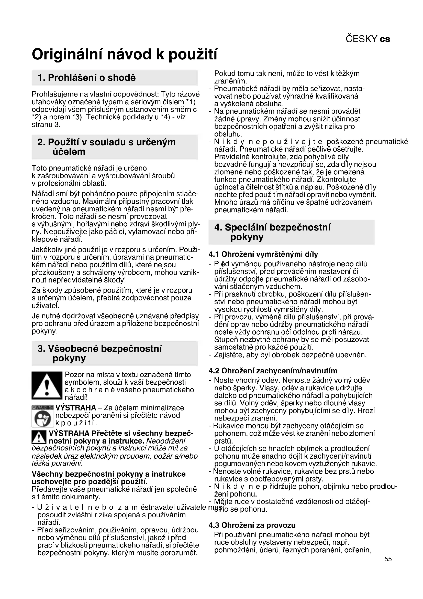 Originální návod k použití Prohlašujeme na vlastní odpovědnost: Tyto rázové utahováky označené typem a sériovým číslem *1) odpovídají všem příslušným ustanovením směrnic *2) a norem *3). Technické podklady u *4) - viz stranu 3. Toto pneumatické nářadí je určeno k zašroubovávání a vyšroubovávání šroubů v profesionální oblasti. Nářadí smí být poháněno pouze připojením stlače- ného vzduchu. Maximální přípustný pracovní tlak uvedený na pneumatickém nářadí nesmí být pře- kročen. Toto nářadí se nesmí provozovat s výbušnými, hořlavými nebo zdraví škodlivými ply- ny. Nepoužívejte jako páčicí, vylamovací nebo pří- klepové nářadí. Jakékoliv jiné použití je v rozporu s určením. Použi- tím v rozporu s určením, úpravami na pneumatic- kém nářadí nebo použitím dílů, které nejsou přezkoušeny a schváleny výrobcem, mohou vznik- nout nepředvídatelné škody! Za škody způsobené použitím, které je v rozporu surčeným účelem, přebírá zodpovědnost pouze uživatel. Je nutné dodržovat všeobecně uznávané předpisy pro ochranu před úrazem a přiložené bezpečnostní pokyny. Pozor na místa v textu označená tímto symbolem, slouží k vaší bezpečnosti akochraně vašeho pneumatického nářadí! VÝSTRAHA – Za účelem minimalizace nebezpečí poranění si přečtěte návod kpoužití. VÝSTRAHA Přečtěte si všechny bezpeč- nostní pokyny a instrukce. Nedodržení bezpečnostních pokynů ainstrukcí může mít za následek úraz elektrickým proudem, požár a/nebo těžká poranění. Všechny bezpečnostní pokyny a instrukce uschovejte pro pozdější použití. Předávejte vaše pneumatické nářadí jen společně stěmito dokumenty. -Uživatel nebo zaměstnavatel uživatele musí posoudit zvláštní rizika spojená s používáním nářadí. -Před seřizováním, používáním, opravou, údržbou nebo výměnou dílů příslušenství, jakož i před prací v blízkosti pneumatického nářadí, si přečt ěte bezpečnostní pokyny, kterým musíte porozumět. Pokud tomu tak není, může to vést k těžkým zraněním. - Pneumatické nářadí by měla seřizovat, nasta- vovat nebo používat výhradně kvalifikovaná a vyškolená obsluha. - Na pneumatickém nářadí se nesmí provádět žádné úpravy. Změny mohou snížit účinnost bezpečnostních opatření a zvýšit rizika pro obsluhu. -Nikdy nepoužívejte poškozené pneumatické nářadí. Pneumatické nářadí pečlivě ošetřujte. Pravidelně kontrolujte, zda pohyblivé díly bezvadně fungují a nevzpřičují se, zda díly nejsou zlomené nebo poškozené tak, že je omezena funkce pneumatického nářadí. Zkontrolujte úplnost a čitelnost štítků anápisů. Poškozené díly nechte před použitím nářadí opravit nebo vyměnit. Mnoho úrazů má příčinu ve špatně udržovaném pneumatickém nářadí.