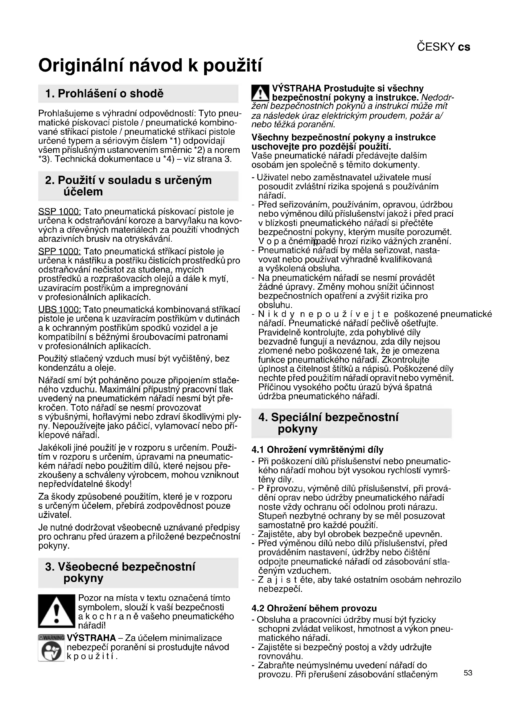 Originální návod k použití Prohlašujeme s výhradní odpovědností: Tyto pneu- matické pískovací pistole / pneumatické kombino- vané stříkací pistole / pneumatické stříkací pistole určené typem a sériovým číslem *1) odpovídají všem příslušným ustanovením směrnic *2) a norem *3). Technická dokumentace u *4) – viz strana 3. SSP 1000: Tato pneumatická pískovací pistole je určena k odstraňování koroze a barvy/laku na kovo- vých a dřevěných materiálech za použití vhodných abrazivních brusiv na otryskávání. SPP 1000: Tato pneumatická stříkací pistole je určena k nástřiku a postřiku čisticích prostředků pro odstraňování nečistot za studena, mycích prostředků a rozprašovacích olejů adále kmytí, uzavíracím postřikům a impregnování v profesionálních aplikacích. UBS 1000: Tato pneumatická kombinovaná stříkací pistole je určena k uzavíracím postřikům v dutinách akochranným postřikům spodků vozidel a je kompatibilní s běžnými šroubovacími patronami v profesionálních aplikacích. Použitý stlačený vzduch musí být vyčištěný, bez kondenzátu a oleje. Nářadí smí být poháněno pouze připojením stlače- ného vzduchu. Maximální přípustný pracovní tlak uvedený na pneumatickém nářadí nesmí být pře- kročen. Toto nářadí se nesmí provozovat s výbušnými, hořlavými nebo zdraví škodlivými ply- ny. Nepoužívejte jako páčicí, vylamovací nebo pří- klepové nářadí. Jakékoli jiné použití je v rozporu s určením. Použi- tím v rozporu s určením, úpravami na pneumatic- kém nářadí nebo použitím dílů, které nejsou pře- zkoušeny a schváleny výrobcem, mohou vzniknout nepředvídatelné škody! Za škody způsobené použitím, které je v rozporu surčeným účelem, přebírá zodpovědnost pouze uživatel. Je nutné dodržovat všeobecně uznávané předpisy pro ochranu před úrazem a př iložené bezpečnostní pokyny. Pozor na místa v textu označená tímto symbolem, slouží k vaší bezpečnosti akochraně vašeho pneumatického nářadí! VÝSTRAHA – Za účelem minimalizace nebezpečí poranění si prostudujte návod kpoužití. VÝSTRAHA Prostudujte si všechny bezpečnostní pokyny a instrukce. Nedodr- žení bezpečnostních pokynů ainstrukcí může mít za následek úraz elektrickým proudem, požár a/ nebo těžká poranění. Všechny bezpečnostní pokyny a instrukce uschovejte pro pozdější použití. Vaše pneumatické nářadí předávejte dalším osobám jen společně stěmito dokumenty. - Uživatel nebo zaměstnavatel uživatele musí posoudit zvláštní rizika spojená s používáním nářadí. -Před seřizováním, používáním, opravou, údržbou nebo výměnou dílů příslušenství jakož i před prací v blízkosti pneumatického nářadí si přečtěte bezpečnostní pokyny, kterým musíte porozumět. Vopačném p řípadě hrozí riziko vážných zranění. - Pneumatické nářadí by měla seřizovat, nasta- vovat nebo používat výhradně kvalifikovaná a vyškolená obsluha. - Na pneumatickém nářadí se nesmí provádět žádné úpravy. Změny mohou snížit účinnost bezpečnostních opatření a zvýšit rizika pro obsluhu. -Nikdy nepoužívejte poškozené pneumatické nářadí. Pneumatické nářadí pečlivě ošetřujte. Pravidelně kontrolujte, zda pohyblivé díly bezvadně fungují a neváznou, zda díly nejsou zlomené nebo poškozené tak, že je omezena funkce pneumatického nářadí. Zkontrolujte úplnost a čitelnost štítků anápisů. Poškozené díly nechte před použitím nářadí opravit nebo vyměnit. Příčinou vysokého počtu úrazů bývá špatná údržba pneumatického nářadí.