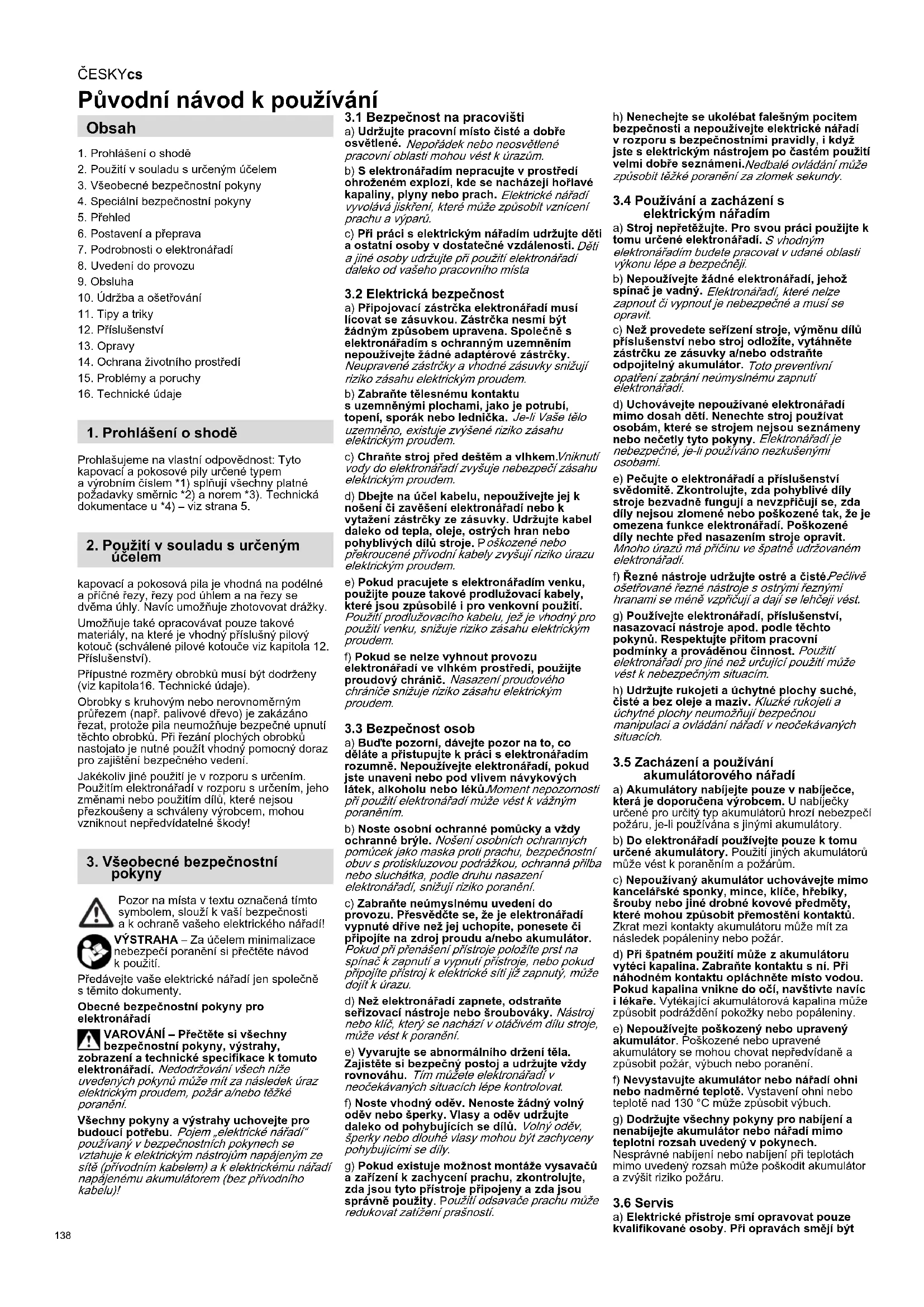 Původní návod k používání 1. Prohlášení o shodě2. Použití v souladu s určeným účelem3. Všeobecné bezpečnostní pokyny4. Speciální bezpečnostní pokyny5. Přehled6. Postavení a přeprava7. Podrobnosti o elektronářadí8. Uvedení do provozu9. Obsluha10. Údržba a ošetřování11. Tipy a triky12. Příslušenství13. Opravy14. Ochrana životního prostředí15. Problémy a poruchy16. Technické údajeProhlašujeme na vlastní odpovědnost: Tyto kapovací a pokosové pily určené typem a výrobním číslem *1) splňují všechny platné požadavky směrnic *2) a norem *3). Technická dokumentace u *4) – viz strana 5.kapovací a pokosová pila je vhodná na podélné a příčné řezy, řezy pod úhlem a na řezy se dvěma úhly. Navíc umožňuje zhotovovat drážky.Umožňuje také opracovávat pouze takové materiály, na které je vhodný příslušný pilový kotouč (schválené pilové kotouče viz kapitola 12. Příslušenství). Přípustné rozměry obrobků musí být dodrženy (viz kapitola16. Technické údaje). Obrobky s kruhovým nebo nerovnoměrným průřezem (např. palivové dřevo) je zakázáno řezat, protože pila neumožňuje bezpečné upnutí těchto obrobků. Při řezání plochých obrobků nastojato je nutné použít vhodný pomocný doraz pro zajištění bezpečného vedení. Jakékoliv jiné použití je v rozporu s určením. Použitím elektronářadí v rozporu s určením, jeho změnami nebo použitím dílů, které nejsou přezkoušeny a schváleny výrobcem, mohou vzniknout nepředvídatelné škody! Pozor na místa v textu označená tímto symbolem, slouží k vaší bezpečnosti a k ochraně vašeho elektrického nářadí!VÝSTRAHA – Za účelem minimalizace nebezpečí poranění si přečtěte návod k použití.Předávejte vaše elektrické nářadí jen společně s těmito dokumenty.Obecné bezpečnostní pokyny pro elektronářadíVAROVÁNÍ – Přečtěte si všechny bezpečnostní pokyny, výstrahy, zobrazení a technické specifikace k tomuto elektronářadí. Nedodržování všech níže uvedených pokynů může mít za následek úraz elektrickým proudem, požár a/nebo těžké poranění. Všechny pokyny a výstrahy uchovejte pro budoucí potřebu. Pojem „elektrické nářadí“ používaný v bezpečnostních pokynech se vztahuje k elektrickým nástrojům napájeným ze sítě (přívodním kabelem) a k elektrickému nářadí napájenému akumulátorem (bez přívodního kabelu)!