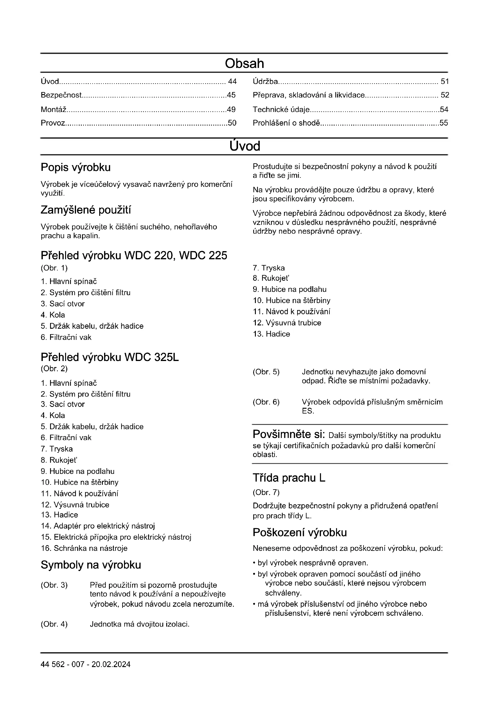 - Prohlášení oshodě Úvod Popis výrobku Výrobek je víceúčelový vysavač navržený pro komerční využití. Zamýšlené použití Výrobek používejte kčištění suchého, nehořlavého prachu akapalin. Prostudujte si bezpečnostní pokyny anávod kpoužití ařiďte se jimi. Na výrobku provádějte pouze údržbu aopravy, které jsou specifikovány výrobcem. Výrobce nepřebírá žádnou odpovědnost za škody, které vzniknou vdůsledku nesprávného použití, nesprávné údržby nebo nesprávné opravy. Přehled výrobku WDC 220, WDC 225 (Obr. 1) p. 55