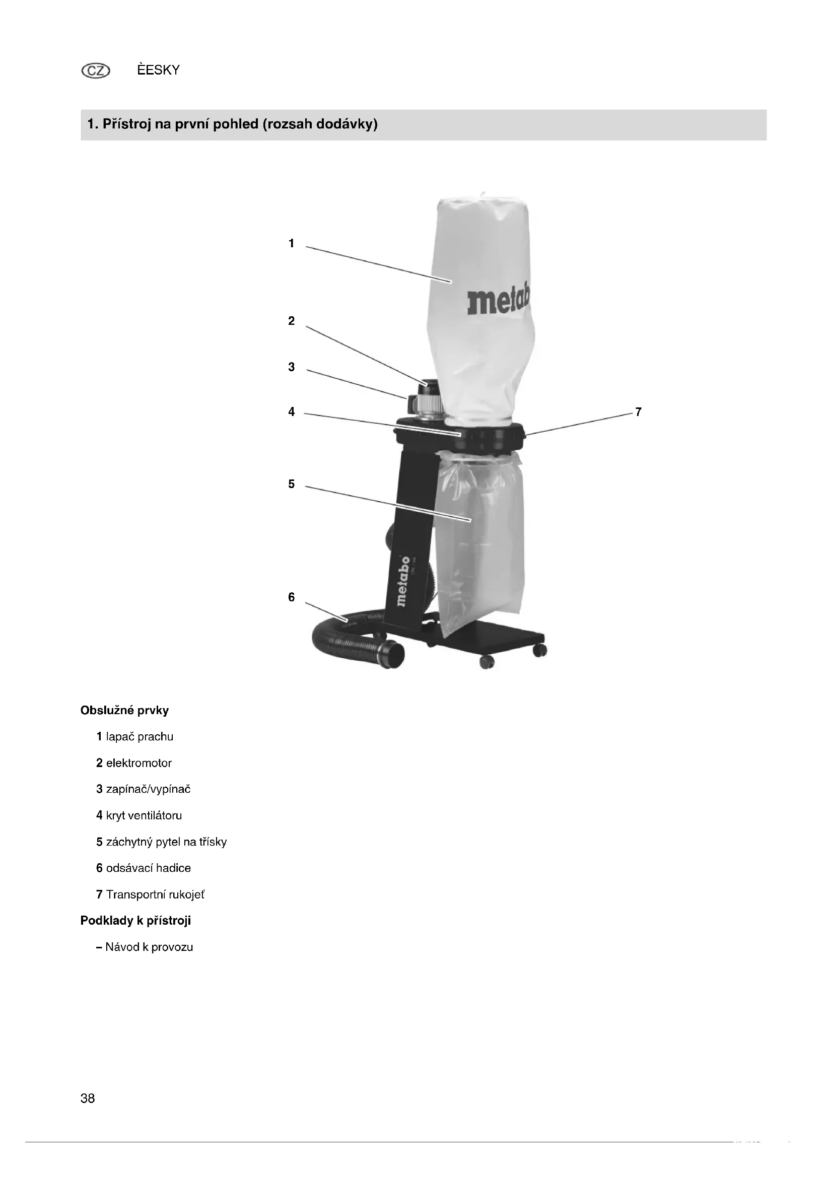 Obslužné prvky 1 lapač prachu 2 elektromotor 3 zapínač/vypínač 4 kryt ventilátoru 5 záchytný pytel na třísky 6 odsávací hadice 7 Transportní rukojeť Podklady k přístroji – Návod k provozu XW0019CZ1.fm Originální návod k osbluze Originální návod k osbluzeÈESKY