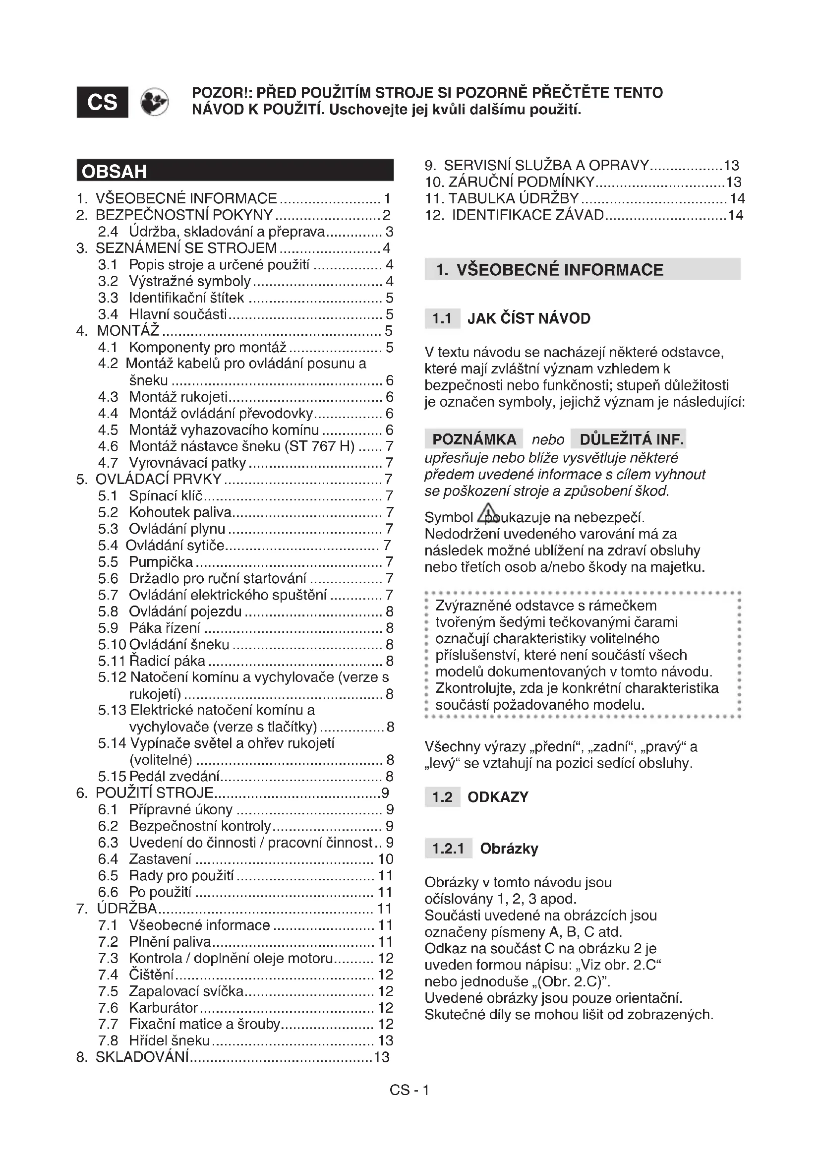 V textu návodu se nacházejí některé odstavce, které mají zvláštní význam vzhledem k bezpečnosti nebo funkčnosti; stupeň důležitosti je označen symboly, jejichž význam je následující: POZNÁMKA nebo DŮLEŽITÁ INF. upřesňuje nebo blíže vysvětluje některé předem uvedené informace s cílem vyhnout se poškození stroje a způsobení škod. Symbol poukazuje na nebezpečí. Nedodržení uvedeného varování má za následek možné ublížení na zdraví obsluhy nebo třetích osob a/nebo škody na majetku. Zvýrazněné odstavce s rámečkem tvořeným šedými tečkovanými čarami označují charakteristiky volitelného příslušenství, které není součástí všech modelů dokumentovaných v tomto návodu. Zkontrolujte, zda je konkrétní charakteristika součástí požadovaného modelu. Všechny výrazy „přední“, „zadní“, „pravý“ a „levý“ se vztahují na pozici sedící obsluhy.