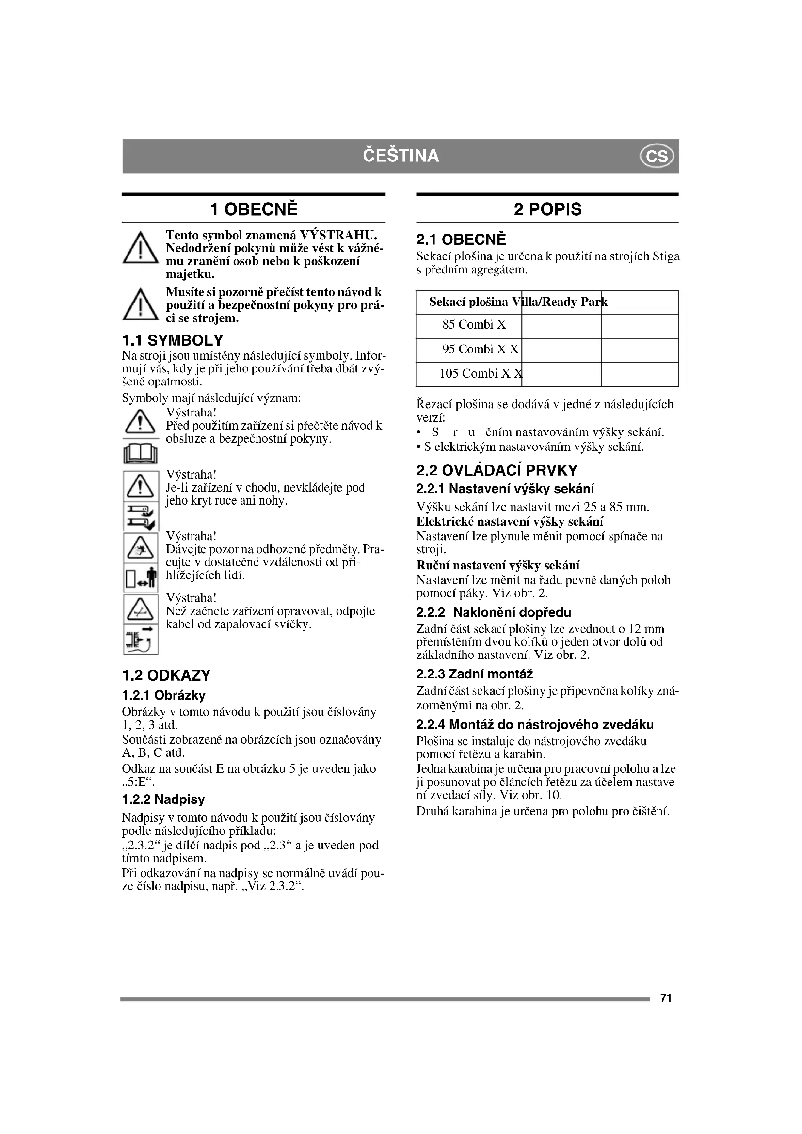 Plošina se instaluje do nástrojového zvedáku pomocí řetězu a karabin. Jedna karabina je určena pro pracovní polohu a lze ji posunovat po článcích řetězu za účelem nastave- ní zvedací síly. Viz obr. 10. Druhá karabina je určena pro polohu pro čištění. Sekací plošina Villa/Ready Park 85 Combi X 95 Combi X X 105 Combi X X72 ČEŠTINA