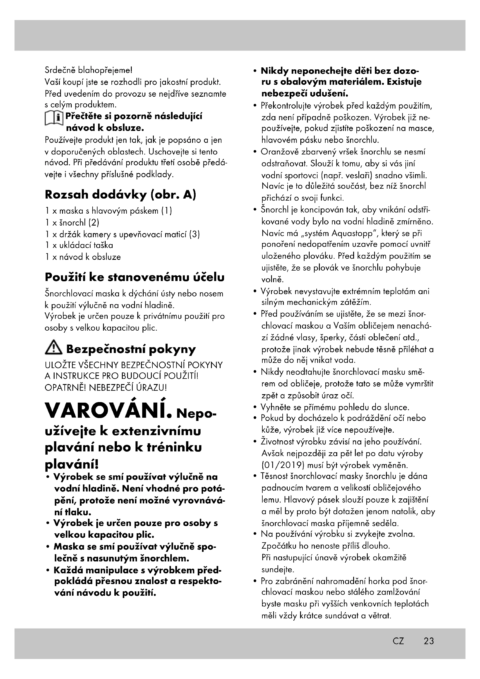 - DŮLEŽITÉ UPOZORNĚNÍ! Nikdy nečistěte agresivními čisticími prostředky. Pokyny k likvidaci Výrobek a obalový materiál likvidujte do odpa- du podle aktuálních místních předpisů. Obalový materiál, jako např. fóliové sáčky, nepatří do dětských rukou. Obalový materiál uchovávejte z dosahu dětí. Zlikvidujte produkty a balení ekologicky. Recyklační kód identifikuje různé materiály pro recyklaci. Kód se skládá z recyklačního symbolu - který indikuje recyklační cyklus - a čísla identifikujícího materiál. Pokyny k záruce a průběhu služby Produkt byl vyrobený s velkou pečlivostí a byl průběžně kontrolovaný ve výrobní procesu. Na tento produkt obdržíte tříroční záruku ode dne zakoupení. Uschovejte si pokladní stvrzenku. Záruka se vztahuje jen na vady materiálu a chyby z výroby, nevztahuje se na závady způso- bené neodborným zacházením nebo použitím k jinému účelu. Tato záruka neomezuje Vaše zákonná ani záruční práva. Při případných reklamacích se obraťte na dole uvedenou servisní horkou linku nebo nám zašlete email. Náš servisní pracovník s Vámi co nejrychleji upřesní další postup. V každém případě Vám osobně poradíme. Záruční doba se neprodlužuje po případných opravách v době záruky ani v případě zákon- ného ručení nebo kulance. Toto platí také pro náhradní a opravené díly. Opravy prováděné po vypršení záruční lhůty se platí. IAN: 310831 Servis Česko Tel.: 800143873 E-Mail: deltasport@lidl.cz26 SK Srdečne Vám blahoželáme! Vašou kúpou ste sa rozhodli pre vysokokvalitný produkt. Skôr než začnete produkt používať, dôkladne sa s ním oboznámte. K tomu si prečítajte tento návod na obsluhu. Produkt používajte v súlade s pokynmi uvede- nými v návode a na účely, na ktoré je produkt určený. Tento návod si odložte. Ak produkt odovzdáte tretej osobe, priložte jej tiež všetky podklady. Obsah balenia (obr. A) 1 x lícnica masky s popruhom (1) 1 x šnorchel (2) 1 x držadlo na kameru s upevňovacou maticou (3) 1 x taška na odkladanie 1 x návod na obsluhu Použitie podľa určenia Maska na šnorchlovanie na dýchanie ústami alebo nosom pre použitie výhradne na vodnej hladine. Výrobok je určený len pre súkromné použitie pre osoby s veľkou kapacitou pľúc. Bezpečnostné pokyny VŠETKY BEZPEČNOSTNÉ POKYNY A PREDPI- SY USCHOVAJTE DO BUDÚCNOSTI! POZOR! NEBEZPEČENSTVO PORANENIA! VÝSTRAHA. Nepou- žívajte na extenzívne pláva- nie alebo tréning v plávaní!