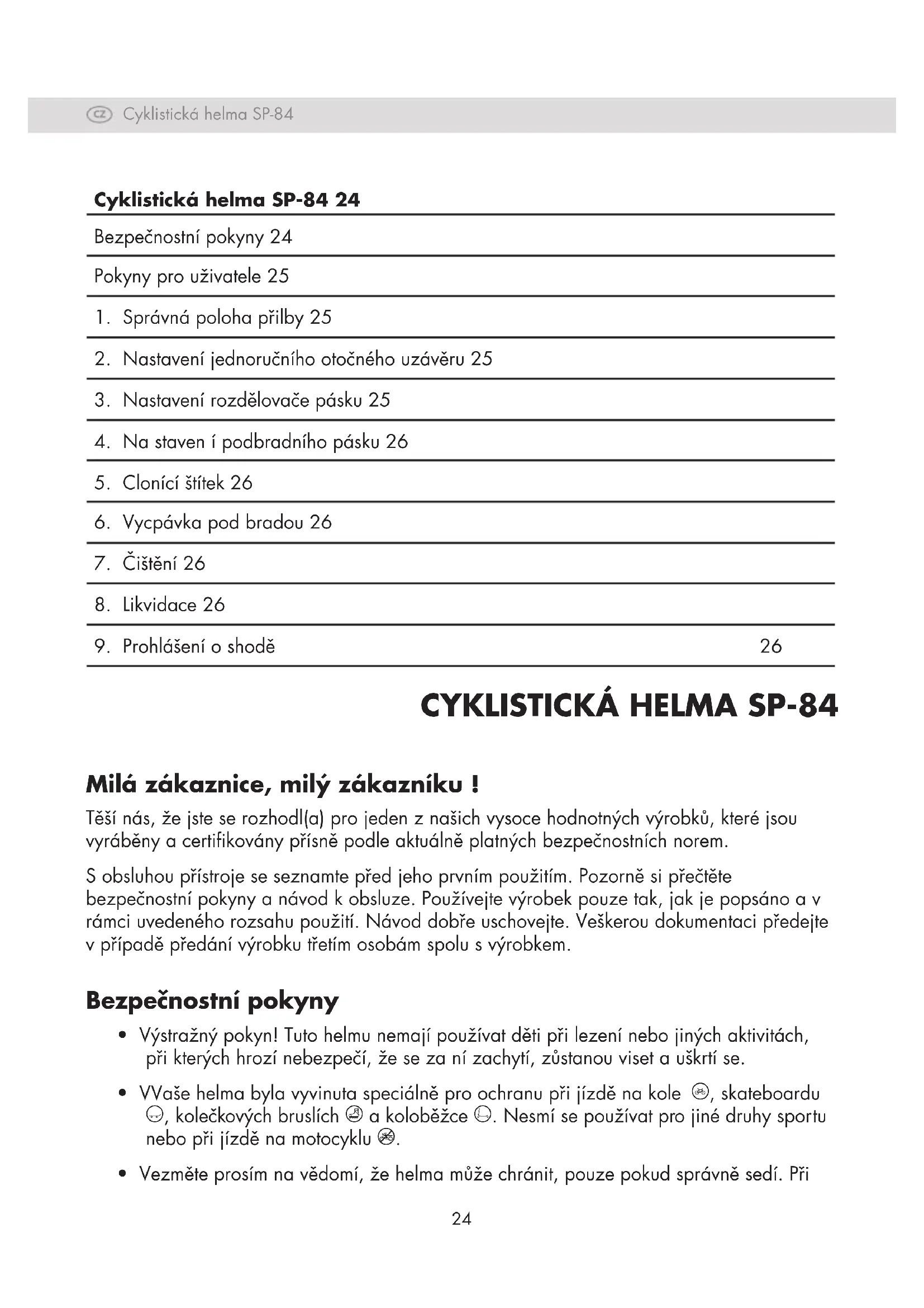 - Vezměte prosím na vědomí, že helma může chránit, pouze pokud správně sedí. Při Cyklistická helma SP-84 24 Bezpečnostní pokyny 24 Pokyny pro uživatele 25