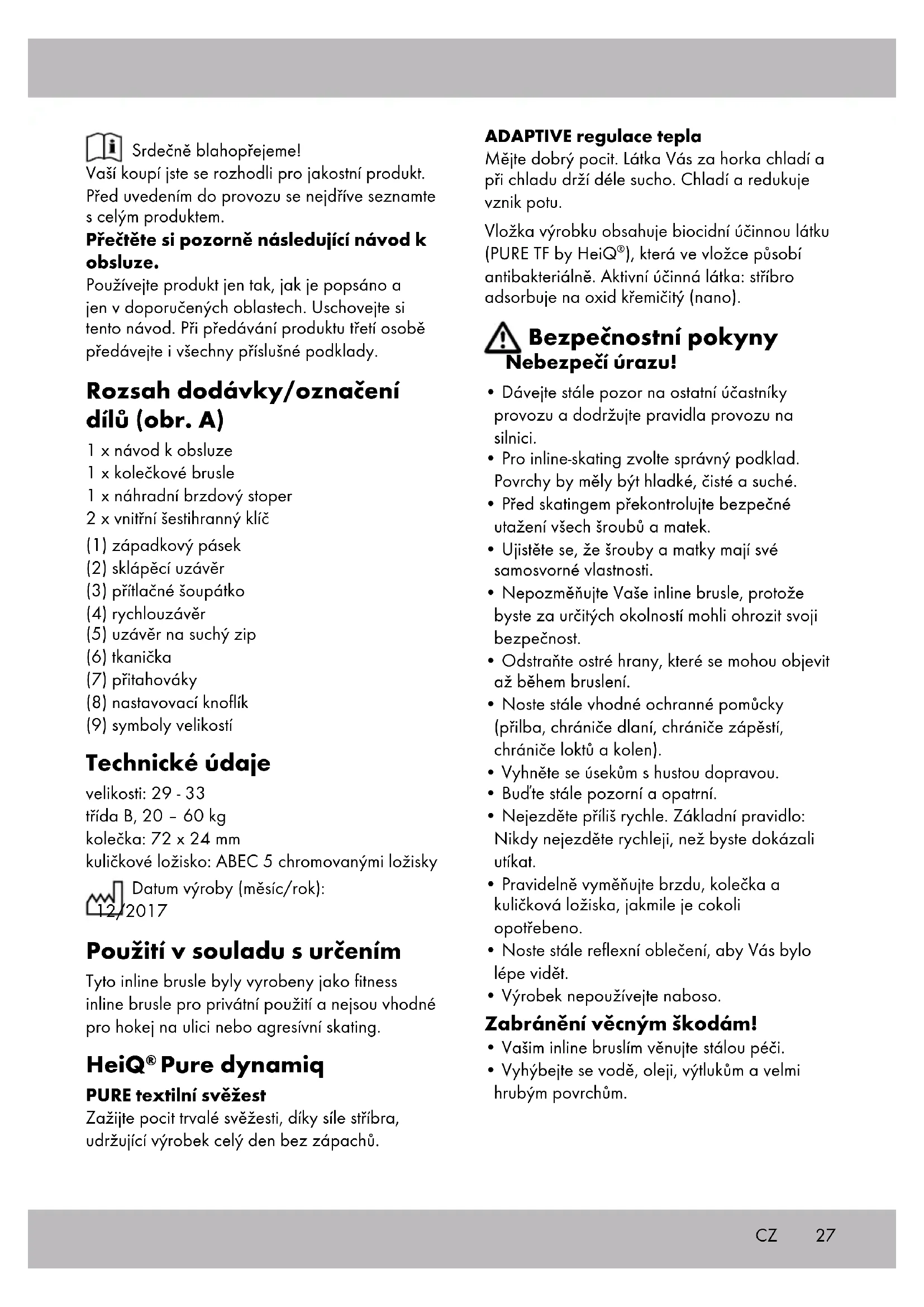 - Ložiska jsou zpravidla uzavřena a zevnitř je nelze mazat. Opotřebená kuličková ložiska musí být vyměněna.31CZ Pokyny k záruce a průběhu služby Produkt byl vyrobený s velkou pečlivostí a byl průběžně kontrolovaný ve výrobní procesu. Na tento produkt obdržíte tříroční záruku ode dne zakoupení. Uschovejte si pokladní stvrzenku. Záruka se vztahuje jen na vady materiálu a chyby z výroby, nevztahuje se na závady způsobené neodborným zacházením nebo použitím k jinému účelu. Tato záruka neomezuje Vaše zákonná ani záruční práva. Při případných reklamacích se obraťte na dole uvedenou servisní horkou linku nebo nám zašlete email. Náš servisní pracovník s Vámi co nej- rychleji upřesní další postup. V každém případě Vám osobně poradíme. Záruční doba se neprodlužuje po případných opravách v době záruky ani v případě zákon- ného ručení nebo kulance. Toto platí také pro náhradní a opravené díly. Opravy prováděné po vypršení záruční lhůty se platí. IAN: 292781 Servis Česko Tel.: 800143873 E-Mail: deltasport@lidl.cz32 HeiQ