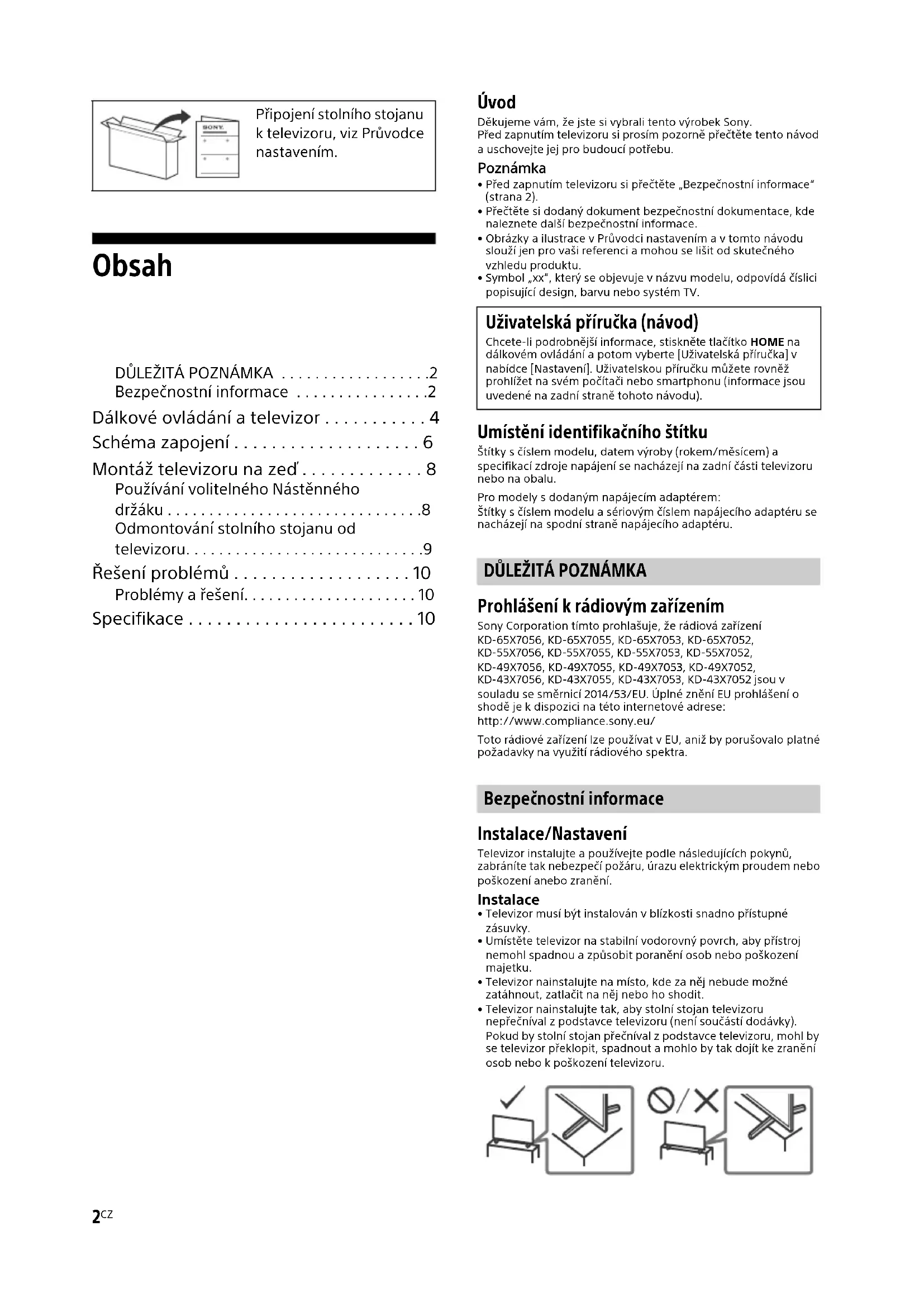 Prohlášení k rádiovým zařízením Sony Corporation tímto prohlašuje, že rádiová zařízení KD-65X7056, KD-65X7055, KD-65X7053, KD-65X7052, KD-55X7056, KD-55X7055, KD-55X7053, KD-55X7052, KD-49X7056, KD-49X7055, KD-49X7053, KD-49X7052, KD-43X7056, KD-43X7055, KD-43X7053, KD-43X7052 jsou v souladu se směrnicí 2014/53/EU. Úplné znění EU prohlášení o shodě je k dispozici na této internetové adrese: http://www.compliance.sony.eu/Toto rádiové zařízení lze používat v EU, aniž by porušovalo platné požadavky na využití rádiového spektra. Bezpečnostní informace Instalace/Nastavení Televizor instalujte a používejte podle následujících pokynů, zabráníte tak nebezpečí požáru, úrazu elektrickým proudem nebo poškození anebo zranění. Instalace