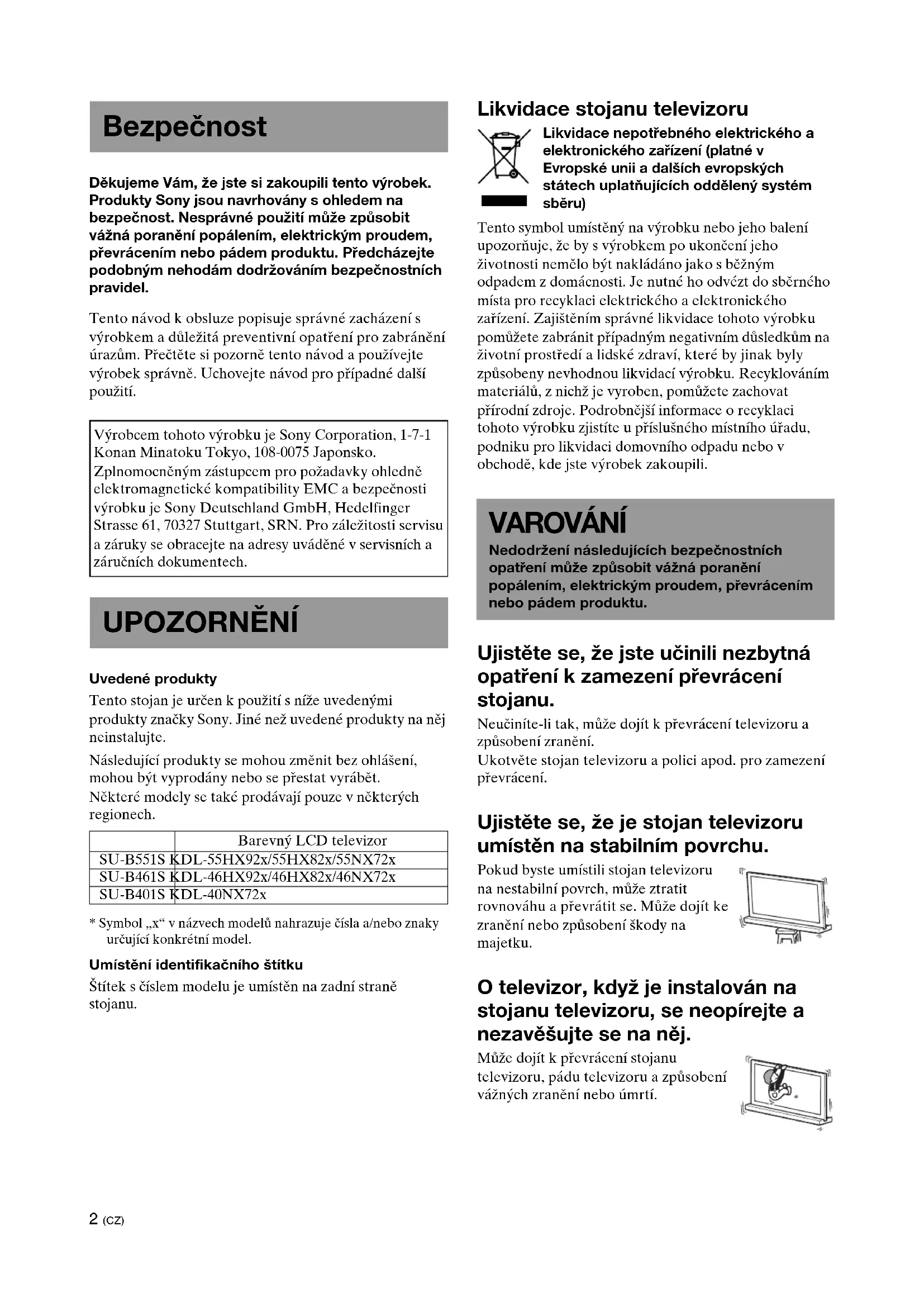 - Symbol „x“ v názvech modelů nahrazuje čísla a/nebo znaky určující konkrétní model. Umístění identifikačního štítku Štítek s číslem modelu je umístěn na zadní straně stojanu. Likvidace stojanu televizoru Likvidace nepotřebného elektrického a elektronického zařízení (platné v Evropské unii a dalších evropských státech uplatňujících oddělený systém sběru) Tento symbol umístěný na výrobku nebo jeho balení upozorňuje, že by s výrobkem po ukončení jeho životnosti nemělo být nakládáno jako s běžným odpadem z domácnosti. Je nutné ho odvézt do sběrného místa pro recyklaci elektrického a elektronického zařízení. Zajištěním správné likvidace tohoto výrobku pomůžete zabránit případným negativním důsledkům na životní prostředí a lidské zdraví, které by jinak byly způsobeny nevhodnou likvidací výrobku. Recyklováním materiálů, z nichž je vyroben, pomůžete zachovat přírodní zdroje. Podrobnější informace o recyklaci tohoto výrobku zjistíte u příslušného místního úřadu, podniku pro likvidaci domovního odpadu nebo v obchodě, kde jste výrobek zakoupili. Ujistěte se, že jste učinili nezbytná opatření k zamezení převrácení stojanu. Neučiníte-li tak, může dojít k převrácení televizoru a způsobení zranění. Ukotvěte stojan televizoru a polici apod. pro zamezení převrácení. Ujistěte se, že je stojan televizoru umístěn na stabilním povrchu. Pokud byste umístili stojan televizoru na nestabilní povrch, může ztratit rovnováhu a převrátit se. Může dojít ke zranění nebo způsobení škody na majetku. O televizor, když je instalován na stojanu televizoru, se neopírejte a nezavěšujte se na něj. Může dojít k převrácení stojanu televizoru, pádu televizoru a způsobení vážných zranění nebo úmrtí. Bezpečnost Výrobcem tohoto výrobku je Sony Corporation, 1-7-1 Konan Minatoku Tokyo, 108-0075 Japonsko. Zplnomocněným zástupcem pro požadavky ohledně elektromagnetické kompatibility EMC a bezpečnosti výrobku je Sony Deutschland GmbH, Hedelfinger Strasse 61, 70327 Stuttgart, SRN. Pro záležitosti servisu a záruky se obracejte na adresy uváděné v servisních a záručních dokumentech. UPOZORNĚNÍ Barevný LCD televizor SU-B551S KDL-55HX92x/55HX82x/55NX72x SU-B461S KDL-46HX92x/46HX82x/46NX72x SU-B401S KDL-40NX72x VAROVÁNÍ Nedodržení následujících bezpečnostních opatření může způsobit vážná poranění popálením, elektrickým proudem, převrácením nebo pádem produktu.3 (CZ) Nezakrývejte ventilační otvory televizoru. Větrací otvory v televizoru jsou nezbytné pro zajištění spolehlivého fungování televizoru a chrání jej před přehřátím.