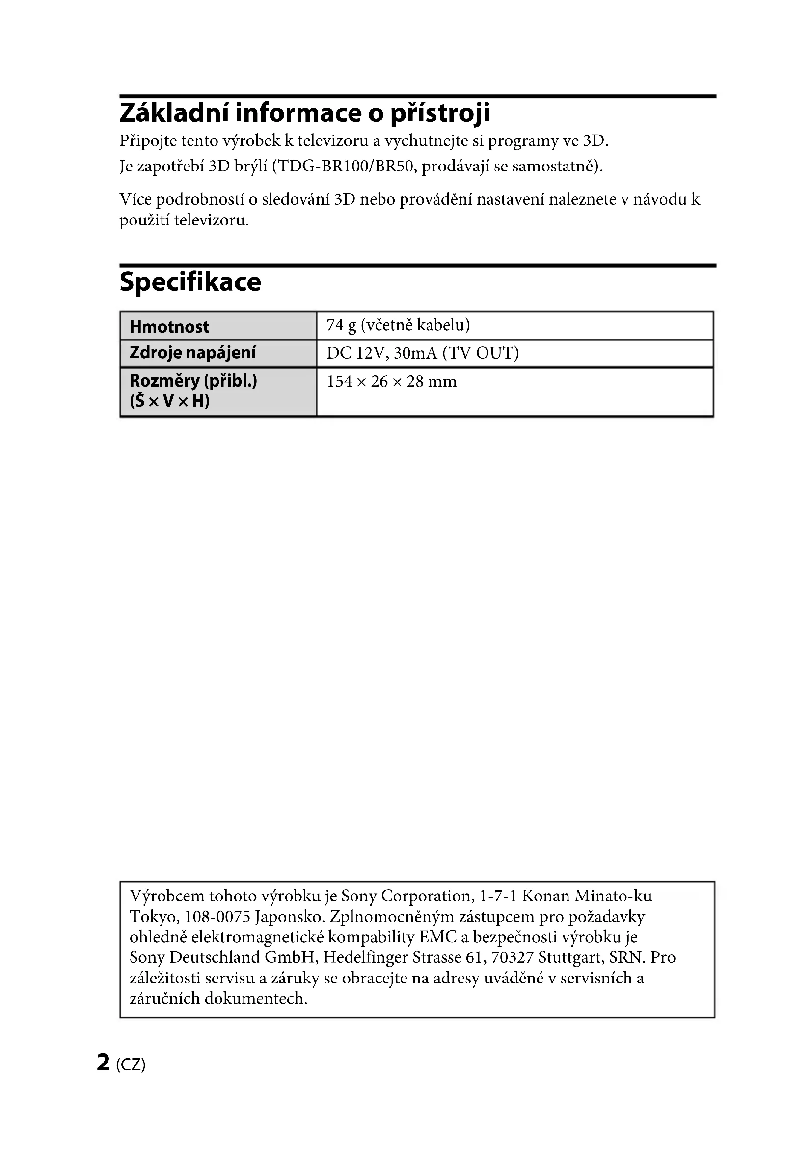 (Pokračování)TMR-BR100 4-180-471-26(1) 6 (CZ) TMR-BR100 4-180-471-26(1) 120˚ Když je televizor umístěn na skříňce nebo na stole: Umístěte 3D Synchronizční vysílač doprostřed televizoru, podél předního okraje stolního stojanu nebo stojanu televizoru. 120˚ Pokud je televizor umístěn na zdi, upevněte 3D Synchronizční vysílač k televizoru (nahoře uprostřed nebo dole napravo od středu) pomocí oboustranné lepicí pásky. Nastavte úhel 3D Synchronizčního vysílače podle způsobu instalace. +10˚ –10˚ 120˚ 120˚ 120˚TMR-BR100 4-180-471-26(1) TMR-BR100 4-180-471-26(1) 7 (CZ) Komunikační dosah 3D Synchronizčního vysílače a 3D brýlí Umístěte 3D Synchronizční vysílač před televizor a zajistěte, aby mezi 3D Synchronizčním vysílačem a 3D brýlemi nebyly žádné překážky. 120˚ 1 m ~ 6 m typické 1 m ~ 6 m typické 120˚ Pohled shora Pohled z boku Připojení Vypněte televizor a připojte 3D Synchronizční vysílač ke konektoru 3D SYNC na televizoru. Zapněte televizor a zkontrolujte, zda se v seznamu nabídky OPTIONS nachází nabídka 3D. Televizor je nutné jednou vypnout, aby rozpoznal 3D synchronizační vysílač. Informace o sledování 3D obrazu naleznete v návodu k obsluze televizoru. Odstraňování problémů V případě potíží použijte uživatelskou příručku televizoru.TMR-BR100 4-180-471-26(1) 2 (SK) TMR-BR100 4-180-471-26(1) Prehľad produktu Pripojte tento výrobok k televízoru, aby ste mohli sledovať obraz v 3D. Vyžadujú sa 3D okuliare (TDG-BR100/BR50, predávajú sa osobitne). Podrobné informácie o 3D zobrazení a o nastavení nájdete v návode na používanie televízora. Technické parametre Hmotnosť 74 g (vrátane kábla) Napájanie 12 V jedn., 30mA (TV OUT) Rozmery (približne) (š × v × h) 154 × 26 × 28 mm Výrobcom tohoto výrobku je Sony Corporation, 1-7-1 Konan Minato-ku, Tokyo, 108-0075 Japonsko. Autorizovaným zástupcom pre EMC a bezpečnosť výrobku je Sony Deutschland GmbH, Hedelfinger Strasse 61, 70327 Stuttgart, Nemecko. V akýchkoľvek servisných alebo záručných záležitostiach prosím kontaktujte adresy uvedené v separátnych servisných alebo záručných dokumentoch.TMR-BR100 4-180-471-26(1) TMR-BR100 4-180-471-26(1) 3 (SK)