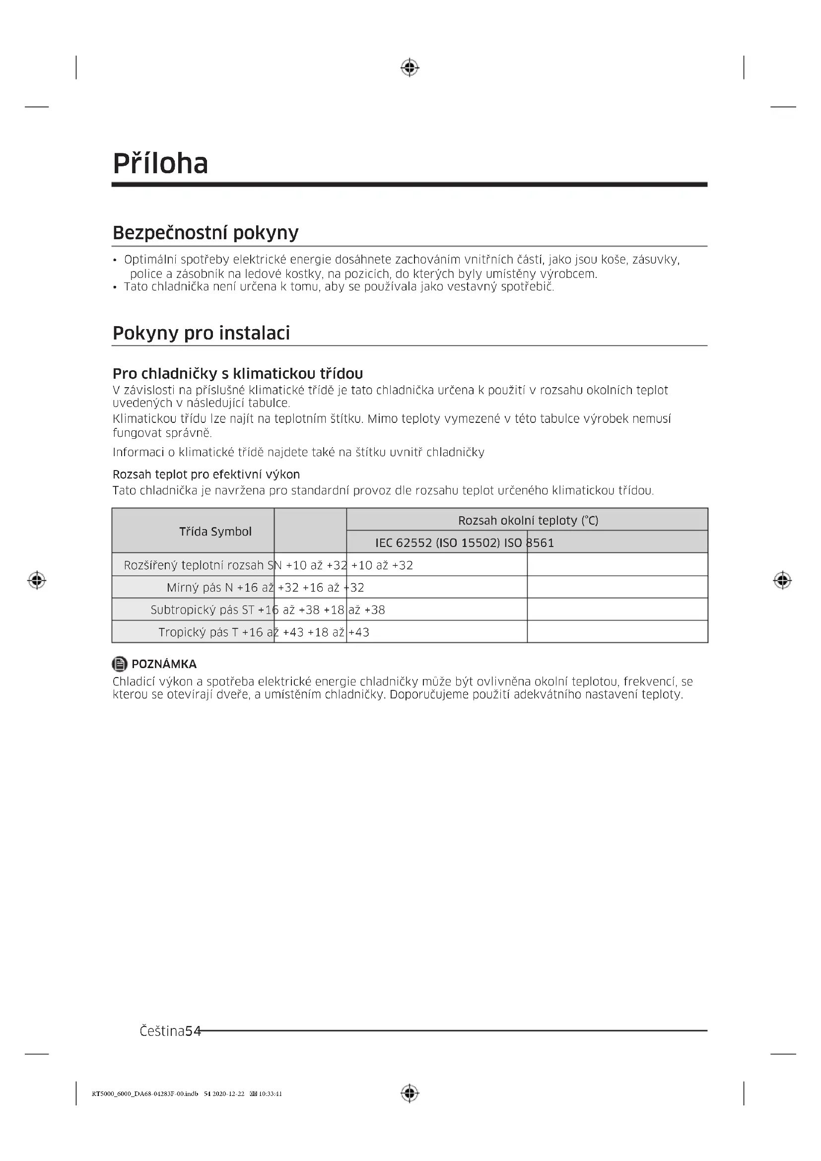 Rozšířený teplotní rozsah SN +10 až +32 +10 až +32 Mírný pás N +16 až +32 +16 až +32 Subtropický pás ST +16 až +38 +18 až +38 Tropický pás T +16 až +43 +18 až +43 POZNÁMKA Chladicí výkon a spotřeba elektrické energie chladničky může být ovlivněna okolní teplotou, frekvencí, se kterou se otevírají dveře, a umístěním chladničky. Doporučujeme použití adekvátního nastavení teploty. RT5000_6000_DA68-04283F-00.indb 54 2020-12-22 10:33:41Čeština 55 Pokyny ohledně teploty Doporučená teplota Optimální nastavení teploty pro skladování potravin: