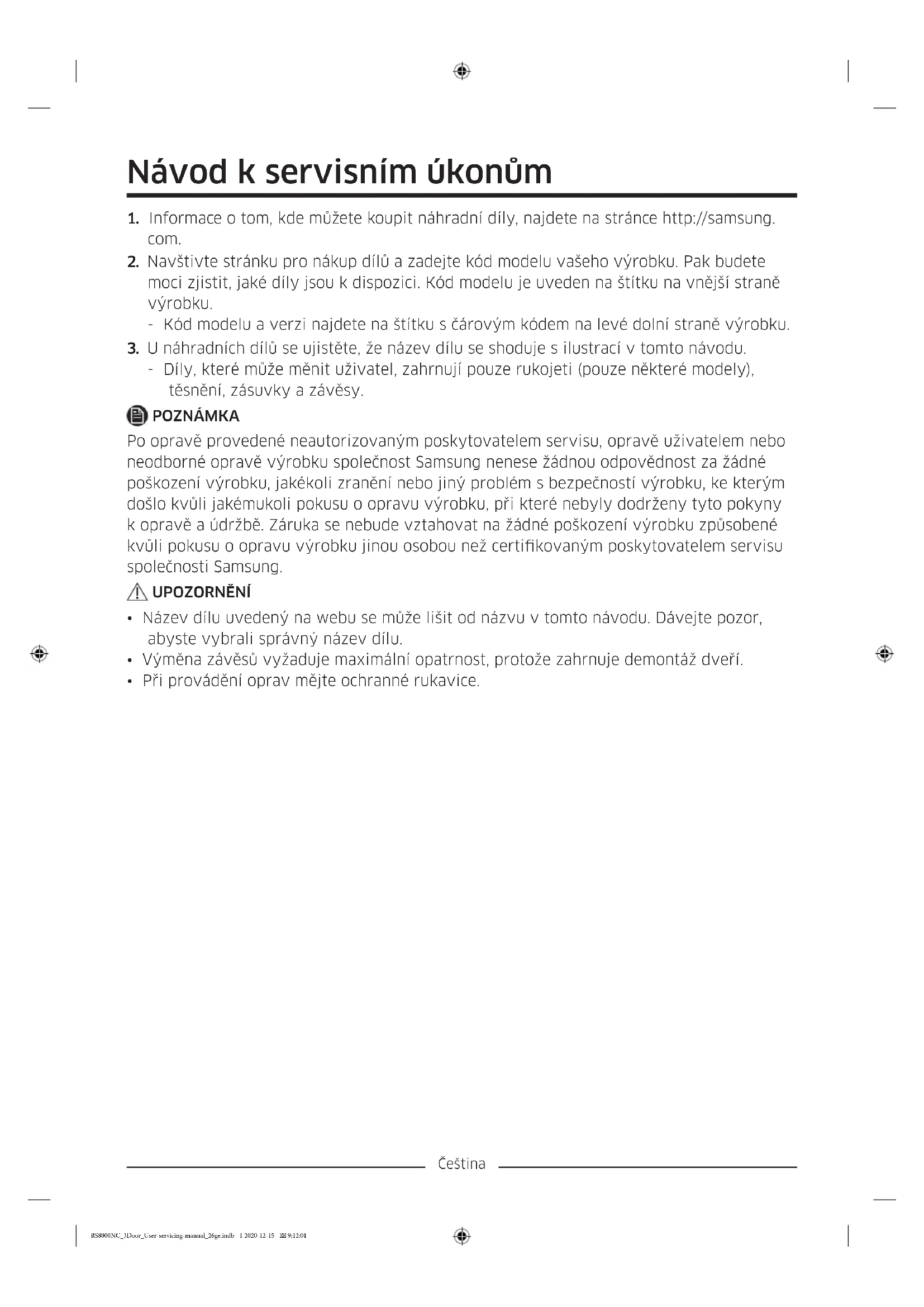- Při provádění oprav mějte ochranné rukavice. RS8000NC_3Door_User-servicing-manual_26ge.indb 1 2020-12-15 9:12:01Čeština Skutečný vzhled a součásti chladničky se mohou od obrázku v závislosti na modelu a zemi, ve které se nacházíte, lišit.
