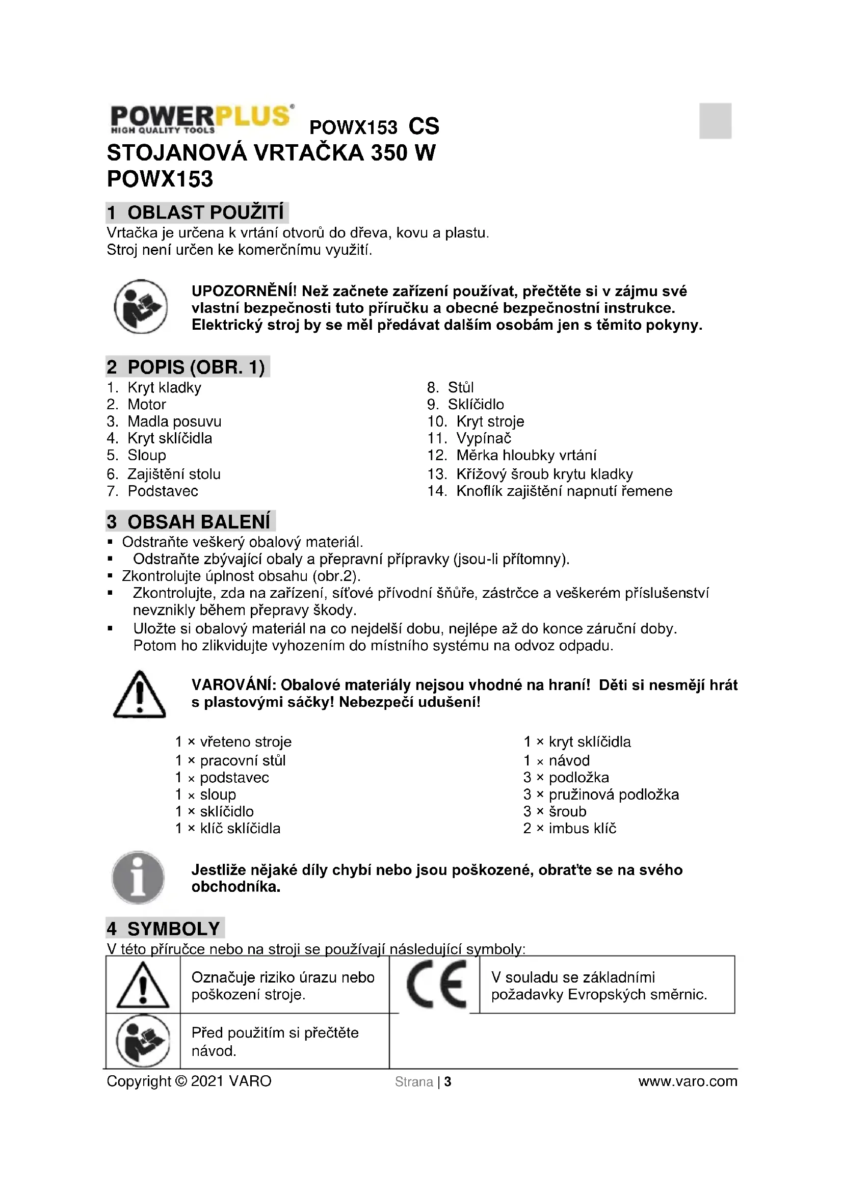 Před použitím si přečtěte návod.POWX153 CS Copyright © 2021 VARO Strana | 4 www.varo.com 5 OBECNÁ BEZPEČNOSTNÍ UPOZORNĚNÍ PRO ELEKTRICKÉ STROJE Přečtěte si všechna bezpečnostní upozornění a všechny pokyny. Nedodržení upozornění a pokynů může vést k zasažení elektrickým proudem, požáru nebo vážnému úrazu. Uschovejte si upozornění a pokyny, abyste do nich mohli později nahlédnout. Termín „elektrický stroj“ v upozorněních znamená elektrický stroj připojený (kabelem) k síti nebo elektrický stroj provozovaný (bez kabelu) na baterii.