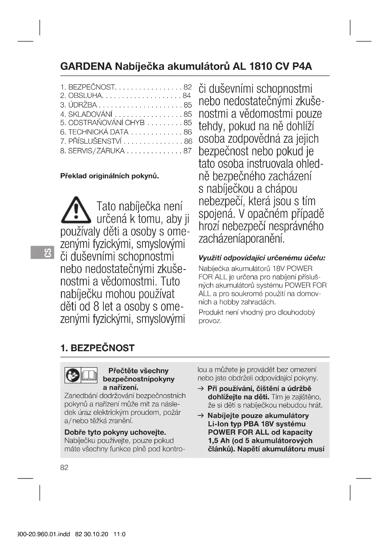 Překlad originálních pokynů. Tato nabíječka není určená k tomu, aby ji používaly děti a osoby s ome- zenými fyzickými, smyslovými či duševními schopnostmi nebo nedostatečnými zkuše- nostmi a vědomostmi. Tuto nabíječku mohou používat děti od 8 let a osoby s ome- zenými fyzickými, smyslovými či duševními schopnostmi nebo nedostatečnými zkuše- nostmi a vědomostmi pouze tehdy, pokud na ně dohlíží osoba zodpovědná za jejich bezpečnost nebo pokud je tato osoba instruovala ohled- ně bezpečného zacházení s nabíječkou a chápou nebezpečí, která jsou s tím spojená. V opačném případě hrozí nebezpečí nesprávného za chá zení a poranění. Využití odpovídající určenému účelu: Nabíječka akumulátorů 18V POWER FOR ALL je určena pro nabíjení přísluš- ných akumulátorů systému POWER FOR ALL a pro soukromé použití na domov- ních a hobby zahradách. Produkt není vhodný pro dlouhodobý provoz. 14900-20.960.01.indd 82 30.10.20 11:08CS