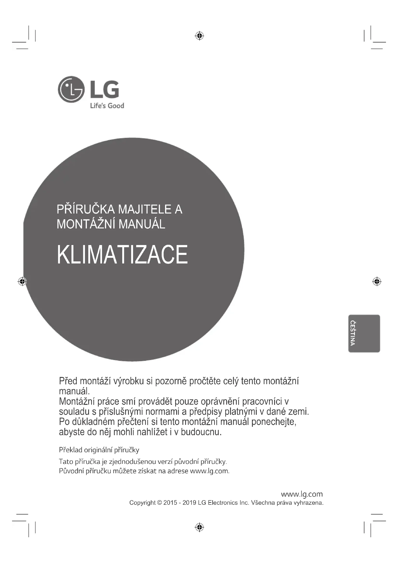 Překlad originální příručky Tato příručka je zjednodušenou verzí původní příručky. Původní příručku můžete získat na adrese www.lg.com. Copyright © 2015 - 2019 LG Electronics Inc. Všechna práva vyhrazena. KLIMATIZACE www.lg.com Před montáží výrobku si pozorně pročtěte celý tento montážní manuál. Montážní práce smí provádět pouze oprávnění pracovníci v souladu s příslušnými normami a předpisy platnými v dané zemi. Po důkladném přečtení si tento montážní manuál ponechejte, abyste do něj mohli nahlížet i v budoucnu. ČEŠTINA2