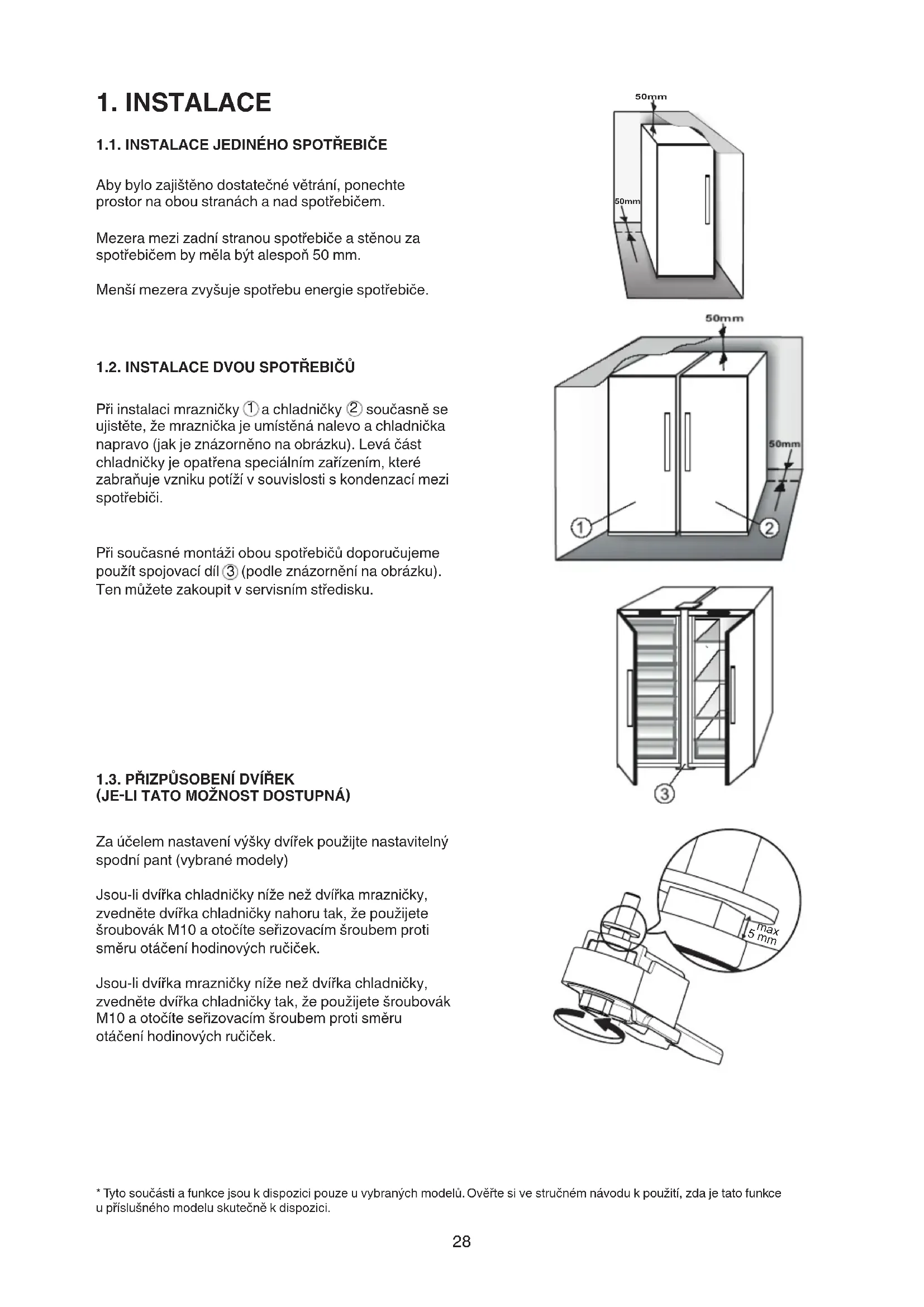 (JE-LI TATO MOŽNOST DOSTUPNÁ) Zaúčelemnastavenívýškydvířekpoužijtenastavitelný spodnípant(vybranémodely) Jsou-lidvířkachladničkyníženeždvířkamrazničky, zvednětedvířkachladničkynahorutak,žepoužijete šroubovákM10aotočíteseřizovacímšroubemproti směruotáčeníhodinovýchručiček. Jsou-lidvířkamrazničkyníženeždvířkachladničky, zvednětedvířkachladničkytak,žepoužijetešroubovák M10aotočíteseřizovacímšroubemprotisměru otáčeníhodinovýchručiček. *Tytosoučástiafunkcejsoukdispozicipouzeuvybranýchmodelů.Ověřtesivestručnémnávodukpoužití,zdajetatofunkce upříslušnéhomodeluskutečněkdispozici. 50mm 50mm 5 mm max29