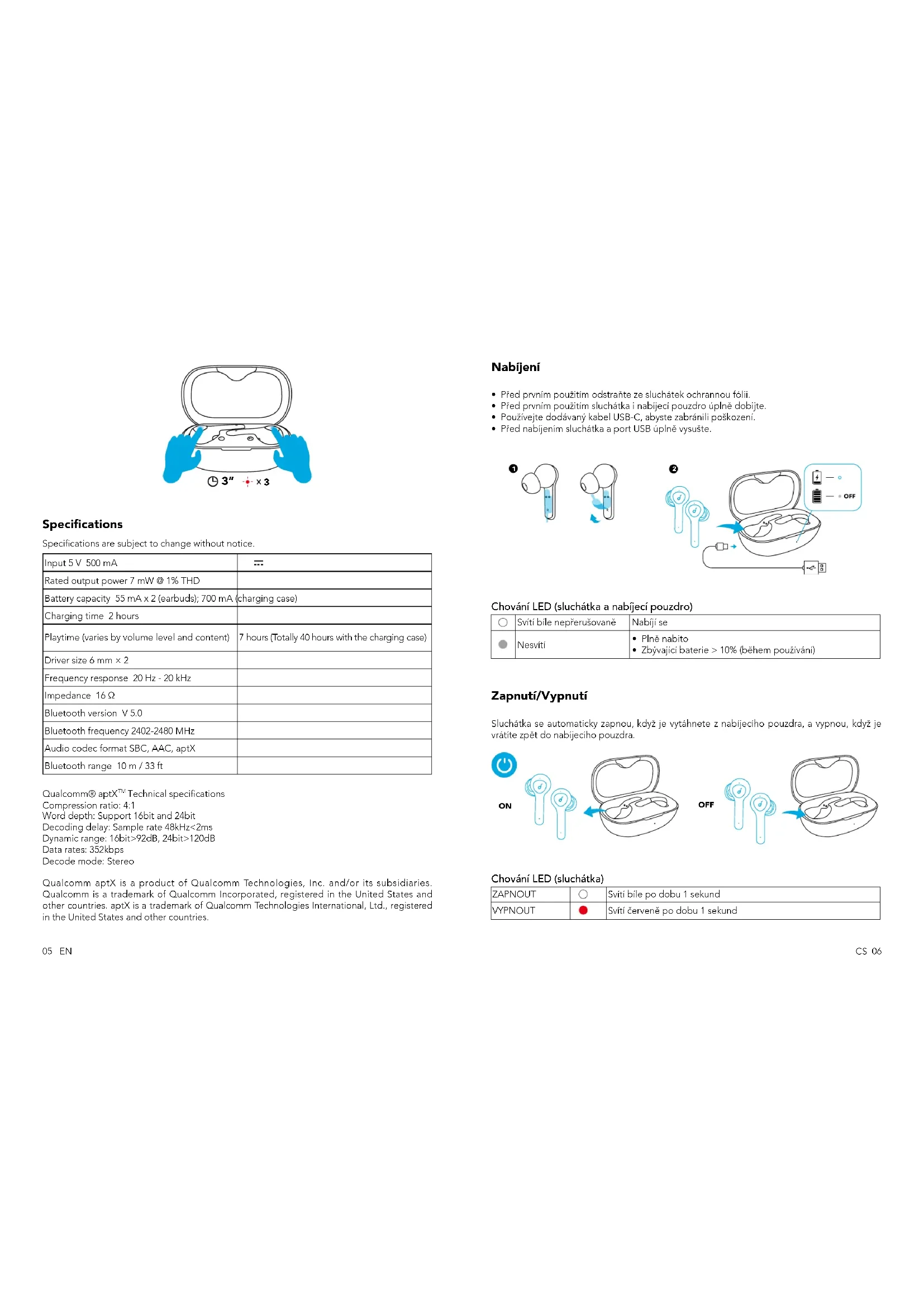 OFF Chování LED (sluchátka) ZAPNOUT Svítí bíle po dobu 1 sekund VYPNOUT Svítí červeně po dobu 1 sekund07 CS CS 08