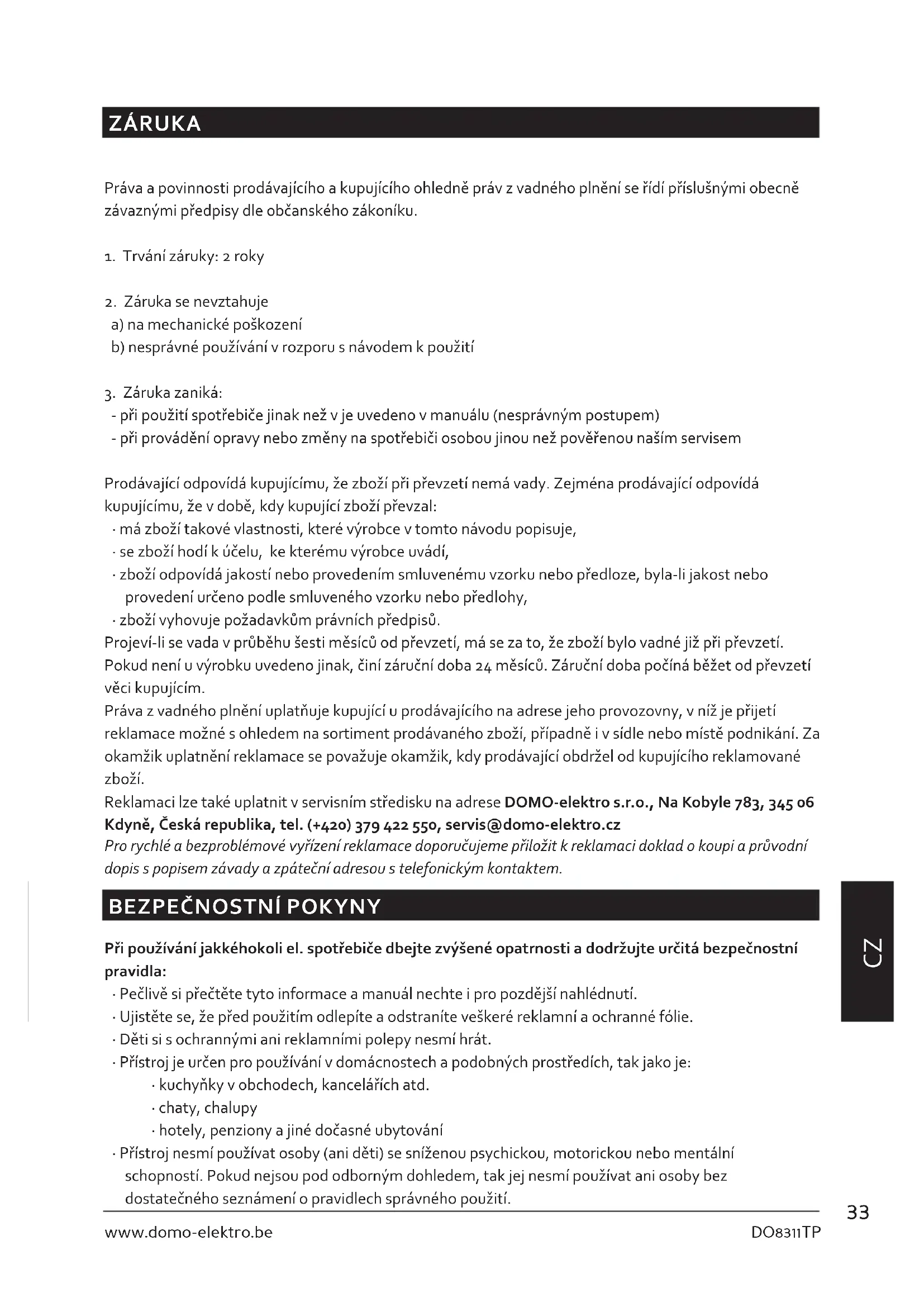 - zboží vyhovuje požadavkům právních předpisů. Projeví-li se vada v průběhu šesti měsíců od převzetí, má se za to, že zboží bylo vadné již při převzetí. Pokud není u výrobku uvedeno jinak, činí záruční doba 24 měsíců. Záruční doba počíná běžet od převzetí věci kupujícím. Práva z vadného plnění uplatňuje kupující u prodávajícího na adrese jeho provozovny, v níž je přijetí reklamace možné s ohledem na sortiment prodávaného zboží, případně i v sídle nebo místě podnikání. Za okamžik uplatnění reklamace se považuje okamžik, kdy prodávající obdržel od kupujícího reklamované zboží. Reklamaci lze také uplatnit v servisním středisku na adrese DOMO-elektro s.r.o., Na Kobyle 783, 345 06 Kdyně, Česká republika, tel. (+420) 379 422 550, servis@domo-elektro.cz Pro rychlé a bezproblémové vyřízení reklamace doporučujeme přiložit k reklamaci doklad o koupi a průvodní dopis s popisem závady a zpáteční adresou s telefonickým kontaktem.