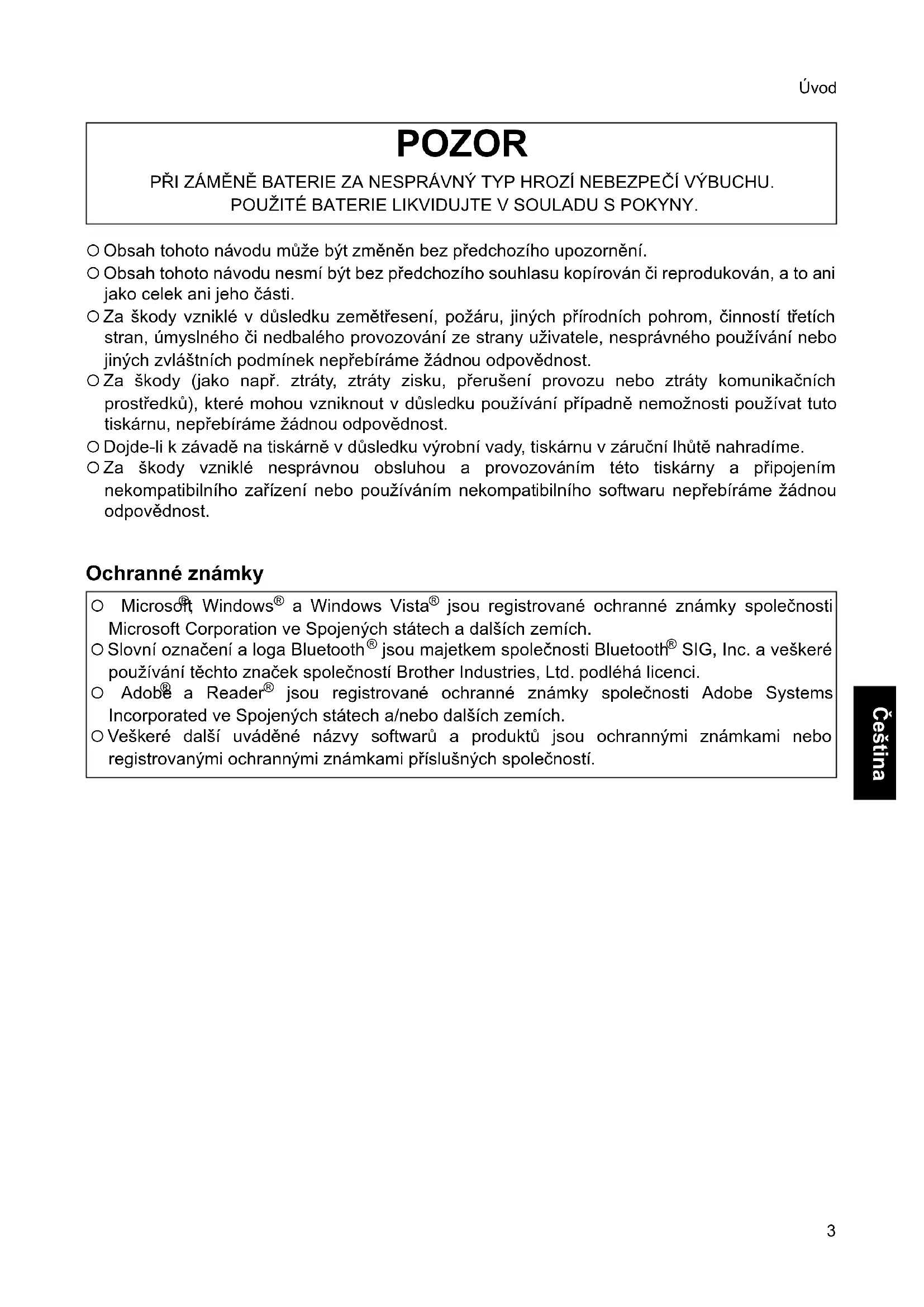 Čeština { Obsah tohoto návodu může být změněn bez předchozího upozornění. { Obsah tohoto návodu nesmí být bez předchozího souhlasu kopírován či reprodukován, a to ani jako celek ani jeho části. { Za škody vzniklé v důsledku zemětřesení, požáru, jiných přírodních pohrom, činností třetích stran, úmyslného či nedbalého provozování ze strany uživatele, nesprávného používání nebo jiných zvláštních podmínek nepřebíráme žádnou odpovědnost. { Za škody (jako např. ztráty, ztráty zisku, přerušení provozu nebo ztráty komunikačních prostředků), které mohou vzniknout v důsledku používání případně nemožnosti používat tuto tiskárnu, nepřebíráme žádnou odpovědnost. { Dojde-li k závadě na tiskárně v důsledku výrobní vady, tiskárnu v záruční lhůtě nahradíme. { Za škody vzniklé nesprávnou obsluhou a provozováním této tiskárny a připojením nekompatibilního zařízení nebo používáním nekompatibilního softwaru nepřebíráme žádnou odpovědnost. Ochranné známky POZOR PŘI ZÁMĚNĚ BATERIE ZA NESPRÁVNÝ TYP HROZÍ NEBEZPEČÍ VÝBUCHU. POUŽITÉ BATERIE LIKVIDUJTE V SOULADU S POKYNY. { Microsoft